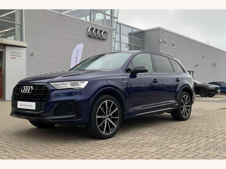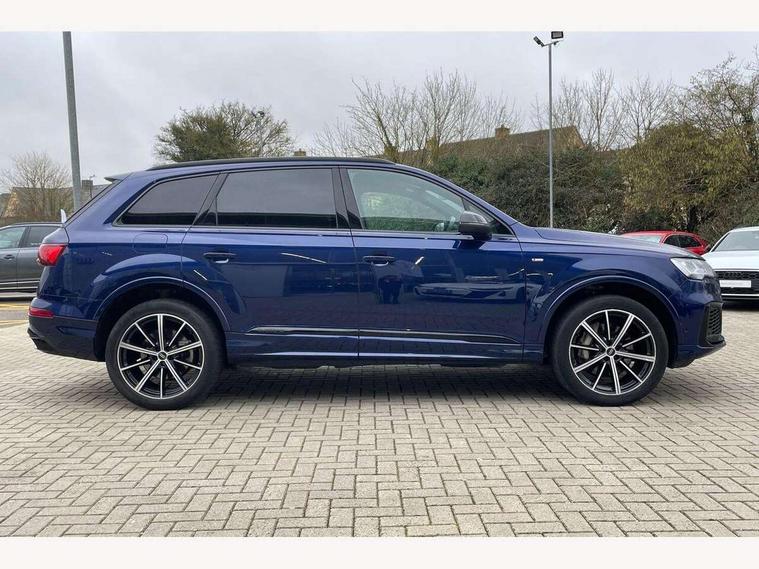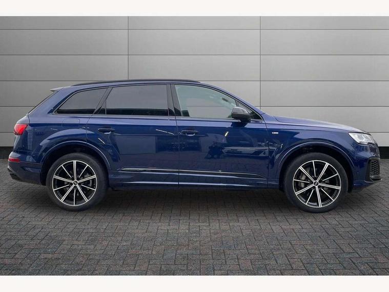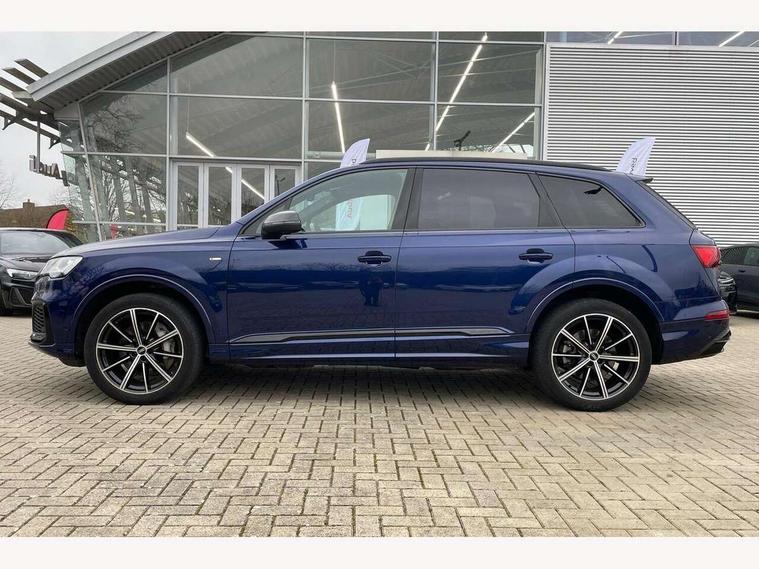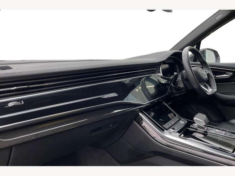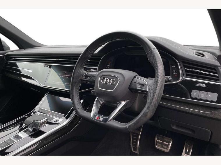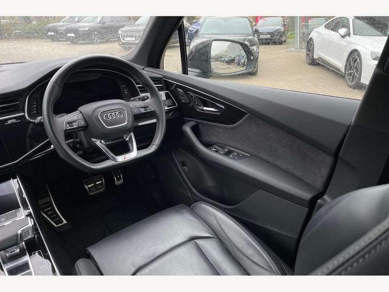 Audi connect safety and service (e-call), Audi connect with Amazon Alexa Integration, Audi drive select (Auto, Comfort, Dynamic, Efficiency, Individual, Off-road and All road), Bluetooth interface, Camera based traffic sign recognition, Electromechanical steering, MMI navigation plus with MMI touch screens includes 10.1" and 8.6" screens with haptic feedback, Natural voice recognition, Parking system plus with 360 degree display (front, rear and side sensors) - acoustic and visual park assist system, Power operated tailgate, Rear view camera, Smartphone interface includes wireless Apple carplay/Android Auto, Start/stop system, 48V Mild hybrid technology, 85 litre fuel tank, Adaptive air sports suspension, Quattro all wheel drive with self locking centre differential, Audi music interface - front 2 USB-C ports with charger and data functions, Audi sound system with 6 channel amplifier, 180 watt amplifying capacity and 10 loudspeakers including subwoofer, DAB digital radio module, 3rd brake light, Audi matrix LED headlights with dynamic front and rear indicators, Auto dimming frameless rear view mirror, Black roof rails, Bumpers in contrast paint scandium grey finish includes door trim and wheel arch trim strips, inlays in door strip contain quattro embossing, Electrically adj heated/folding + automatically dimming exterior mirrors with memory + automatic kerb side function for passenger side exterior mirror, Heat insulating glass in windshield, Integrated LED indications in door mirrors, LED daytime running lights, LED rear tail lights, Privacy glass - dark tinted rear and rear side windows from B-pillar backwards, Rear side wing doors, Rear wiper, 2 seat bench in 3rd row, 3 seat bench in 2nd row, 4 zone deluxe automatic climate control, 7 seat layout with ISOFIX points for the front passenger seat and rear passenger seat, Black cloth headlining, Comfort front centre armrest, Electric adjustable front seat with 4 way lumbar support, driver memory functionality, Folding rear seats, Front head restraints, Front/rear floor mats, Heated front seats, Illuminated door sill trims with S logo, LED interior ambient lighting, Luggage compartment cover, Luggage compartment sill protection in stainless steel, Rear head restraints, Single front passenger seat, Stainless steel pedals, Sunvisors with illuminated vanity mirrors, Titanium black styling pack - Q7/SQ7, 3 point seatbelts on all rear seats, Audi pre sense front, Child locks on rear doors, Driver and front passenger, front side and curtain airbags, Electromechanical parking brake, Electronic Stabilisation Control (ESC) including ABS, ASR and EDL, Extended pedestrian protection measures, Hill hold assist, Seatbelt monitoring, Tyre pressure loss indicator, Warning triangle and first aid kit, Anti theft alarm, Anti-theft wheel bolts and wheel loosening detection, Keyless Go, Remote central locking, Polished oak trim with grey finish inlay, Tool kit, Tyre repair kit,