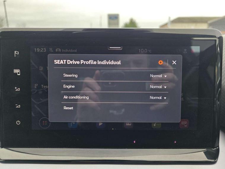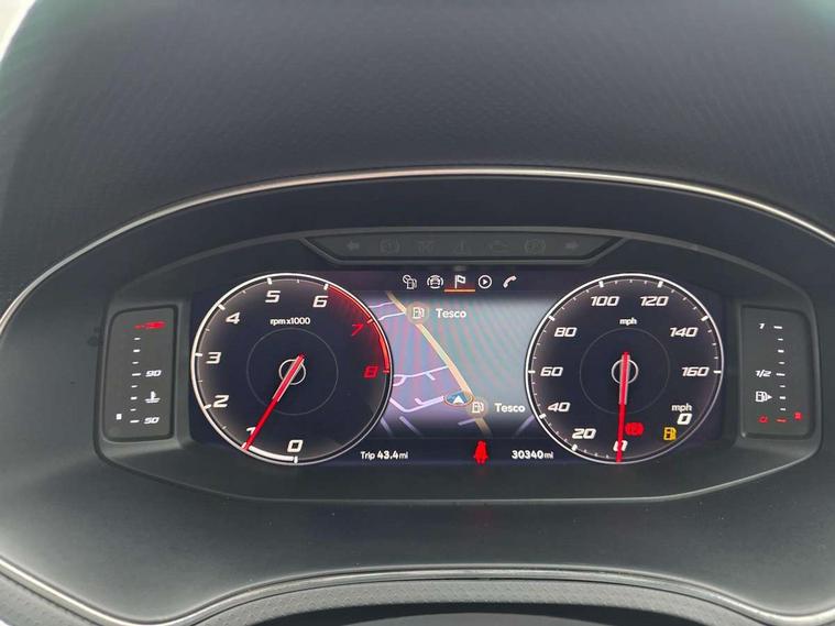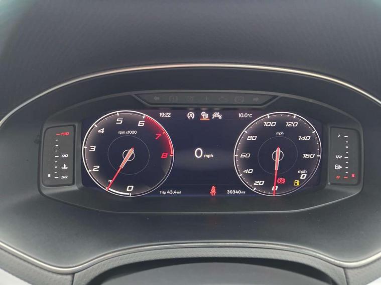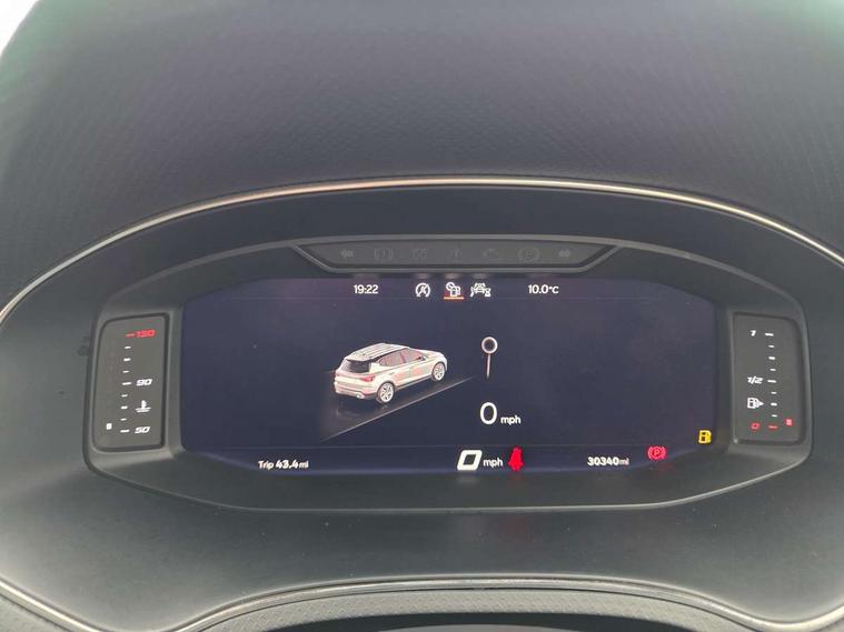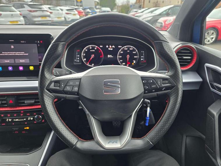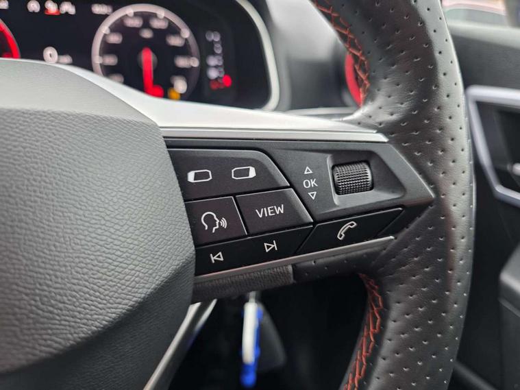 'Lights On' Reminder warning buzzer, 10" Digital cockpit, Digital clock, E-call, Electric speed sensitive power steering, Full Link Smartphone Integration with Mirror Link, Apple Car Play, Google Android Auto with USB Type C cable for Apple and Android compatibility, Low fuel warning light, Outside temperature display, Rear parking sensor, RPM counter, Seat connect with safety, service, remote and online, SEAT Drive profile - Four different models normal-sport-eco-individual, steering response, throttle response, Trip computer, Wireless phone charger, 9.2" colour touchscreen with navigation system, voice control and USB port (type c), Bluetooth interface for hands free and audio streaming, DAB digital radio and AM/FM radio, Steering wheel mounted audio controls, Anti theft roof antenna, Auto dimming interior rear view mirror, Automatic activation of hazard warning lights, Body coloured bumpers, Body coloured door handle inserts, Chrome roof rails and window surrounds, Dark tinted rear windows, Electric front/rear windows, Electrically adjustable, heated and folding door mirrors, Front fog lights with cornering function and rear fog light, FULL LED automatic headlights with dynamic headlight range control, coming and leaving home, LED daytime running lights, LED rear tail lights and licence plate lights, Protective side mouldings, Rain sensing wipers, Rear side wing doors, Rear spoiler, Rear window wash/wipe, Roof colour door mirrors, Third brake light, Twin exhaust pipe styling hidden exhaust pipe, Visible VIN plate, Windshield wiper with intermittent control and potentiometer, 2 cupholders, 3 seat bench in 2nd row, 60/40 split folding rear seat, Aircare filter, Black interior roof, Double boot floor, Driver sunvisor with covered mirror + card holder, Dual zone climate control, Front comfort seats, Front courtesy light with front and rear reading lights, Front seat back storage pockets, Gear shift indicator, Heated front seats, Height adjustable front seats, Height/reach adjustable steering column, Illuminated boot, Instrument lighting with brightness control, Interior ambient lighting, Interior light in footwell, central console and door panel, ISOFIX points in outer rear seats with top tether anchorage points, Microsuede cloth upholstery, Passenger sunvisor with vanity mirror, Perforated flat bottomed leather steering wheel/gear knob/handbrake with red stitching and FR logo, Single front passenger seat, Two front and three rear height adjustable headrests, Interior chrome pack - Arona, 3 point seatbelts on all rear seats, ABS, Active front headrests, Child locks on rear doors, Driver and front passenger airbags with front passenger airbag de activation, front side and curtain airbags, Electronic stability control, Emergency Brake Assist (EBA) and front assist, Front and rear seatbelt reminder, Hill hold control, Multi-Collision braking, Tiredness recognition system, Traction control, Tyre pressure monitoring system, Alarm with back-up horn, Electronic engine immobiliser, Locking wheel bolts, Remote central locking + deadlocks, Tow away protection, Titan black dashboard, 18" Performance Cosmo grey matt alloy wheels,