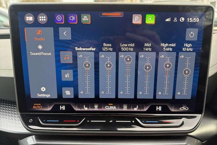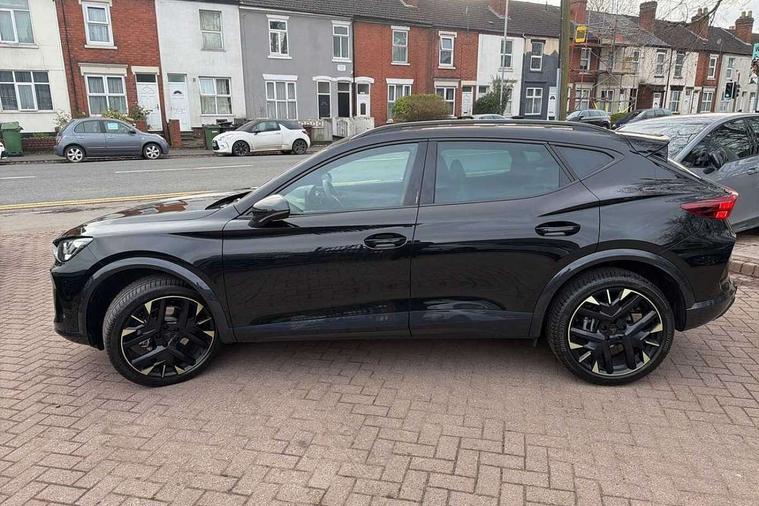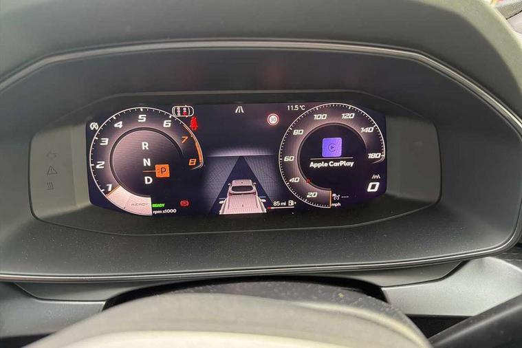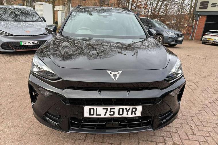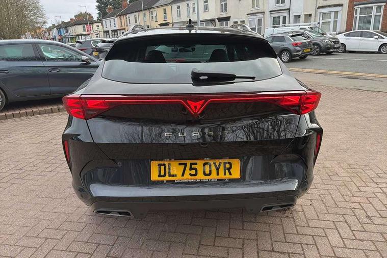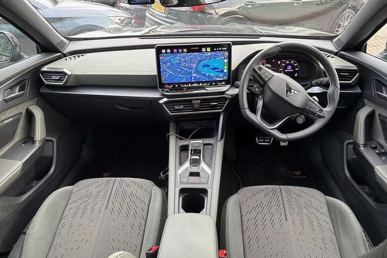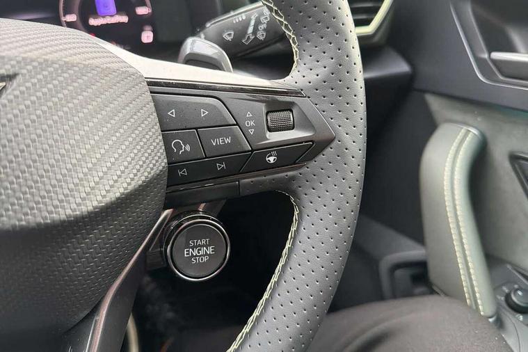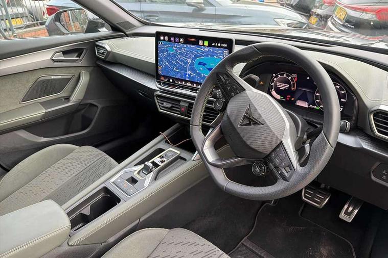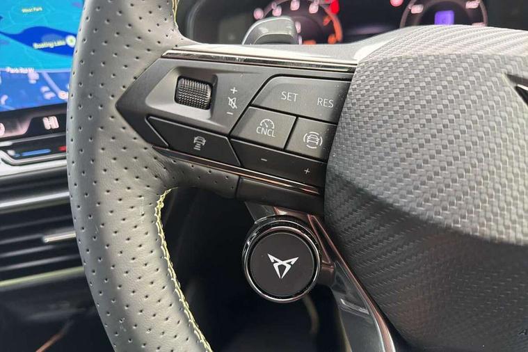 10.25" digital cockpit and configurable dashboard, Adaptive cruise control with follow-to-stop and speed limiter, Driver alert system, Driving profile selection, Dynamic road sign display, Emergency steering support with turn assist, Forward collision warning with automatic braking, Front and rear parking sensors, Front cross traffic assist, Full link phone integration, Lane assist, Progressive steering, Rear view camera, RPM, trip computer, outside temp gauge, instrument light brightness, low fuel warning light, lights on reminder, gearshift indicator, Service interval indicator, Start/stop system with regenerative braking, Virtual pedal and electric tailgate, Voice control system, Wired Android Auto, Wireless apple carplay, Wireless phone charger, CUPRA sport suspension, Electronic locking differential and dynamic traction support, 2 front and 2 rear USB type C sockets, Immersive by Sennheiser TM - 10 speakers, 1 central speaker, 1 subwoofer, Media system with navigation, 12.9" touchscreen display, voice control, DAB, steering wheel mounted controls, Auto dimming rear view mirror, Body colour door handles, Body coloured bumpers, Dark grey wing mirror, Daytime running lights with automatic headlight control and Coming and Leaving home function, Door panel ambient lighting, Dynamic headlight range control, Electric front/rear windows, Electrically adjustable heated and folding door mirrors with memory function, Gloss black roof rails and window surrounds, High beam assist, LED 3rd brake light, LED front fog lamps with cornering function, LED Headlights, LED Taillights with dynamic indicator, Rain sensing wipers, Rear diffuser with black simulated exhaust pipes, Rear fog lights, Rear side wing doors, Rear wash/wipe, Tinted rear windows, Welcome lights (within exterior mirror housing), 12V socket, 2 front and 2 rear reading lights, 3 seat bench in 2nd row, 3D Knitted cloth/dinamica upholstery + bucket seats, 60/40 split rear bench seat with armrest and mechanical seat release, Black headlining, Cupra sports pedals, Dark aluminium pedals, Dust/pollen filter, Electrically adjustable front seats with lumbar support and memory function, Front and rear head restraints, Front centre armrest, Heated front seats, Heated supersports multifunction leather steering wheel with satellite buttons and gear shift paddles, Height/reach adjust steering wheel, Illuminated aluminium doorsteps, Illuminated interior front door sills, Illuminated sunvisor with mirror, Isofix, Leather dashboard, door insert and side trim panel, LED smart wraparound lighting, Single front passenger seat, Storage pockets on rear of front seats, Three zone climate control with control panel in rear, Variable luggage/load compartment floor, 3 point seatbelts on all rear seats, ABS, Brake control system - ESC and brake booster, Child proof door locks, Driver and front passenger airbags with front passenger airbag de-activation, Electronic parking brake, Front and rear disc brakes, Front side curtain airbags, Hill hold control, Public e-call, Seat belt reminder for front and rear seats, Tyre pressure monitoring system, Anti theft alarm system, KESSY Advanced - Keyless start, keyless entry with SAFELOCK, Locking wheel bolts, Warranty - 5 years/90, 000 miles, Copper and aluminium interior detailing, 19" Recycled aluminium alloy wheels in black and sulphur green, Space saver spare wheel,