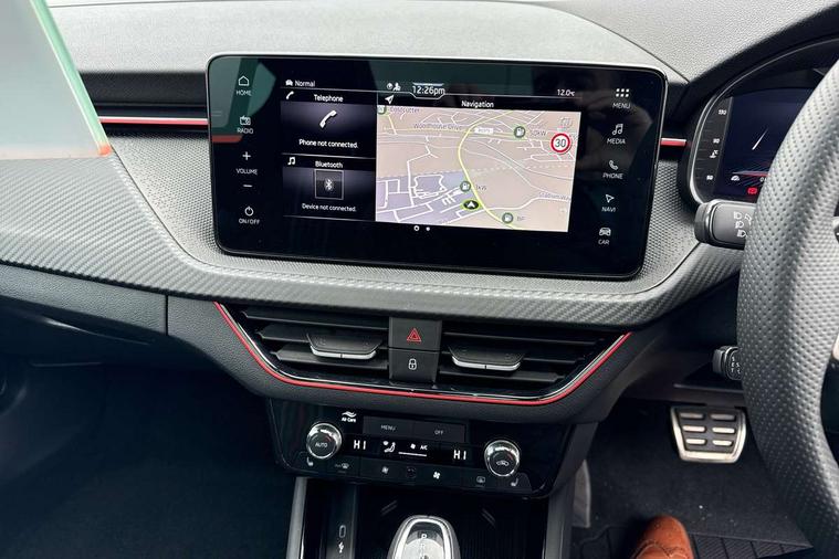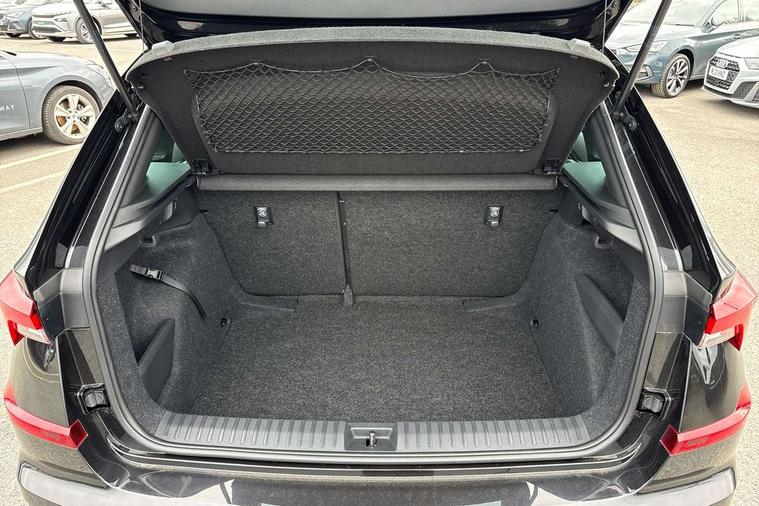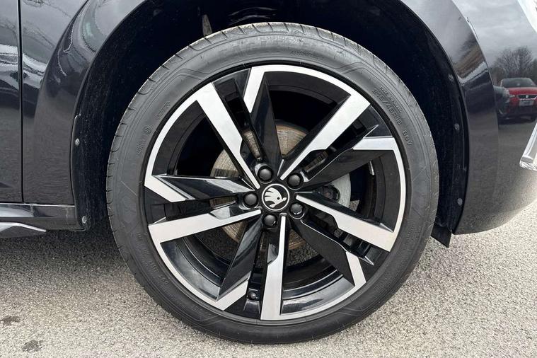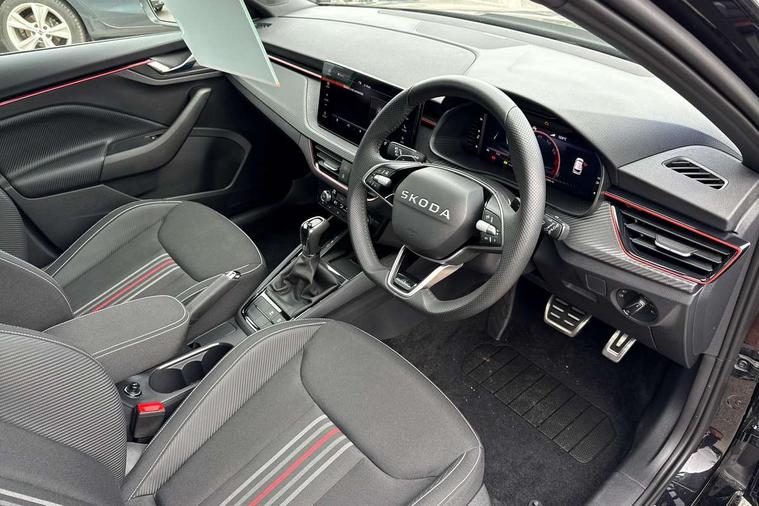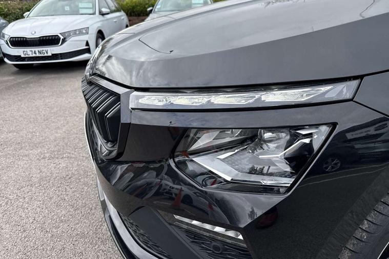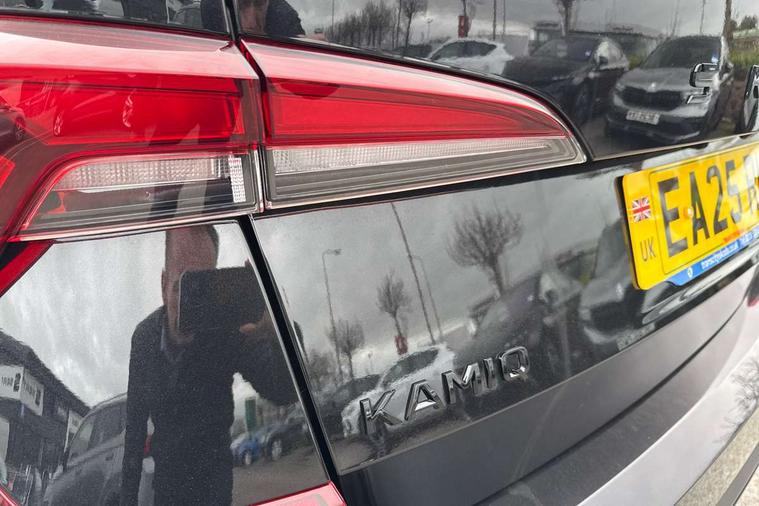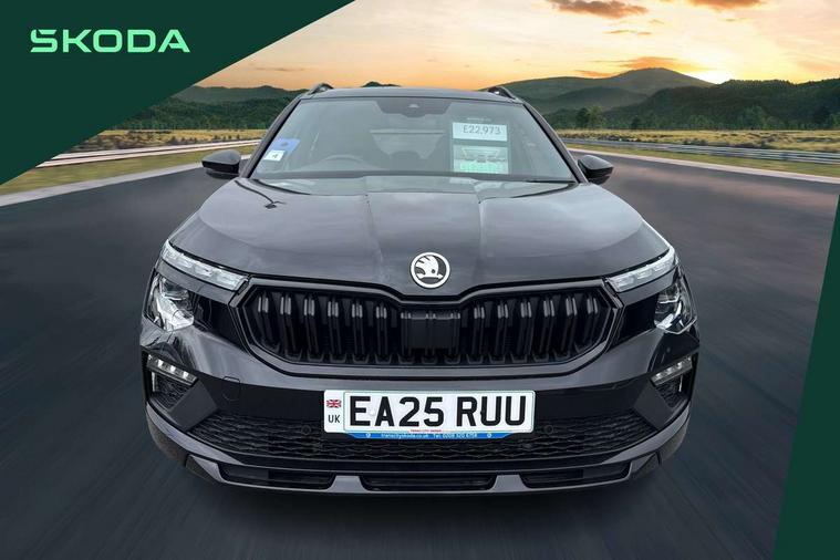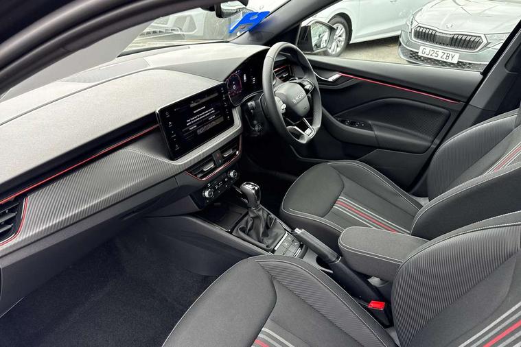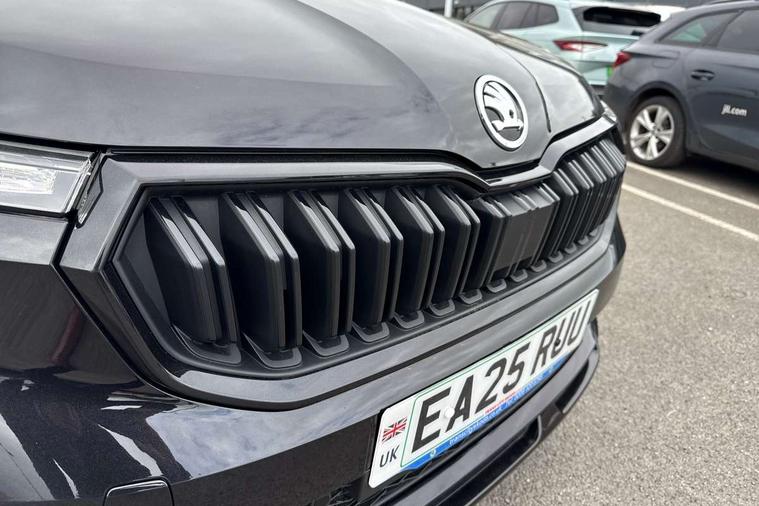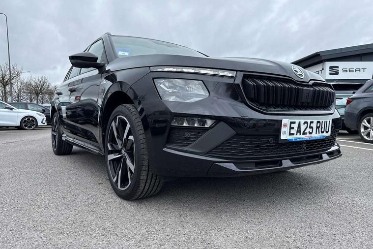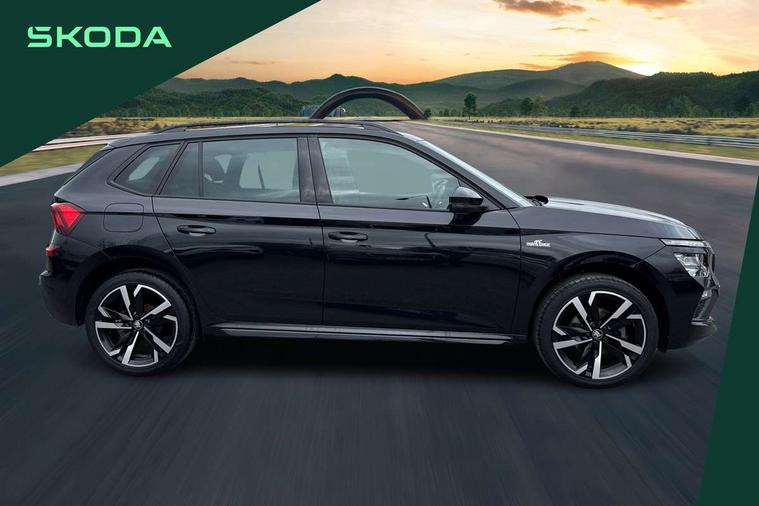 Advanced driver attention and drowsiness monitor, Bluetooth system, E-call, Front assist system, PAS, Rear parking sensors, Rear view camera, Service indicator, Speed limiter, Traffic sign recognition, Virtual cockpit with 10.25" display, Voice control system, Wireless smartlink, 4 USB C ports, 8 Speakers, 9.2" Skoda navigation display, DAB Digital radio, Auto dimming rear view mirror, Automatic headlight control with coming home and leaving home feature, Black door mirrors, Black radiator grille, Black rear diffuser, Black roof spoiler, Body colour bumpers, Body colour door handles, Boot lettering in black, Extended tailgate glass, Fixed panoramic sunroof with black roof rails, Front and rear electric windows, Heated rear window, LED daytime running lights, LED high beam, LED low beam, LED third brake light, Light sensors, Monte carlo plaque, Privacy glass, Rear side wing doors, Rear wiper, Ticket holder inside windscreen, 12V socket in luggage compartment, 3 seat bench in 2nd row, Aluminium pedals, Ambient lighting in white/red, Art leather carbon decor inserts, Art leather carbon door inserts, Black roof lining, Cargo elements, Chrome inner door handles, Driver and passenger sun visors with vanity mirror, Dual zone climate control, Front and rear roof lights, Front centre armrest, Front head restraints, Glove compartment with illumination, Height adjustable driver seat, Height adjustable front passenger seat, Ice scraper, Inner circulation control with pollen filter, ISOFIX on front passenger seat, Isofix preparation for back seats, Leather gearknob and handbrake lever, Manual lumbar support for front seats, Monte Carlo cloth upholstery, Net package and top tether hooks in boot space, Net under rear shelf, Pocket on the back of both front seats include mobile phone pockets, Rake/reach adjustable steering wheel, Reading lights, Rear centre armrests, Red hotstamping, Single front passenger seat, Sports seats, Textile floor mats, Third rear headrest, Top tether for front passenger seat, Umbrella in driver's door, Light and view plus package - Kamiq, 3x3 point rear seatbelts, Airbags - driver and front passenger, Disc brakes, ESP, Extended and predictive pedestrian/cyclist protection, Front passenger airbag deactivation switch, Front side airbags with curtain airbags, Hill hold control, Manual leather parking brake, Manual rear child locks, One tone horn, Seatbelt reminder for driver an co-driver, Traction control, Tyre pressure monitor, Anti-theft alarm system with interior monitoring, backup horn, towing protection and remote central locking with SAFE system, Anti-theft wheel bolts, Electronic engine immobilizer, 18" Ursa black diamond cut alloy wheels,