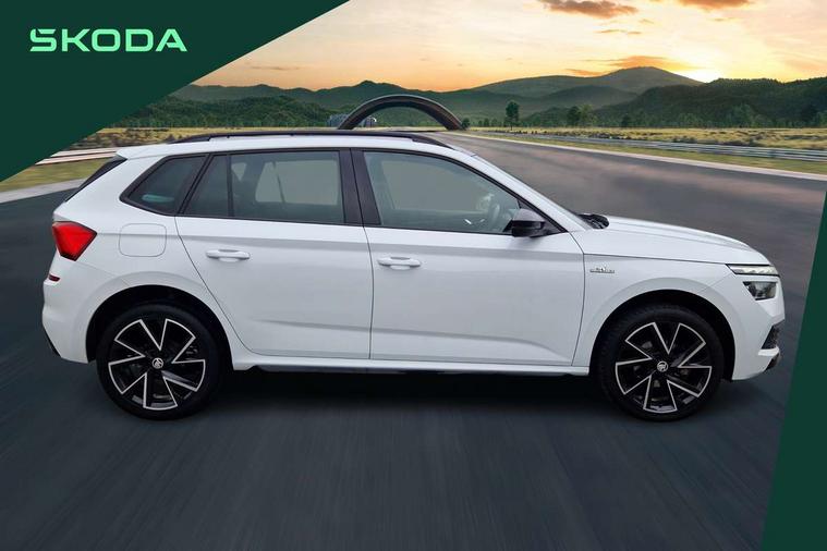 Amundsen satellite navigation with 9.2" touchscreen display, voice control, virtual cockpit and web radio, Bluetooth system, E-call, Front assist system, Gesture control, PAS, Service indicator, Speed limiter, Virtual cockpit with 10.25" display, Wireless SmartLink for apple car play, android auto and mirrorlink, 8 Speakers, Auxiliary input socket, DAB Digital radio, Black door mirrors, Black radiator grille, Black rear diffuser, Body colour bumpers, Body colour door handles, Body colour roof spoiler, Boot lettering in black, Chrome grille surround, Dimming rear view mirror with black surround, Electrically adjustable and heated door mirrors, Fixed panoramic sunroof with black roof rails, Front and rear electric windows, Front sport bumper, Full LED headlights with adaptive front light system and front cornering fog lights, Headlight range control, Heated rear window, KAMIQ Door sills, LED daytime running lights, LED rear lights - low functionality, Light sensors, Monte carlo plaque, Privacy glass, Rear fog lights, Rear side wing doors, Rear wiper, 12V Accessory socket in centre console, 3 seat bench in 2nd row, Aluminium pedals, Black ceiling for black/beige interior, Chrome inner door handles, Cloth upholstery, Front head restraints, Glove compartment with illumination, Ice scraper, Isofix child seat fittings on outer rear seats, ISOFIX on front passenger seat, Leather gear lever, Manual lumbar support for front seats, Rake/reach adjustable steering wheel, Reading lights, Single front passenger seat, Sports seats, Sun visors with illumination on front passenger, Textile floor mats, Third rear headrest, Top tether for front passenger seat, Umbrella in driver's door, 3x3 point rear seatbelts, Airbags - driver and front passenger, ESP, Front passenger airbag deactivation switch, Front side airbags with curtain airbags, Hill hold control, Manual parking brake, Manual rear child locks, One tone horn, Rear disc brakes, Seatbelt reminder for driver an co-driver, Traction control, Tyre pressure monitor, Anti-theft alarm system with interior monitoring, backup horn, towing protection and remote central locking with SAFE system, Anti-theft wheel bolts, Electronic engine immobilizer, Chrome air vent surrounds, 18" Vega alloy wheels in black,