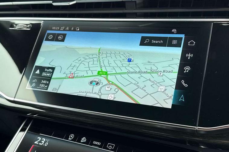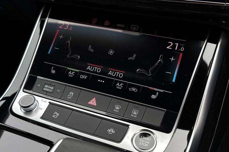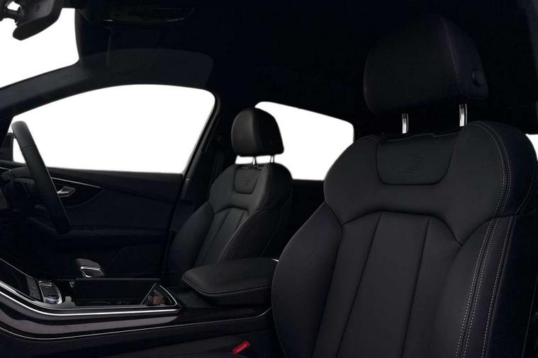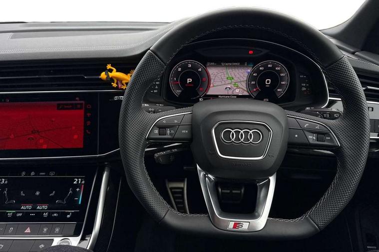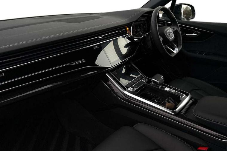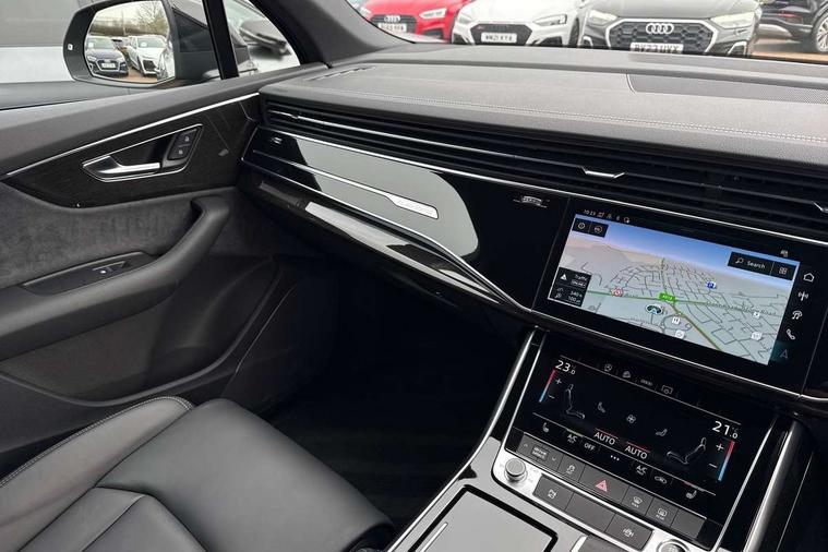 Audi connect safety and service (e-call), Audi connect with Amazon Alexa Integration, Audi drive select (Auto, Comfort, Dynamic, Efficiency, Individual, Off-road and All road), Audi phone box light with wireless charging, Audi virtual cockpit - 12.3" high-resolution LCD display with fully customisable instrument cluster, Bluetooth interface, Camera based traffic sign recognition, Electromechanical power steering, MMI navigation plus with MMI touch screens includes 10.1" and 8.6" screens with haptic feedback, Natural voice recognition, Operating buttons in Matte black, Parking system plus with 360 degree display (front, rear and side sensors) - acoustic and visual park assist system, Power operated tailgate, Rear view camera, Smartphone interface includes wireless Apple carplay/Android Auto, Start/stop system, 48V Mild hybrid technology, Adaptive air sports suspension, Quattro all wheel drive with self locking centre differential, Audi music interface - front 2 USB-C ports with charger and data functions, Audi sound system with 6 channel amplifier, 180 watt amplifying capacity and 10 loudspeakers including subwoofer, DAB digital radio module, Aluminium window trim, Audi Beam uses LEDs to project S emblem with red rhombus onto the ground when opening the side doors (front/rear), Auto dimming frameless rear view mirror, Black exhausts, Black roof rails, Electrically adj heated/folding + automatically dimming exterior mirrors with memory + automatic kerb side function for passenger side exterior mirror, Heat insulating glass in windshield, Integrated LED indications in door mirrors, LED 3rd brake light, LED daytime running lights, LED rear tail lights, Loading edge protection in stainless steel, Matrix LED headlights with dynamic front and rear indicators, Privacy glass - dark tinted rear and rear side windows from B-pillar backwards, Rear side wing doors, Rear wiper, 2 seat bench in 3rd row, 2 zone automatic climate control, 3 seat bench in 2nd row, 7 seat layout with ISOFIX points for the front passenger seat and rear passenger seat, Black carpets, Black cloth headlining, Comfort front centre armrest, Electric adjustable front seat with 4 way lumbar support, driver memory functionality, Folding rear seats, Front head restraints, Front/rear floor mats, Heated front seats, Illuminated door sill trims with S logo, ISOFIX child seat mounting for front passenger seat and 2 outer rear seats with top tether child seat mounting for all 3 rear seats, LED interior ambient lighting, Luggage compartment cover, Luggage compartment sill protection in stainless steel, Rear head restraints, Rear seat bench plus for the second row, with forwards/backwards sliding adjustment and backrest angle adjustment, Single front passenger seat, Stainless steel pedals, Sunvisors with illuminated vanity mirrors, Black styling pack plus - Q7, 3 point seatbelts on all rear seats, Audi pre sense basic, Audi pre sense front, Child locks on rear doors, Convenience key with safelock and gesture tailgate, Driver and front passenger, front side and curtain airbags, Electromechanical parking brake, Electronic Stabilisation Control (ESC) including ABS, ASR and EDL, Extended pedestrian protection measures, Hill hold assist, Seatbelt reminder, Tyre pressure loss indicator, Warning triangle and first aid kit, Anti theft alarm with tow away protection, Anti-theft wheel bolts and wheel loosening detection, Keyless Go, Remote central locking, Black dashboard, Polished oak trim with grey finish inlay, Tool kit, Tyre repair kit,