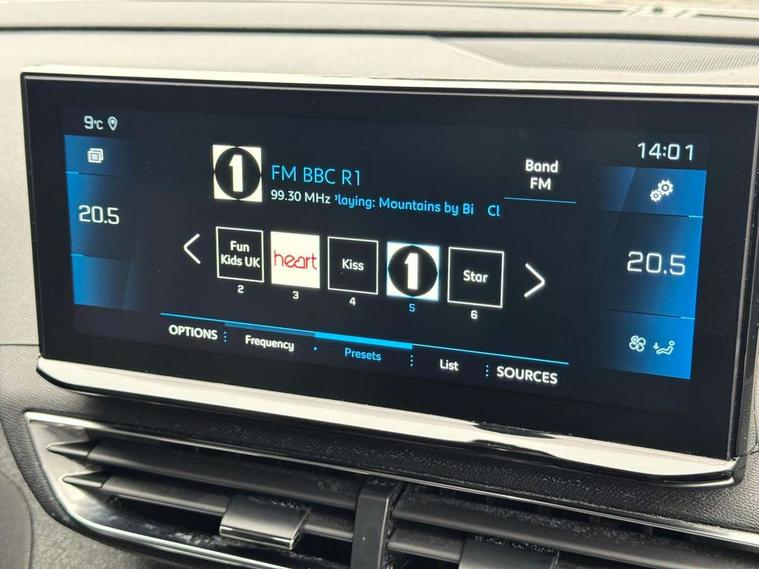 3D connected navigation with 10" HD touchscreen, Bluetooth telephone facility, Drive modes select (Eco, normal and sport), Driving Time Warning (DAA1), Emergency services call system, Extended traffic sign recognition, Exterior temperature indicator with ice warning, Front parking sensors, Mirror screen with mirror link, apple carplay and android auto, Multi function trip computer, PEUGEOT i-Cockpit with 10" high definition capacitive touchscreen, Peugeot i-cockpit with compact multi-function sports steering wheel, PEUGEOT i-Cockpit with configurable 12.3" Head-up digital instrument panel, Rear parking aid, Speed limit recognition and recommendation, Voice recognition, Dynamic stability control and electronic anti-skid system, Stop/start function, 6 speakers radio with mp3 compatible, DAB Digital radio, USB socket, Aluminium longitudinal roof bars, Automatic hazard light activation upon heavy brake application, Automatic triggered rear windscreen wiper in reverse gear, Black rubber side window trim, Black with chrome detailed front wing trim, Body colour door handles, Body colour rear roof spoiler with stainless steel edging trim, Body protectors (bottom of front and rear bumpers + wheel arches + protection at bottom of doors) in black, Chrome frameless 'Classic' grille, Chrome rear bumper facia, Dark tinted rear side windows + tailgate window, Diamond Black door mirror shells, Door mirror mounted LED courtesy floor lighting, Eco LED headlights, Electric folding door mirrors with exterior courtesy LED lighting, Electric operated/heated door mirrors, Front and rear door and sill protectors with polished stainless steel insert, Front bumper lower trim in Silver, Front windscreen wiper with magic wash cleaning system, Gloss black B and C pillar and aerodynamic deflector trim, Gloss black front bumper air scoops, Gloss black rear cluster connecting strip, Gloss black windscreen trim, Headlights left on audible warning, Heated rear windscreen with integrated antenna, LED daytime running lights, LED front indicator, LED rear number plate lighting, LED side indicator lights integrated into door mirrors, LED third brake light, One touch electric front/rear windows with pinch protection, Rear LED Peugeot signature 'Claw Effect' lights, Rear side wing doors, Stainless steel roof arches, 1/3 to 2/3 split folding rear seats, 12V Sockets in dashboard, rear cabin and load area, 2 cupholders in front centre console, 2 cupholders in rear armrest, 2 x Rear reading spotlights, 2x Rear coat hooks, 3x Isofix child seat fittings in the front passenger and outer rear seats, 4 Grab handles retractable and damped, Blue ambient lighting for connecting zone, Blue ambient lighting to front door panels, Blue ambient lighting to headup instrument panel, Brumeo fabric trimmed door armrests, Centre front armrest with butterfly wing opening and illuminated storage compartment, Driver seat lumbar adjustment, Driver seat manual adjustment (longitudinal and back rest angle), Dual zone automatic climate control, Electric power steering with reach and rake adjustable steering column, Flocked glovebox interior, Foldable front passenger seat with picnic table, Footwell illumination, Front interior light with 2 reading spotlights and rear interior light with timer, Front passenger seat manual adjustment (longitudinal and back rest angle), Front seat back map pockets, Gear shift indicator, Height adjustable front seats, Illuminated glovebox, Individual left and right controls in boot for seat folding, Leather steering wheel with detail stitch, LED interior lighting in storage spaces and load area, LED roof interior lighting, Rear bench seat with central armrest and ski hatch, Rear centre console ventilation system, Roof lining - Salin light grey, Satin chrome dashboard trim, Satin chrome digital instrument panel and touchscreen trim, Satin chrome front door panel recess trim, Satin chrome interior door handles, Satin chrome scorpion's tail and toggle switch trim, Seatbelt not fastened audible and visual alert for front seats, Seatbelt unfastened on the move audible and visual alert for front and rear seats, Sunvisors with illuminated vanity mirrors, Two position boot floor, Safety plus pack with high beam assist - 3008, Visibility pack - 3008, 3x Rear three-point retractable seatbelts with force limiters in the outer rear seats, ABS (Anti-lock Braking System) with EBD (Electronic Brakeforce Distribution) and EBA (Emergency Braking Assistance), Adaptive driver and front passenger airbags with passenger airbag deactivation function, Driver and front passenger side airbags, Electric child locking functionality on rear windows and doors, Electric parking brake, Front and rear curtain airbags, Front optimised safety headrests and 3 x rear retractable headrests with height adjustable, Front three point retractable seatbelts with pre tensioners and force limiters, Front ventilated disc brakes and rear disc brakes, Hill start assist, Two tone horn, Automatic door locking when moving off, Electronic immobiliser, key operated exterior door lock from the left hand door, Perimetric and volumetric alarm with lift and tilt sensor, Peugeot Open and Go System, Remote control central locking with two plip keys, Brumeo fabric Dashboard, front and rear door panel finish, Puncture repair kit including compressor, sealant cartridge and towing eye,