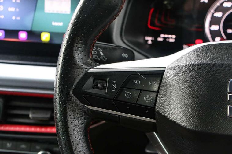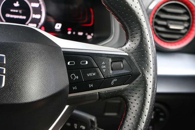 'Lights On' Reminder warning buzzer, 8" Digital cockpit, Digital clock, E-call, Electric speed sensitive power steering, Full Link Smartphone Integration with Mirror Link, Apple Car Play, Google Android Auto with USB Type C cable for Apple and Android compatibility, Lane keeping system, Low fuel warning light, Outside temperature display, Rear parking sensor, RPM counter, Seat connect with safety, service, remote and online, SEAT Drive profile - Four different models normal-sport-eco-individual, steering response, throttle response, Trip computer, Wireless phone charger, 9.2" colour touchscreen with navigation system, voice control and USB port (type c), Bluetooth interface for hands free and audio streaming, DAB digital radio and AM/FM radio, Steering wheel mounted audio controls, Anti theft roof antenna, Auto dimming interior rear view mirror, Automatic activation of hazard warning lights, Body coloured bumpers, Body coloured door handle inserts, Chrome roof rails and window surrounds, Dark tinted rear windows, Electric front/rear windows, Electrically adjustable, heated and folding door mirrors, Front fog lights with cornering function and rear fog light, FULL LED automatic headlights with dynamic headlight range control, coming and leaving home, LED daytime running lights, LED rear tail lights and licence plate lights, Protective side mouldings, Rain sensing wipers, Rear side wing doors, Rear spoiler, Rear window wash/wipe, Roof colour door mirrors, Third brake light, Twin exhaust pipe styling hidden exhaust pipe, Visible VIN plate, Windshield wiper with intermittent control and potentiometer, 2 cupholders, 3 seat bench in 2nd row, 60/40 split folding rear seat, Aircare filter, Black interior roof, Cloth upholstery, Double boot floor, Driver sunvisor with covered mirror + card holder, Dual zone climate control, Front courtesy light with 2x front and 2x rear reading lights, Front sport seats, Gear shift indicator, Height adjustable front seats, Height/reach adjustable steering column, Illuminated boot, Instrument lighting with brightness control, Interior ambient lighting, Interior light in footwell, central console and door panel, ISOFIX points in outer rear seats with top tether anchorage points, Passenger sunvisor with vanity mirror, Perforated flat bottomed leather steering wheel/gear knob/handbrake with red stitching and FR logo, Single front passenger seat, Two front and three rear height adjustable headrests, Interior chrome pack - Arona, 3 point seatbelts on all rear seats, ABS, Active front headrests, Child locks on rear doors, Driver and front passenger airbags with front passenger airbag de activation, front side and curtain airbags, Electronic stability control, Emergency Brake Assist (EBA) and front assist, Front and rear seatbelt reminder, Hill hold control, Multi-Collision braking, Tiredness recognition system, Traction control, Tyre pressure monitoring system, Alarm with back-up horn, Electronic engine immobiliser, Locking wheel bolts, Remote central locking + deadlocks, Tow away protection, Titan black dashboard, 17" Dynamic alloy wheels,