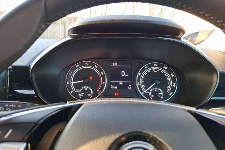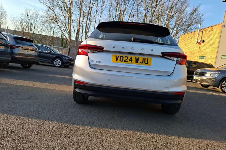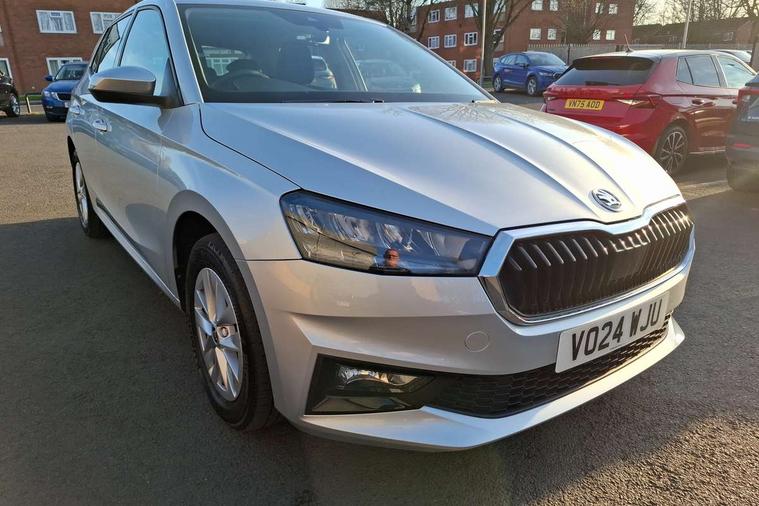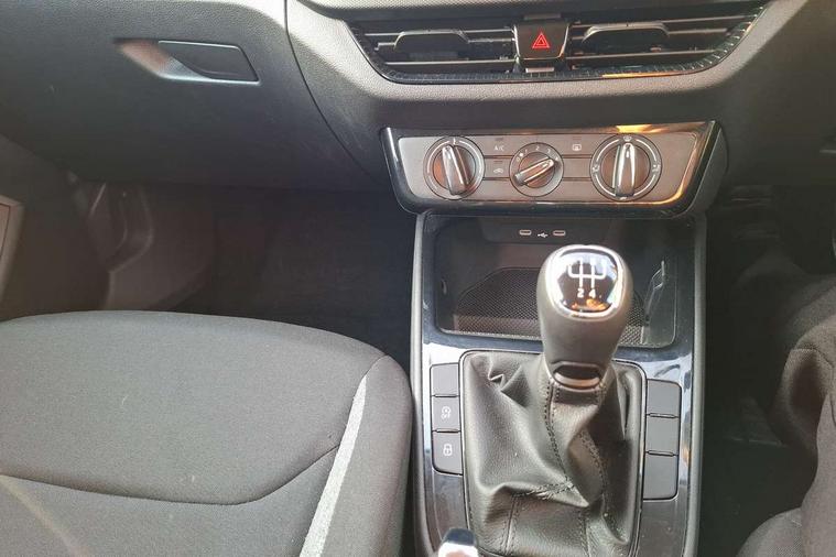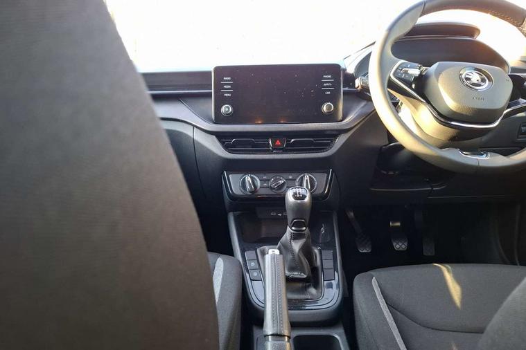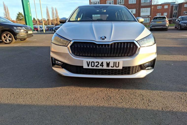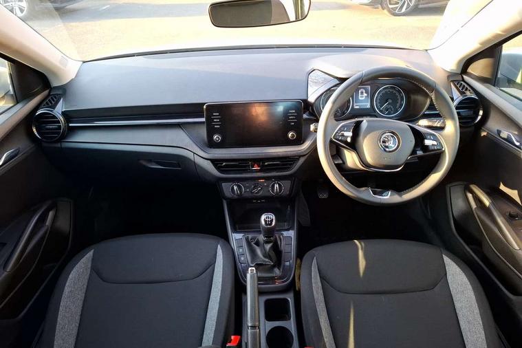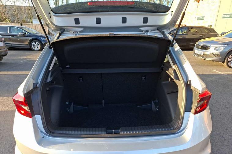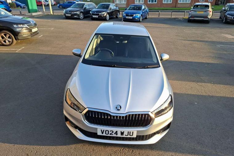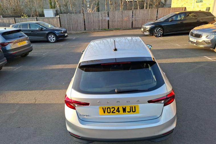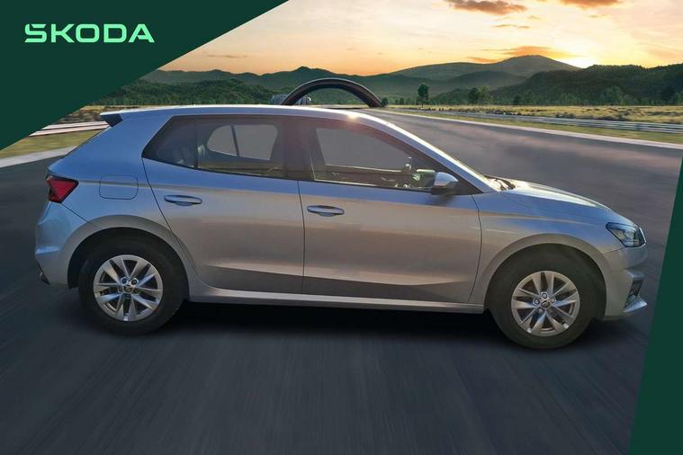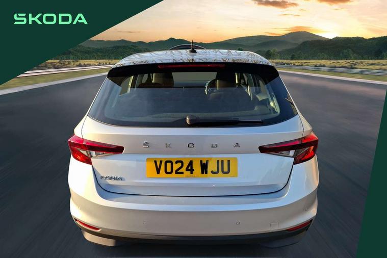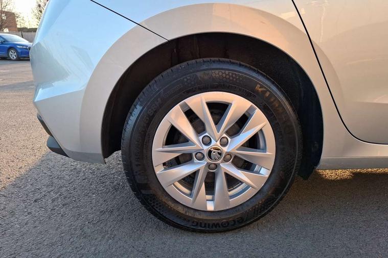 8" Digital instrument display, Advanced driver attention and drowsiness monitor, Bluetooth connection, Electromechanical power steering, Exterior temperature gauge, Lane assist including road edge detection, Rear parking sensors, Service interval indicator, Speed limiter, Traffic sign recognition, Wireless SmartLink for Apple CarPlay and Android Auto, 2x USB-C in the front (for data transmission and charging), 6 speakers (4 speakers/2 tweeters), 8.25" Skoda infotainment touchscreen display, Auxiliary socket for external MP3 player, DAB digital radio reception, Basic LED Headlights, Basic rear lights, Body colour door mirrors, Body coloured bumpers, Dimming rear view mirror with black frame, Door mirror integrated indicators, Electrically adjustable and heated door mirrors, Electrically adjustable front windows with function auto up/down, Front fog lights, Front window wiper intermittent control, Headlight range control - Automatic, Ice scraper in fuel cap, LED daytime running lights with coming and leaving home feature, Mechanical adjustable rear windows, Rain sensor, Rear LED fog light, Rear side wing doors, Rear window wiper with washing nozzles, Roof mounted spoiler, SKODA tailgate lettering in chrome, Third brake light, 2 reading lights in front and 2 reading lights in rear, 2 spoke leather multifunction steering wheel, 3 rear headrests, Backrest split and folding, Central console with removable cup holder and storage box, Chrome handbrake release button, Fabric upholstery, Front centre armrest, Gearshift knob/handle in leather, Grain satin black interior door handles, Hand brake lever handle in leather, Height adjustable driver seat, Height adjustable front headrests, Height adjustable steering wheel, ISOFIX and TopTether anchorage points to the outer rear seats, ISOFIX and TopTether on the front passenger seat, Luggage compartment lighting, Manual air conditioning, Pollen filter, Rear seat bench unsplit, Single front passenger seat, Storm grey headlining, Sun visors with mirror and airbag label on passenger side, Textile floor mats, Ticket holder, 3-point height adjustable front seats belts with pretensioner and force limiter, Automatic warning lights in case of crash, Driver and passengers airbag with switch off function, e-Call+, ESC including ABS, MSR, ASR, EDS, HBA and XDS, Front and rear seat belt warning, FRONT ASSIST (AEB City and AEB Inter Urban), Front side airbags, Head airbags, One tone horn, Pedestrian protection, Three rear 3-points safety seat belts with pretensioner and force limiter including stop function for outer rear seat belts, Tyre pressure monitoring system, Anti-theft alarm system including immobiliser, interior monitoring, backup horn, and towing protection, Central locking with radio remote control, interior controls, SAFE function and 2 foldable keys, Black painted air vents, Glossy black decorative trim, Grain satin black central console cover, Grain satin black lower decorative trim, Satin black door and side trim panel in front, Anti-theft wheel bolts protection, Super-low rolling resistance tyres,