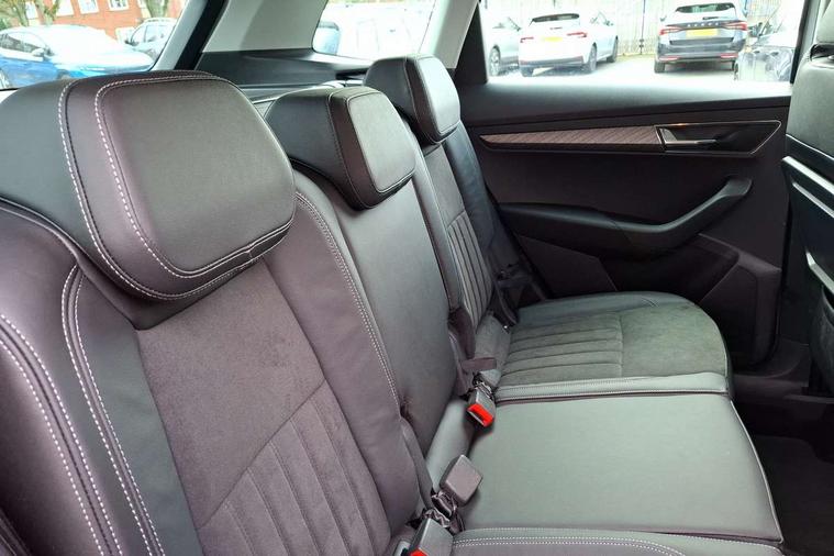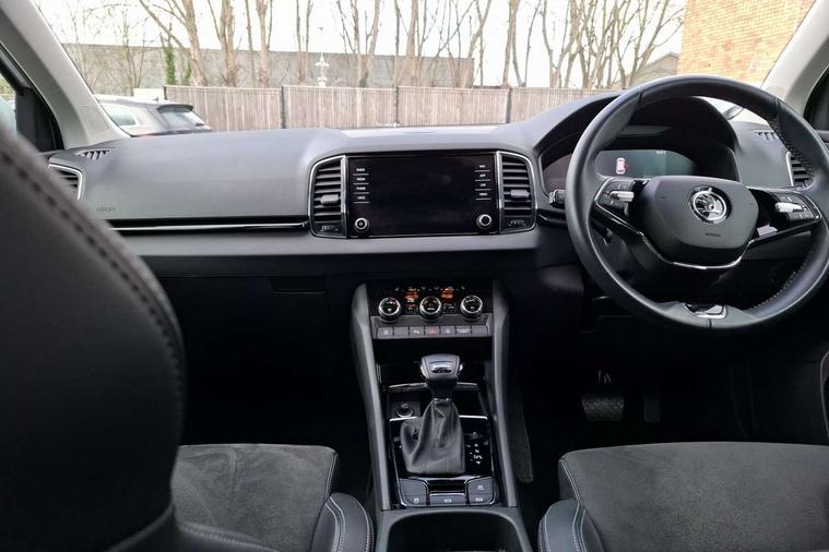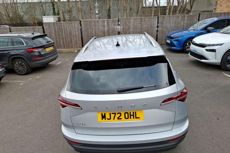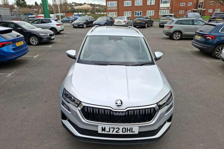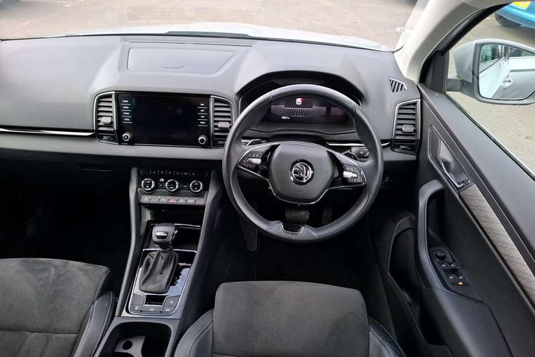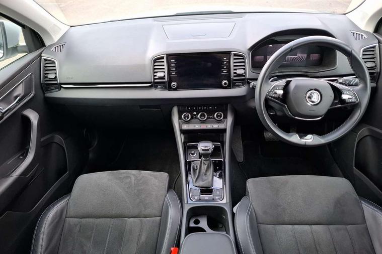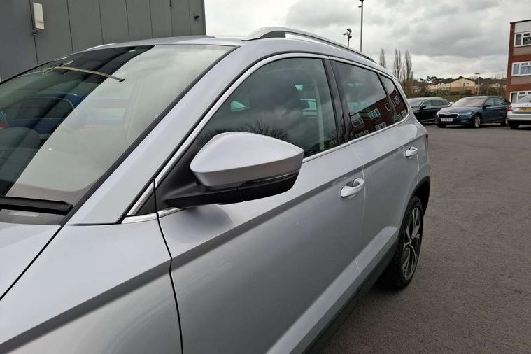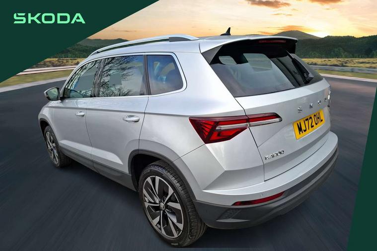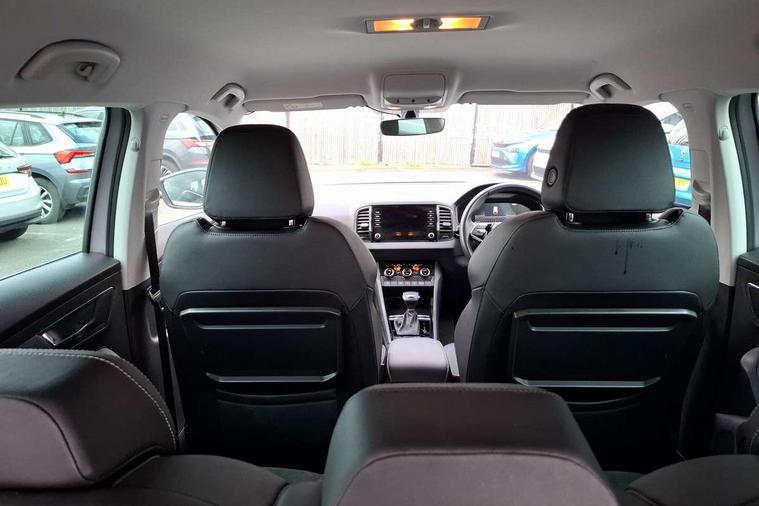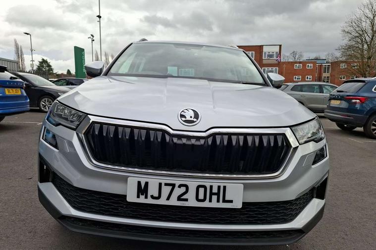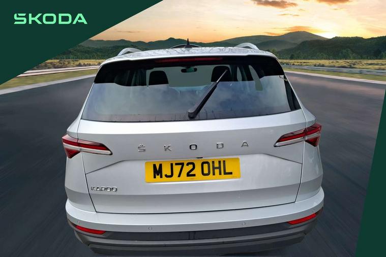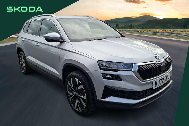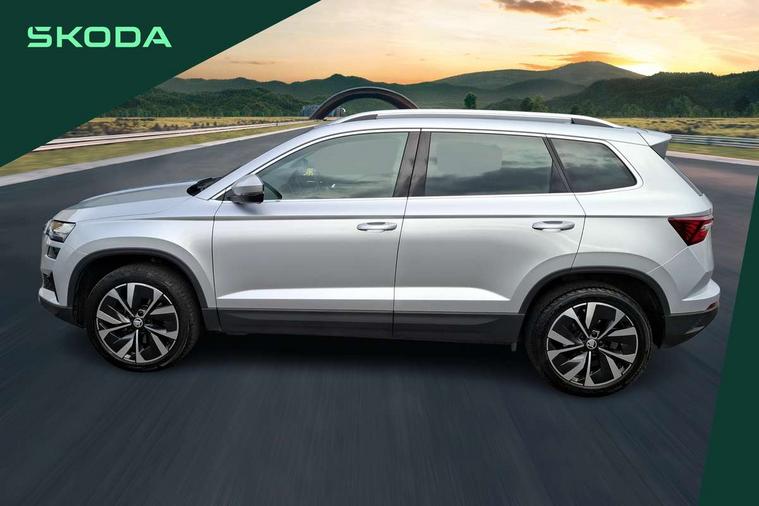 8" Digital display, Care connect, Colour multifunction trip computer, Driver fatigue sensor, Emergency services call system, Outside temperature gauge, Service interval indicator, SmartLink wireless for Apple and wired for Android, Start/stop system with regenerative braking, USB C Port x 2 in front centre console, 8 Speakers, DAB radio with Bluetooth, USB connection, Acoustic glass, Aero front windscreen wipers with intermittent function, Auto dimming rear view mirror with light and rain sensors, Automatic headlight control system, Black electric window control buttons, Body colour door mirrors and handles, Electric front and rear windows with child proof lock, Heated rear windscreen, LED daytime running lights, LED rear lights with high functionality welcome effect and dynamic indicators, Light assistant (coming/leaving home/tunnel light), Plastic scuff plates, Privacy glass, Rear side wing doors, Rear spoiler, Rear window wiper with washer system and intermittent control, Safety reflectors on front doors, 1.5 litre bottle holders in driver and front passenger door panels, 12V socket in boot, 12v socket in front centre armrest with storage compartment and rear air vents, 2 Folding hooks and nets in boot, 2 spoke leather heated multifunction steering wheel with DSG paddles, 2 x Tablet holder, 3 rear height adjustable headrests, 3 seat bench in 2nd row, 4 foldable roof handles with rear coat hooks, Black floor carpet, Chrome inner door handles, Decorative door sills with KAROQ badging, Double sided boot floor, Foldable hooks in the boot, Front head restraints, Height adjustable front three point seats belts with tensioners, Height/reach adjust steering wheel, Ice scraper, Illuminated glovebox, Illuminated luggage compartment, Isofix child seat preparation for front passenger seat, Isofix child seat preparation outer rear, Manual lumbar support for front seats, Pen holder, Pollen filter, Rear boot cover, Rear reading lights, Rubbish bin door, Safety vest holder, Single front passenger seat, Storage box in upper central dashboard closed, Sunvisors with illuminated vanity mirrors, Textile floor mats, Ticket holder, VarioFlex seats with standard rear seat release, Chrome roof rails + chrome pack - Karoq, Parking pack - Karoq, Automatic door unlocking in case of crash, Automatic fuel cut off in case of crash, Child locks on rear doors, Driver airbag, Electronic parking brake with auto hold function, Emergency rear braking signal, ESC including ABS, MSR, ASR, EDS, HBA, DSR, RBS, MKB and traction control, Front side airbags, Hill hold control, Knee airbags, Passenger airbag with switch-off function, Pedestrian monitor, Seatbelt reminder signalisation and pretensioner for all seats, Three point seatbelts rear, Two tone horn, Tyre pressure display, Tyre pressure monitor, Alarm with interior monitoring, back up horn and tilt sensor with safe function, Electronic engine immobiliser, Keyless entry and start/stop, Remote central locking with 2 remote folding keys, Chrome framed air vents, Anti-theft wheel bolts protection, Storage on wheel cover, Tool kit,