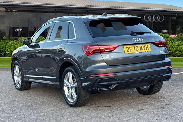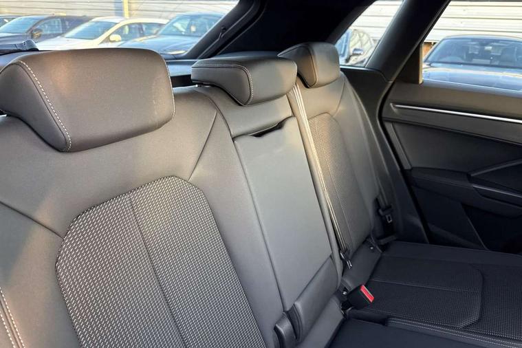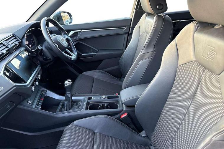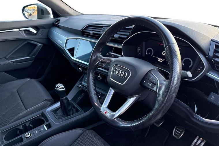 Dark matt brushed aluminium inlay, Leatherette door armrest, MMI touch colour display in glass look, black with surround in aluminium look, Non smoking pack - Q3, Anti theft alarm, Anti theft wheel bolts, Audi pre-sense front with pedestrain and cyclist recognition, Remote central locking, 1 x USB type C and 1 USB type A charging points, 6 passive loudspeakers, DAB digital radio module, 3x3 point rear seatbelts, 6 airbags - Driver, front passenger, curtain and side windows, Electrically operated child locks on rear doors, Electromechanical parking brake, Electronic stabilisation control including ABS, ASR and EDL, Hill descent control, Hill hold assist, Pre sense basic, Seatbelt monitoring, Tyre pressure warning, Warning triangle and first aid kit, Acoustic windscreen, Aluminium roof rails, Aluminium window trim, Auto dimming frameless rear view mirror, Body coloured bumpers, Electrically folding, adjustable and heated door mirrors with integrated LED side indicators and kerb view function for passenger side, Front and rear electric windows, Front fog lights, Front side air inlets in matt platinum grey, Front spoiler blade in matt platinum grey, Grille vertical bars in aluminium silver/Matt, High gloss black finish B and C pillars, LED headlights with LED daytime running lights and dynamic rear indicator, LED rear lights, Privacy glass dark tinted rear and rear-side windows (from B-pillar backwards), Rain and light sensors, Rear diffuser strip in matt titanium black, S line badges on front wings, S Line front and rear bumpers, Side skirt insert in matt Platinium grey, Silver chrome grille surround, Titanium black radiator grille, 12V socket in rear centre console, 40:20:40 folding with manual adjustment for 60:40 forwards/backwards position and backrest angle, Adjustable rear seat bench/backrest with centre armrest and cupholder, Black cloth headlining, Dual zone electronic climate control, Front and rear black floor mats with contrast stitching in rock grey, Front and rear headrests, Front and rear roof module including reading lights, Front centre armrest, Glove compartment lighting, Height and reach adjustable steering wheel, Illuminated door sill trims with S logo, ISOFIX child seat mounting for front passenger with airbag deactivation and outer rear seat including top tether attachment point for outer rear seats, Luggage compartment light, Manual front seats with height adjustment, Perforated leather gearknob, Stainless steel luggage compartment sill finisher, Stainless steel pedals, Audi connect safety and service (e-call), Audi drive select, Audi lane departure warning, Audi side assist, Audi smartphone interface includes wireless Apple carplay/Android Auto, Audi Virtual Cockpit - 10.25" display, Bluetooth interface, Camera based traffic sign recognition, Cruise control + speed limiter, MMI Navigation Plus with high resolution 10.1 inch touchscreen colour display, Power operated tailgate, Progressive steering, Rear parking sensors, Service interval indicator, Start stop system with recuperation, Voice control system with natural language interaction, Diesel particulate filter, Sports suspension,