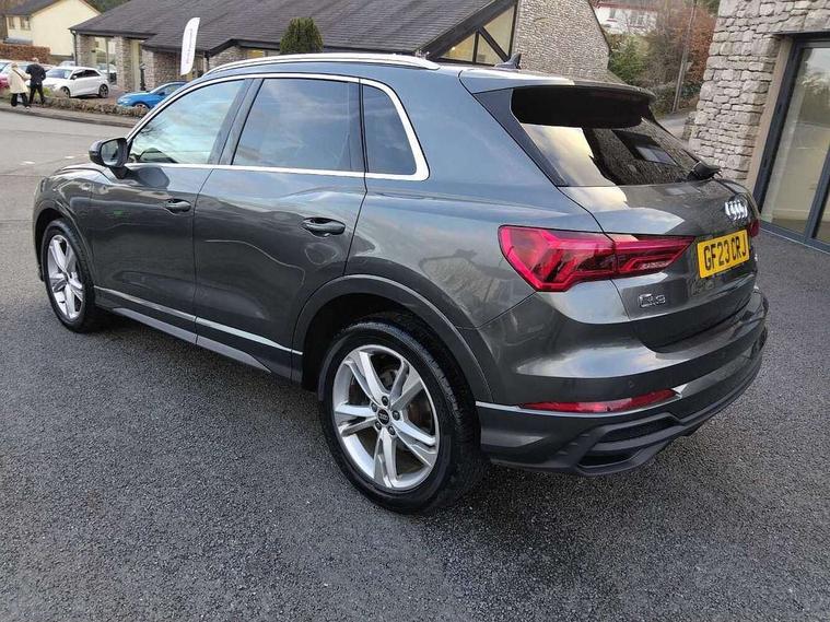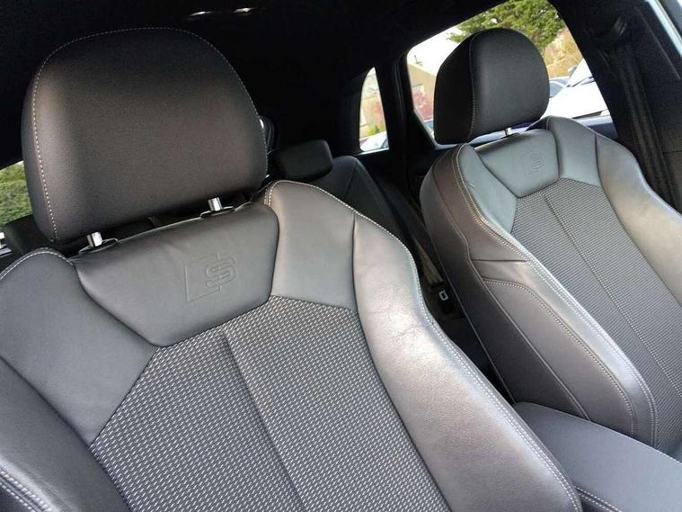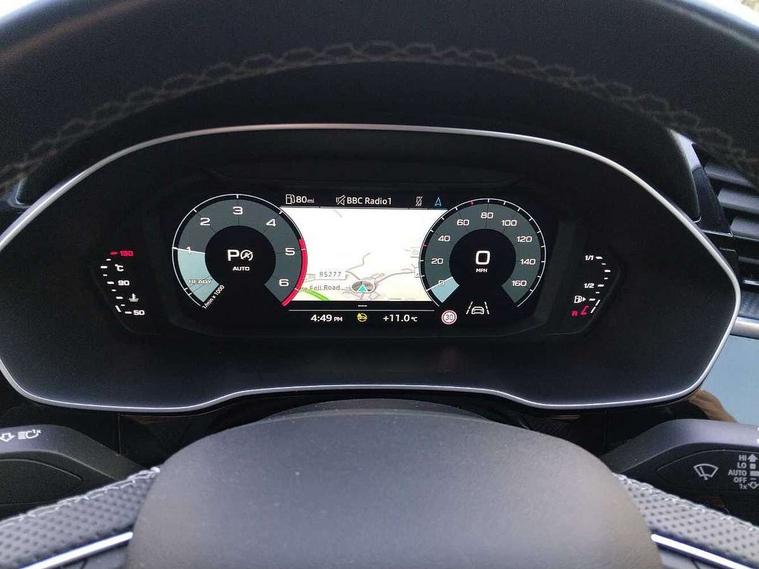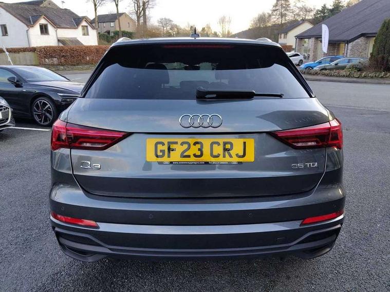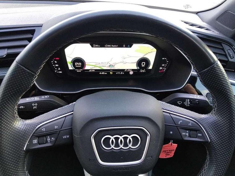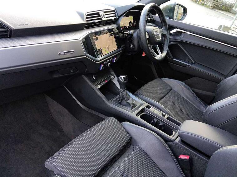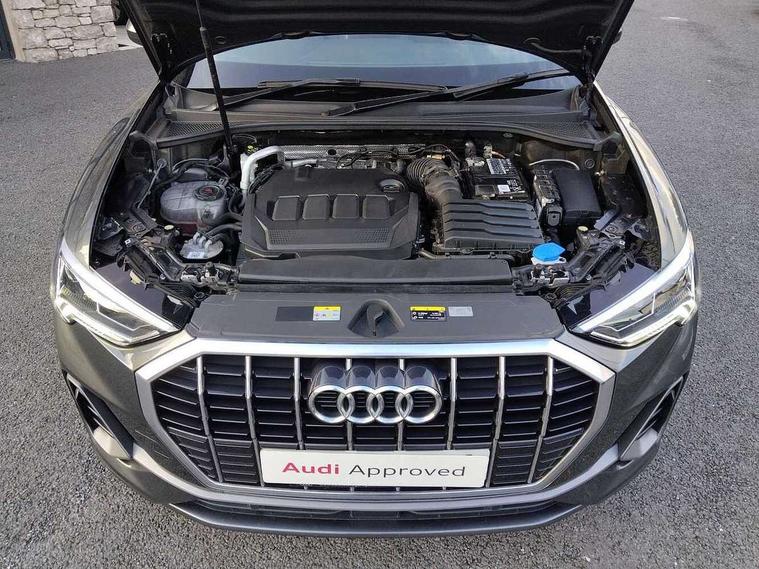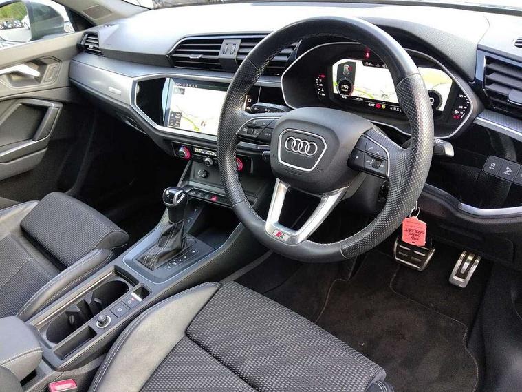 Amazon alexa Integration, Audi drive select, Audi lane departure warning, Audi smartphone interface includes wireless Apple carplay/Android Auto, Audi Virtual Cockpit - 10.25" display, Bluetooth interface, Camera based traffic sign recognition, Legal emergency call, MMI Navigation Plus with high resolution 10.1 inch touchscreen colour display, Power operated tailgate, Progressive steering, Service interval indicator, Start stop system with recuperation, Voice control system with natural language interaction, Diesel particulate filter, Sports suspension, 2 USB-C ports with charge and data functions, 6 passive loudspeakers, DAB digital radio module, Acoustic windscreen, Aluminium roof rails, Aluminium window trim, Anthracite black radiator grille, Auto dimming frameless rear view mirror, Body colour front spoiler blade, Body coloured bumpers, Electrically folding, adjustable and heated door mirrors with integrated LED side indicators and kerb view function for passenger side, Front and rear electric windows, Front fog lights, Front side air inlets in matt platinum grey, Grille vertical bars in aluminium silver/Matt, High gloss black finish B and C pillars, LED Dynamic rear indicators, LED headlights with LED daytime running lights, LED rear lights, LED third brake light, Privacy glass dark tinted rear and rear-side windows (from B-pillar backwards), Rain and light sensors, Rear diffuser grille in grained matt black, Rear diffuser strip in matt anthracite black, Rear side wing doors, Rear wiper, S line badges on front wings, S Line front and rear bumpers, Side skirt insert in matt Platinium grey, Variable front intermittent wipers, 12V socket in rear centre console, 3 seat bench in 2nd row, 3 spoke leather multifunction steering wheel features S badging and grips in perforated leather with contrast stitching, 40:20:40 folding with manual adjustment for 60:40 forwards/backwards position and backrest angle, Adjustable rear seat bench/backrest with centre armrest and cupholder, Black cloth headlining, Dual zone electronic climate control, Front and rear black floor mats with contrast stitching in rock grey, Front and rear headrests, Front and rear roof module including reading lights, Front centre armrest, Glove compartment lighting, Height and reach adjustable steering wheel, Illuminated door sill trims with S logo, ISOFIX child seat mounting for front passenger with airbag deactivation and outer rear seat including top tether attachment point for outer rear seats, Luggage compartment light, Manual front seats with height adjustment, Perforated leather gearknob, Single front passenger seat, Stainless steel luggage compartment sill finisher, Stainless steel pedals, Ambient lighting pack - Q3, Non smoking pack - Q3, 3x3 point rear seatbelts, 6 airbags - Driver, front passenger, curtain and side windows, Audi pre-sense front with pedestrain and cyclist recognition, Electrically operated child locks on rear doors, Electromechanical parking brake, Electronic stabilisation control including ABS, ASR and EDL, Front seatbelt reminder, Hill descent control, Hill hold assist, Pre sense basic, Seatbelt monitoring, Tyre pressure warning, Warning triangle and first aid kit, Anti theft alarm, Anti theft wheel bolts, Immobiliser, Remote central locking, Aluminium look interior elements, Dark matt brushed aluminium inlay, Detail dashboard around MMI touch colour display in glass look, black with surround in aluminium look, Leatherette door armrest,