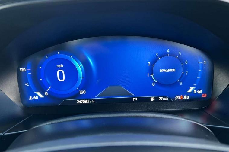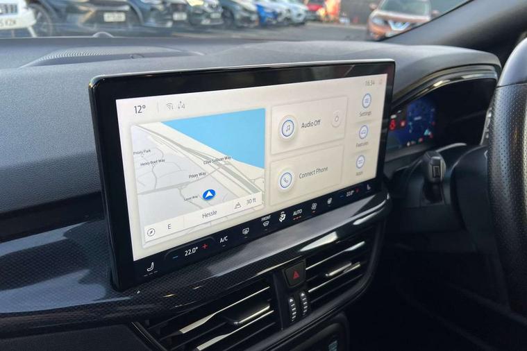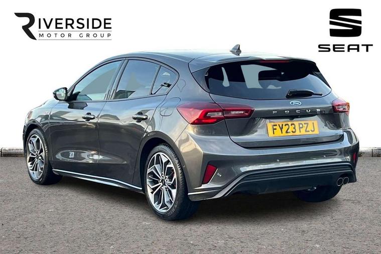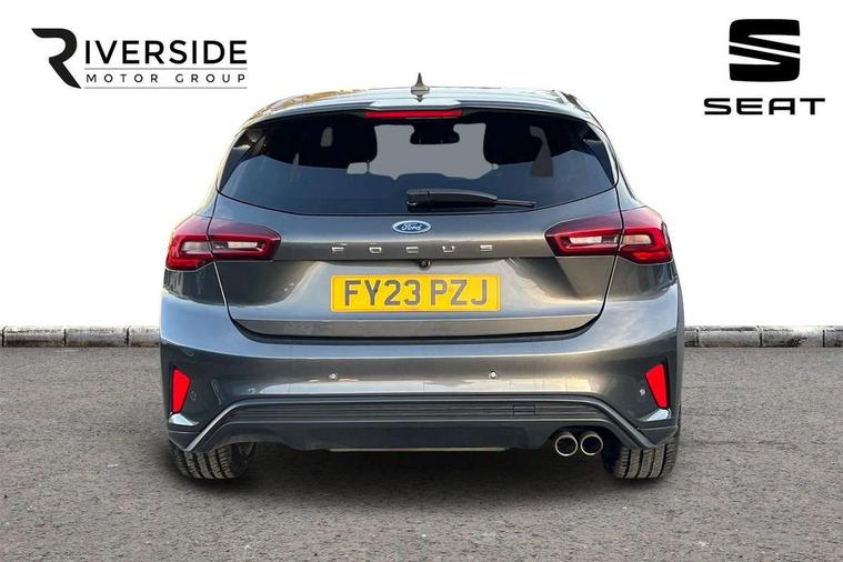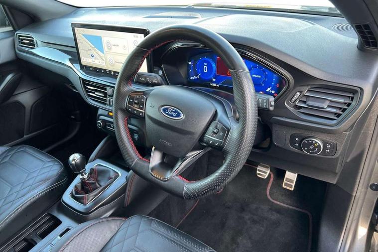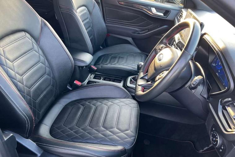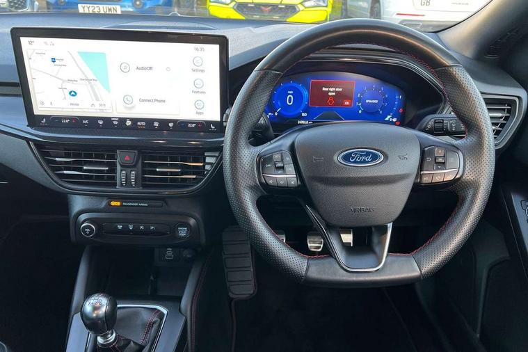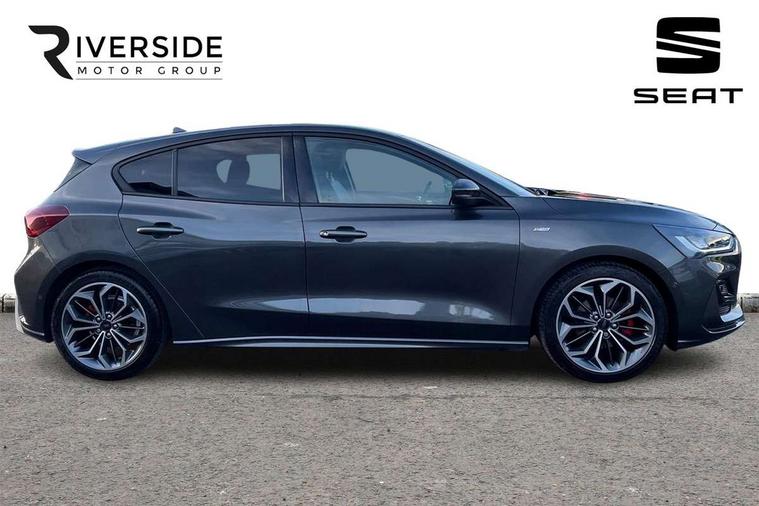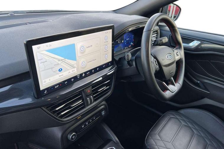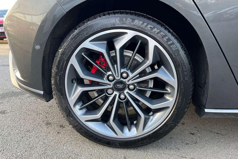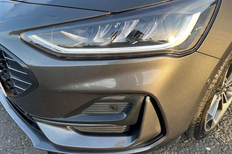 12.3" Digital instrument cluster, Bluetooth system, Digital clock, Easy fuel capless refuelling system, Eco mode, Ford SYNC4 Nav with 13.2'' touchscreen, DAB, Emergency Assistance, Apple Carplay & Android Auto, B&O Premium Audio with 10 speakers, FordPass Connect, Lane keeping system - lane keeping alert and lane keeping aid, PAS, Rev counter, Selectable drive mode, Service interval indicator, Trip computer, Wireless charging pad, Sports tuned suspension, 2 USB ports, Auto headlamps (on/off), Body coloured door handles, Electrically operated front and rear windows with one touch opening and closing, Electrically operated heated power fold door mirrors with puddle lamp with side indicators, Front variable intermittent wipers with electric wash, Heated rear window, LED daytime running lamp, LED rear lamps, LED third brake light, Polished twin tailpipe, Privacy glass, Quickclear heated windscreen, Rain sensor, Rear side wing doors, Tailgate wash/wipe, Unique ST-Line grille, full bodystyling kit, and large body coloured rear spoiler, 3 rear headrests, 3 seat bench in 2nd row, Dual zone electronic air temperature control, Full sensico premium upholstery, Height adjustable front headrests, Isofix child seat preparation, Load through ski hatch, Manual 4-way passenger seat adjusts, Power 4-way driver seat adjust, with power lumbar adjust, Reach + rake adjustable steering column, Single front passenger seat, Winter pack - Focus, 3x3 point rear seatbelts, ABS+Electronic Brake force Distribution, Auto hold function, Driver airbag, EDL traction control, Electronic parking brake, Electronic stability control, Front and rear seatbelt reminder, Front inertia reel height adjustable seatbelts with pre-tensioners, Front passenger airbag, Front side airbags, Passenger airbag deactivate switch, Post collision braking, Pre collision assist with autonomous emergency braking and pedestrian/cyclist detection, Red brake calipers, Remote/power child rear door locks, Side curtain airbags, Three rear inertia reel lap/diagonal seatbelts, Tyre pressure monitoring system, Keyless entry and keyless start, MyKey system, Remote central locking & engine immobiliser, Thatcham alarm with power door dead locks, 18" 5x3 spoke pearl grey high gloss machined finish alloy wheels with mini spare wheel,