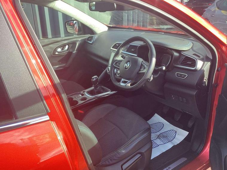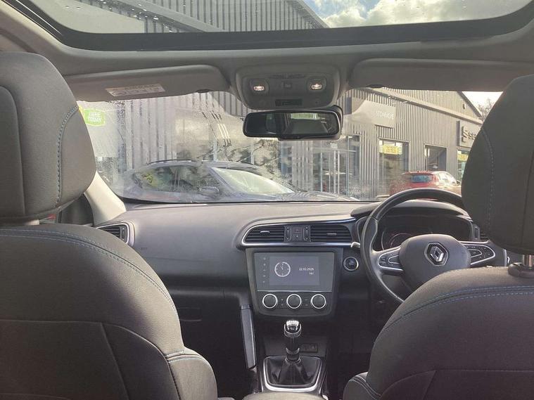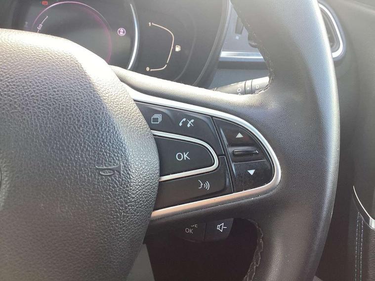 Cruise control + speed limiter, Digital speedometer with 7 TFT screen, Door/boot open warning light, Eco mode, Exterior temperature indicator, Front and rear parking sensors with rear parking camera, Gear change indicator, Lane departure warning system, Low fuel level warning light, Multi function trip computer, Oil level gauge, PAS, R-Link 2 Multimedia system + 7" touchscreen, TomTom + West European Map, DAB/FM/AM radio, bluetooth + hands free, USB/AUX, voice control, Rev counter, Smartphone integration, Diesel particulate filter, 4x35W speakers with 3D sound, Fingertip controls for audio system, Two rear USB sockets, Auto dimming rear view mirror, Automatic headlights, Automatic high/low beam, Automatic windscreen wipers with variable speed adjustment, Body colour door handles, Body coloured bumpers, Body coloured door mirrors, Bodyside mouldings with chrome inserts, Chrome fog light surround, Chrome roof rails, Chrome window surround, Electric adjustable/heated/folding door mirrors, Extra tinted glass in rear windows and tailgate, Fixed panoramic glass sunroof, Front and rear electric windows, Front and rear towing rings, Heated rear windscreen, Integrated C shape indicators with side repeaters, Integrated fuel filler cap, LED daytime running lights, LED front fog lamps with cornering function, LED high and low beam headlights with LED turn indicators, Rear wiper, Saturn grey front and rear skid plates, Shark fin antenna, Side and boot kick plates, 12V socket in front, 3 height adjustable rear headrests, 3 seat rear bench, 3D TEP fabric with synthetic leather upholstery with blue top stitching, 60/40 split folding rear seat, Accessory power point, Adjustable dashboard illumination, Air recirculation system, Centre rear armrest with cup holder, Driver sunblind with illuminated mirror and ticket holder, Driver's seat with lumbar adjustment, Driver/passenger reading lights, Dual zone automatic climate control, Easy life quick folding rear seat, Front courtesy lights, Front footwell illumination, Front/rear floor mats, Height adjustable driver's seat, Height adjustable front headrests, Height adjustable passenger seat, Height/reach adjust steering wheel, Illuminated boot, Illuminated centre console, ISOFIX child seat anchorage points attached on outer rear seats, Multi positional boot floor, Pollen filter, Rear courtesy lights, Rear passenger air vents, Sliding front centre armrest, Storage glovebox, Synthetic leather steering wheel, ABS/EBD, Driver/passenger 2 stage auto adaptive airbags, Electronic parking brake, Emergency brake assist, ESP with ASR and UCL (understeer control logical), Front and rear curtain airbags, Front lateral airbags, Front seat belts warning, Height adjustable front seatbelts with double pretensioners, Hill start assist, Manual passenger airbag deactivation function, Rear seatbelt warning indicator, Side impact protection, Three point rear center seatbelt, Traction control, Tyre pressure monitor, 3 Button retractable key, Anti-drill door locks/ignition barrel, Deadlocks, Insurance approved Cat 1 alarm system, Insurance Approved Immobiliser, Key card hands free with walk away lock function, RAID (Renault Anti-Intruder Device) with automatic door locking, Remote central locking, 19'' Zeus diamond cut alloy wheels,