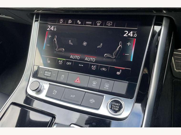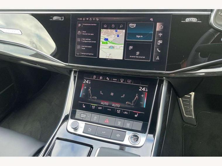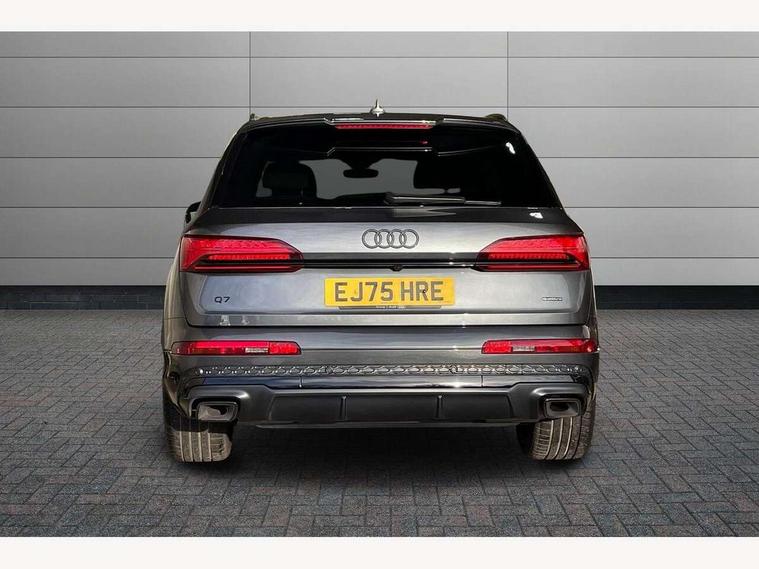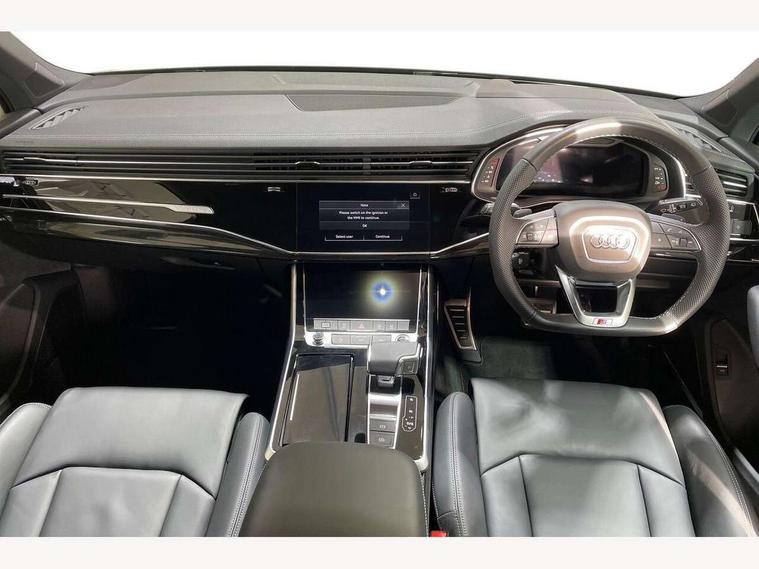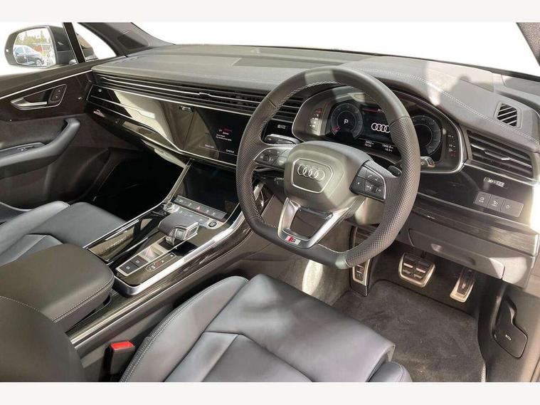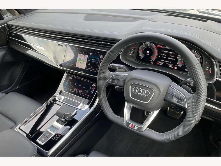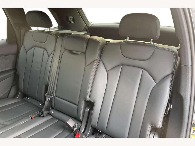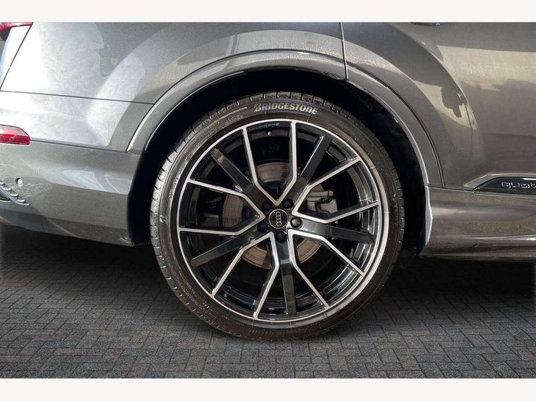Audi connect safety and service (e-call), Audi connect with Amazon Alexa Integration, Audi drive select (Auto, Comfort, Dynamic, Efficiency, Individual, Off-road and All road), Audi phone box light with wireless charging, Audi virtual cockpit - 12.3" high-resolution LCD display with fully customisable instrument cluster, Bluetooth interface, Camera based traffic sign recognition, Electromechanical power steering, MMI navigation plus with MMI touch screens includes 10.1" and 8.6" screens with haptic feedback, Natural voice recognition, Operating buttons in Matte black, Parking system plus with 360 degree display (front, rear and side sensors) - acoustic and visual park assist system, Power operated tailgate, Rear view camera, Smartphone interface includes wireless Apple carplay/Android Auto, Start/stop system, 48V Mild hybrid technology, Adaptive air sports suspension, Quattro all wheel drive with self locking centre differential, Audi music interface - front 2 USB-C ports with charger and data functions, Audi sound system with 6 channel amplifier, 180 watt amplifying capacity and 10 loudspeakers including subwoofer, DAB digital radio module, Aluminium window trim, Audi Beam uses LEDs to project S emblem with red rhombus onto the ground when opening the side doors (front/rear), Auto dimming frameless rear view mirror, Black exhausts, Black roof rails, Electrically adj heated/folding + automatically dimming exterior mirrors with memory + automatic kerb side function for passenger side exterior mirror, Heat insulating glass in windshield, Integrated LED indications in door mirrors, LED 3rd brake light, LED daytime running lights, LED rear tail lights, Loading edge protection in stainless steel, Matrix LED headlights with dynamic front and rear indicators, Privacy glass - dark tinted rear and rear side windows from B-pillar backwards, Rear side wing doors, Rear wiper, 2 seat bench in 3rd row, 2 zone automatic climate control, 3 seat bench in 2nd row, 7 seat layout with ISOFIX points for the front passenger seat and rear passenger seat, Black carpets, Black cloth headlining, Comfort front centre armrest, Electric adjustable front seat with 4 way lumbar support, driver memory functionality, Folding rear seats, Front head restraints, Front/rear floor mats, Heated front seats, Illuminated door sill trims with S logo, ISOFIX child seat mounting for front passenger seat and 2 outer rear seats with top tether child seat mounting for all 3 rear seats, LED interior ambient lighting, Luggage compartment cover, Luggage compartment sill protection in stainless steel, Rear head restraints, Rear seat bench plus for the second row, with forwards/backwards sliding adjustment and backrest angle adjustment, Single front passenger seat, Stainless steel pedals, Sunvisors with illuminated vanity mirrors, Black styling pack plus - Q7, 3 point seatbelts on all rear seats, Audi pre sense basic, Audi pre sense front, Child locks on rear doors, Convenience key with safelock and gesture tailgate, Driver and front passenger, front side and curtain airbags, Electromechanical parking brake, Electronic Stabilisation Control (ESC) including ABS, ASR and EDL, Extended pedestrian protection measures, Hill hold assist, Seatbelt reminder, Tyre pressure loss indicator, Warning triangle and first aid kit, Anti theft alarm with tow away protection, Anti-theft wheel bolts and wheel loosening detection, Keyless Go, Remote central locking, Black dashboard, Polished oak trim with grey finish inlay, Tool kit, Tyre repair kit,