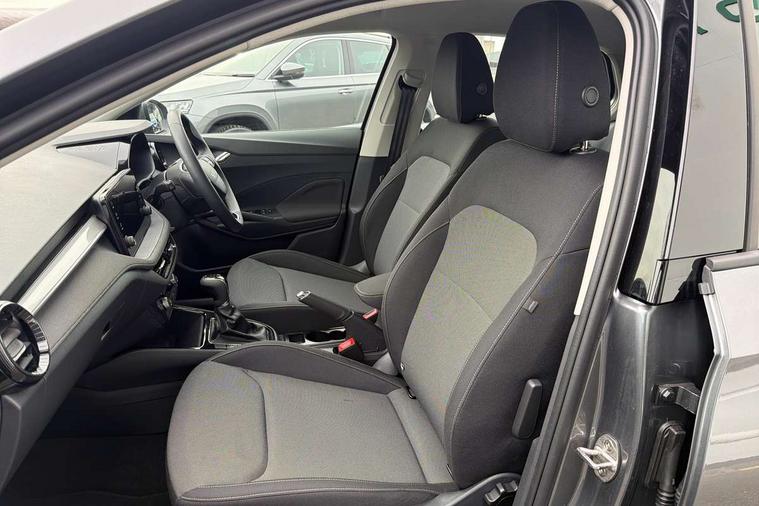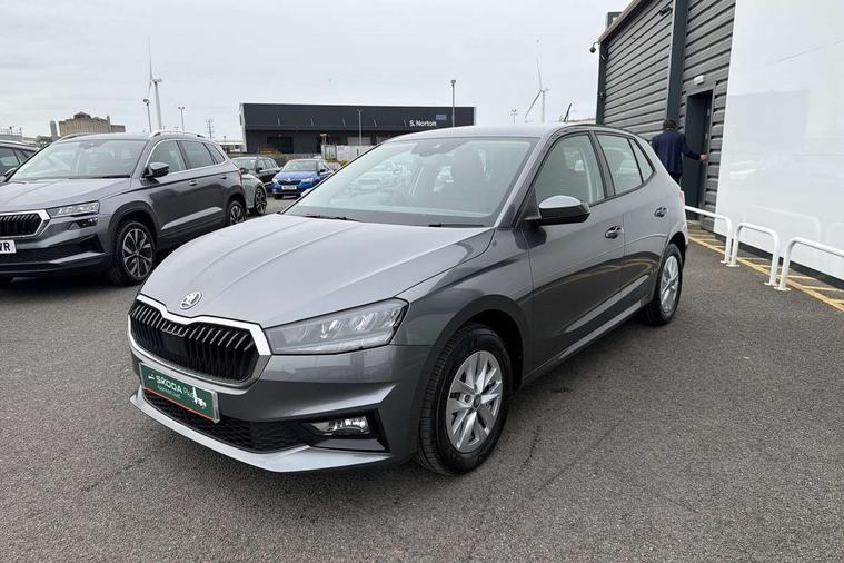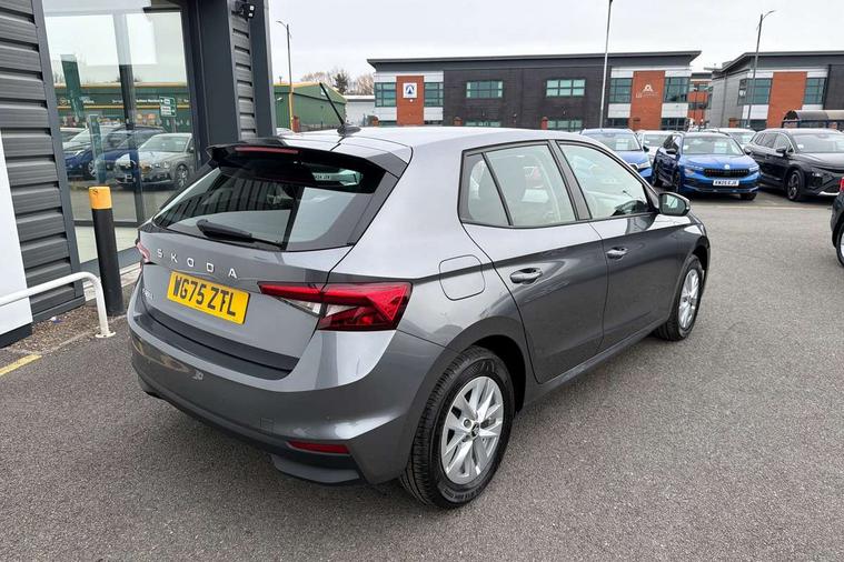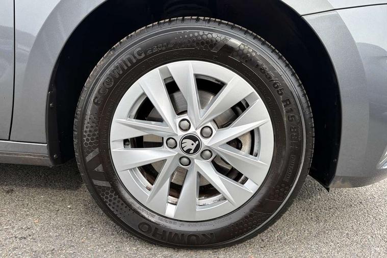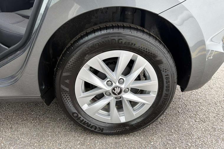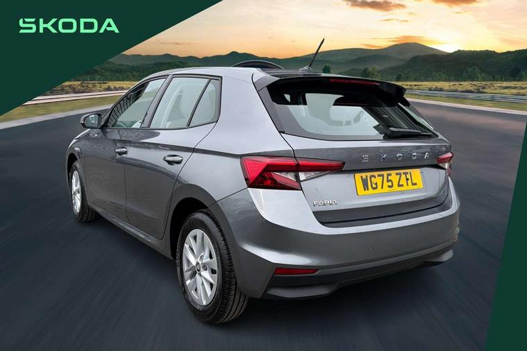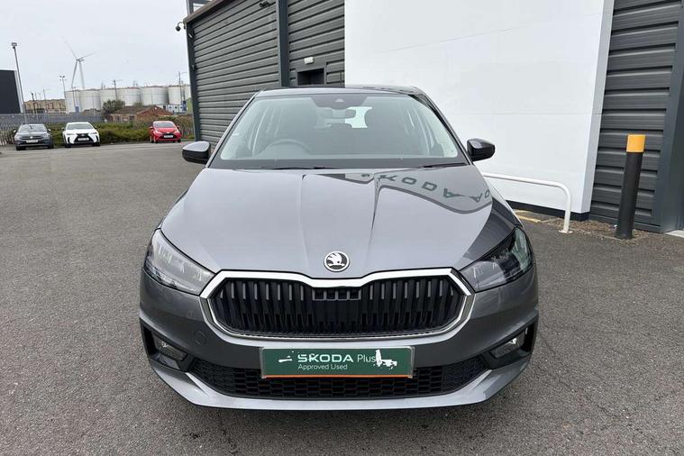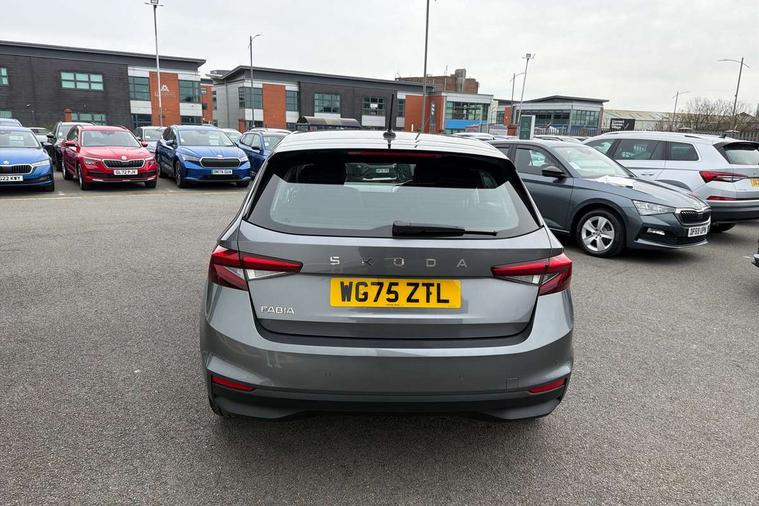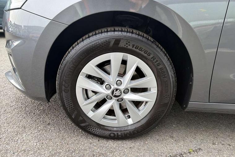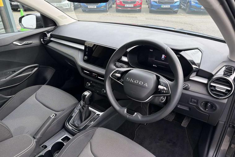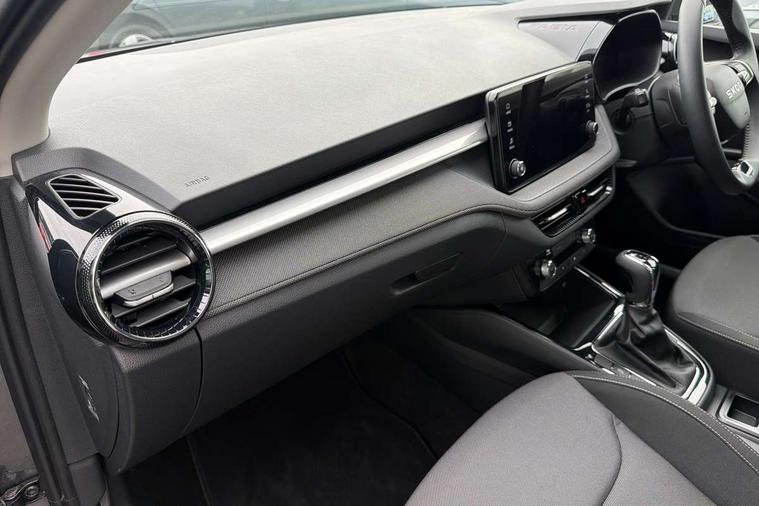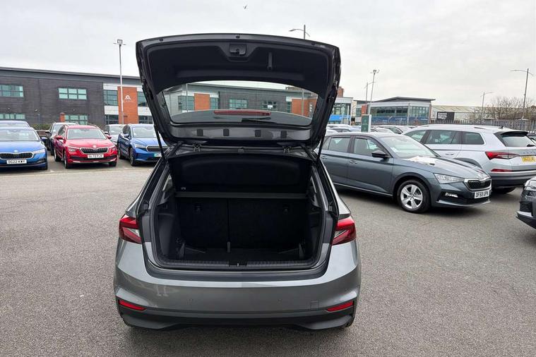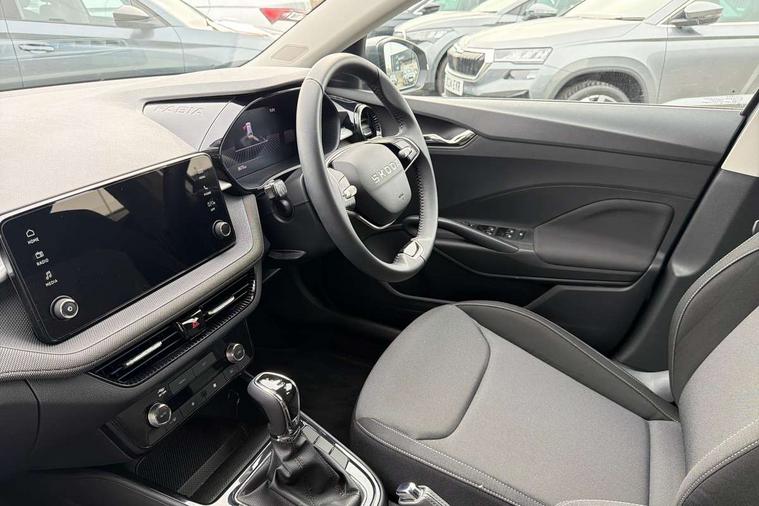 8" Digital instrument display, Advanced driver attention and drowsiness monitor, Bluetooth connection, Driver alert system, Electromechanical power steering, Exterior temperature gauge, Service interval indicator, Traffic sign recognition, Wireless SmartLink for Apple CarPlay and Android Auto, 6 Speakers (4 in front and 2 in rear), 8.25" Skoda infotainment touchscreen display, Auxiliary socket for external MP3 player, DAB digital radio reception, Auto dimming rear view mirror, Body colour door mirrors, Body coloured bumpers, Door mirror integrated indicators, Front and rear electric windows, Front window wiper intermittent control, Headlight range control - Automatic, LED 3rd brake light, LED daytime running lights with coming and leaving home feature, LED rear lights, Rear LED fog light, Rear side wing doors, Rear window wiper with washing nozzles, Roof mounted spoiler, SKODA tailgate lettering in chrome, Unique dark chrome design logo on alloy wheels, 2 reading lights in front and 2 reading lights in rear, 3 rear headrests, Backrest split and folding, Central console with removable cup holder and storage box, Chrome handbrake release button, Dual zone air conditioning with climatronic electronic control, Fabric upholstery, Front centre armrest, Gearshift knob/handle in leather, Grain satin black interior door handles, Hand brake lever handle in leather, Height adjustable front headrests, Height adjustable front seats, Height adjustable steering wheel, ISOFIX and TopTether anchorage points to the outer rear seats, ISOFIX and TopTether on the front passenger seat, Luggage compartment lighting, Manually adjustable lumbar support in front seats, Pollen filter, Rear seat bench unsplit, Single front passenger seat, Skoda lettering on steering wheel, Storm grey headlining, Sun visors with mirror and airbag label on passenger side, Textile floor mats, Ambient lighting pack - Fabia Hatchback, 3-point height adjustable front seats belts with pretensioner and force limiter, Automatic warning lights in case of crash, Driver and passengers airbag with switch off function, e-Call+, ESC including ABS, MSR, ASR, EDS, HBA and XDS, Front and rear seat belt warning, FRONT ASSIST (AEB City and AEB Inter Urban), Front side airbags, Head airbags, Hill hold control, One tone horn, Pedestrian protection, Three rear 3-points safety seat belts with pretensioner and force limiter including stop function for outer rear seat belts, Tyre pressure monitoring system, Anti-theft alarm system including immobiliser, interior monitoring, backup horn, and towing protection, Central locking with radio remote control, interior controls, SAFE function and 2 foldable keys, Black painted air vents, Grain satin black central console cover, Metallic grey upper decorative trim, Satin black door and side trim panel in front, Textile Kota grey lower decorative inserts, Anti-theft wheel bolts protection, Super-low rolling resistance tyres,