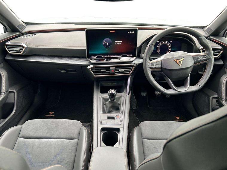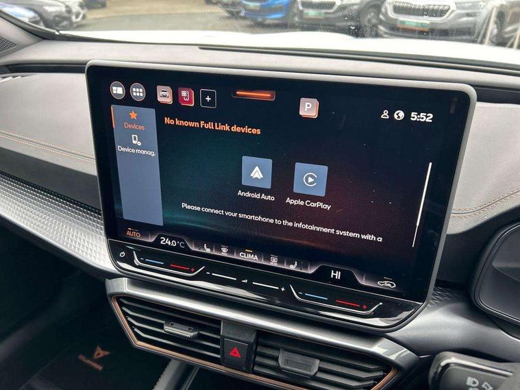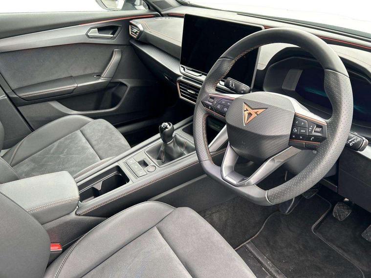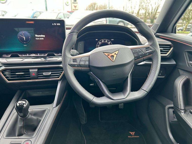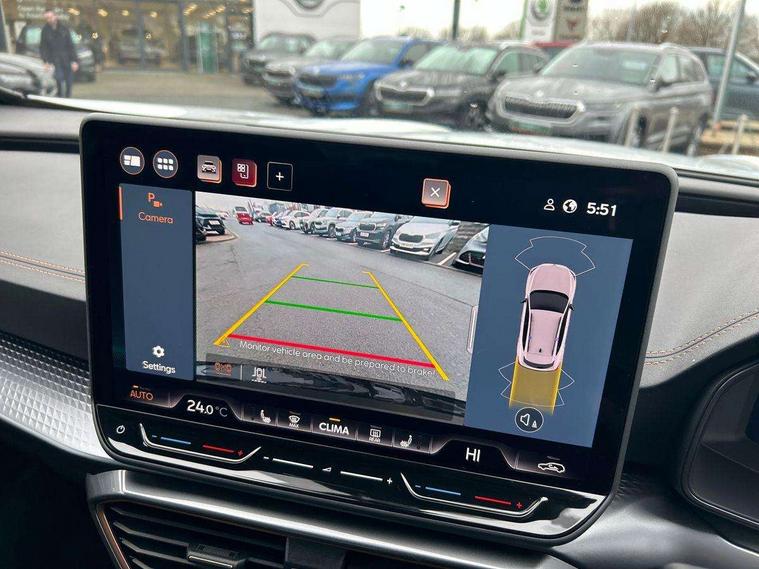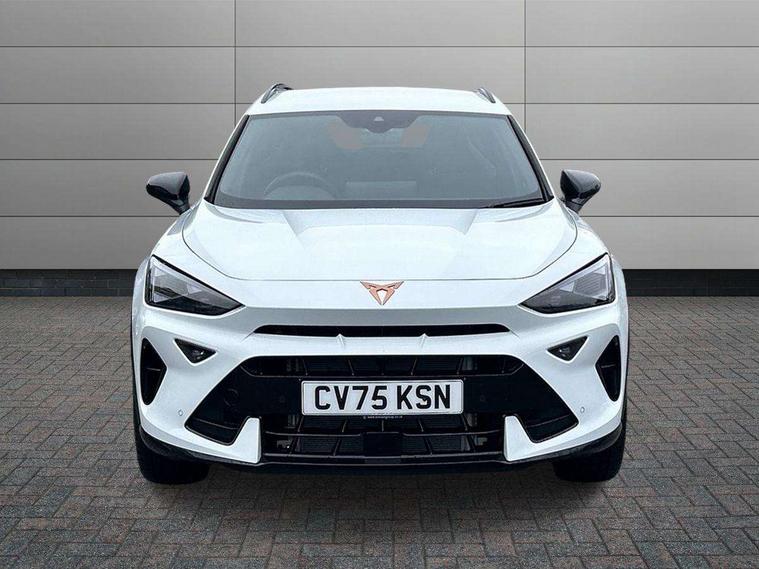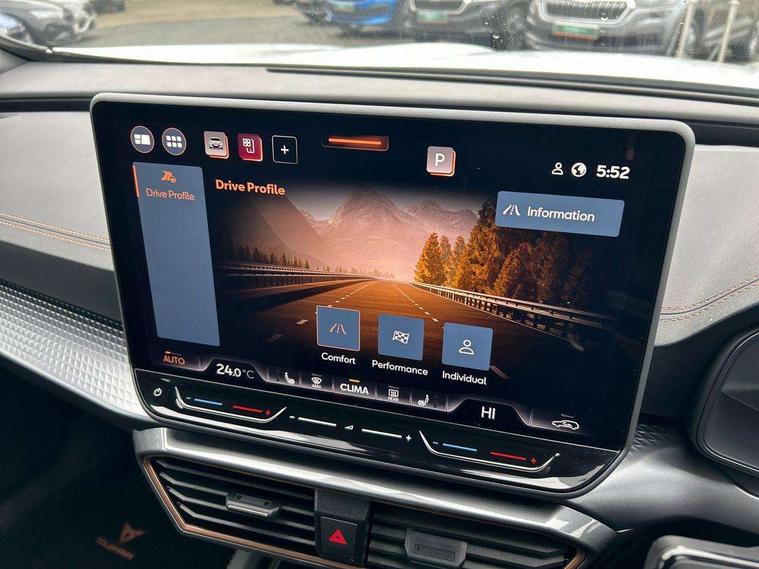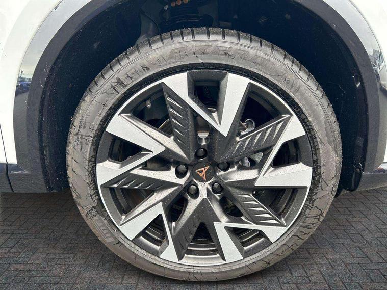 10.25" digital cockpit and configurable dashboard, Adaptive cruise control with follow-to-stop and speed limiter, Advanced driver alert system, Driving profile selection, Dynamic road sign display, Emergency steering support with turn assist, Forward collision warning with automatic braking, Front and rear parking sensors, Front cross traffic assist, Full link phone integration, Lane assist, Progressive steering, Rear view camera, RPM, trip computer, outside temp gauge, instrument light brightness, low fuel warning light, lights on reminder, gearshift indicator, Service interval indicator, Start/stop system with regenerative braking, Virtual pedal and electric tailgate, Voice control system, Wired Android Auto, Wireless apple carplay, Wireless phone charger, CUPRA sport suspension, Electronic locking differential and dynamic traction support, 2 front and 2 rear USB type C sockets, Media system with navigation, 12.9" touchscreen display, voice control, DAB, steering wheel mounted controls, Auto dimming rear view mirror, Body colour door handles, Body coloured bumpers, Dark grey wing mirror, Daytime running light with automatic headlight control and coming home feature, Door panel ambient lighting, Dynamic headlight range control, Electric front/rear windows, Electrically adjustable heated and folding door mirrors with memory function, Gloss black roof rails and window surrounds, High beam assist, LED 3rd brake light, LED front fog lamps with cornering function, LED Taillights with dynamic indicator, Rain sensing wipers, Rear diffuser with black simulated exhaust pipes, Rear fog lights, Rear side wing doors, Rear wash/wipe, Tinted rear windows, Welcome lights (within exterior mirror housing), 12V socket, 2 front and 2 rear reading lights, 3 seat bench in 2nd row, 60/40 split rear bench seat with armrest and mechanical seat release, Black headlining, Black interior roof lining, Dust/pollen filter, Electrically adjustable driver's seat with memory and lumbar support, Front and rear head restraints, Front centre armrest, Heated front seats, Height/reach adjust steering wheel, Illuminated aluminium doorsteps, Illuminated interior front door sills, Illuminated sunvisor with mirror, Isofix, Leather dashboard, door insert and side trim panel, Leather multi function steering wheel, LED smart wraparound lighting, PVC/Dinamica microfiber upholstery + bucket seats, Single front passenger seat, Storage pockets on rear of front seats, Three zone climate control with control panel in rear, Variable luggage/load compartment floor, 3 point seatbelts on all rear seats, ABS, Brake control system - ESC and brake booster, Child proof door locks, Driver and front passenger airbags with front passenger airbag de-activation, Electronic parking brake, Front and rear disc brakes, Front side curtain airbags, Hill hold control, Public e-call, Seat belt reminder for front and rear seats, Tyre pressure monitoring system, Anti theft alarm system, KESSY Advanced - Keyless start, keyless entry with SAFELOCK, Locking wheel bolts, Warranty - 5 years/90, 000 miles, Copper and aluminium interior detailing,
