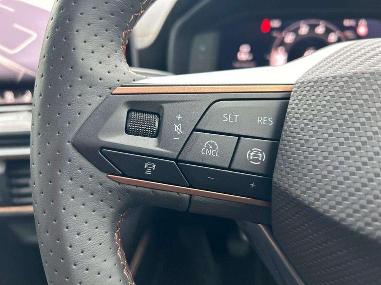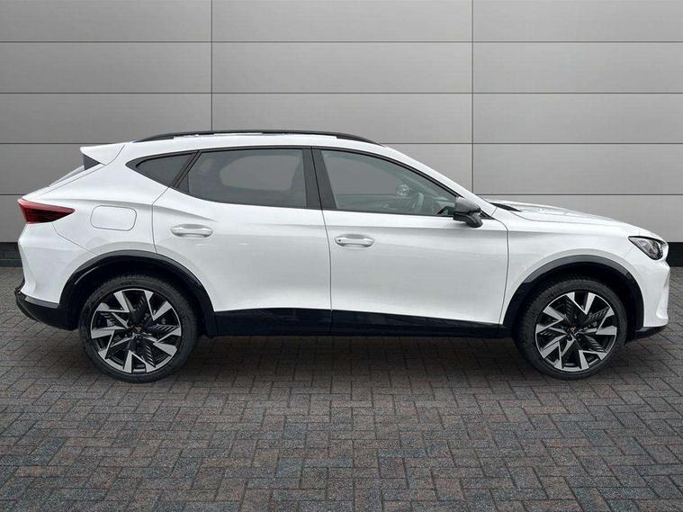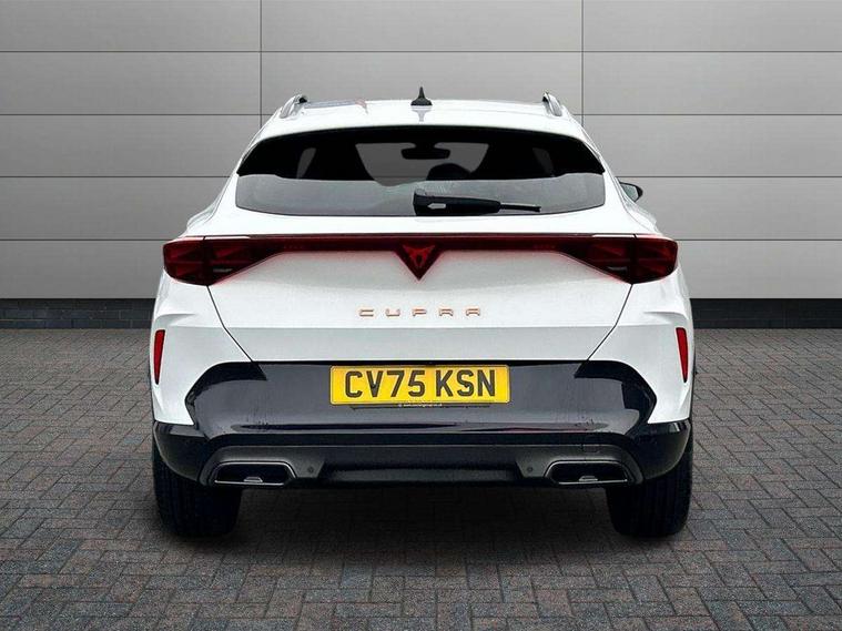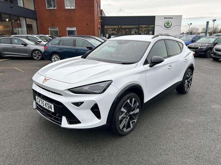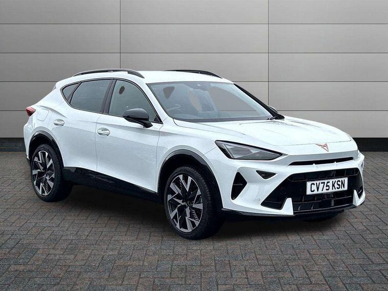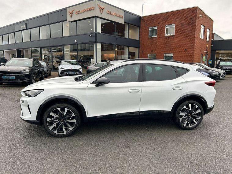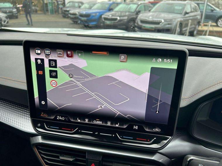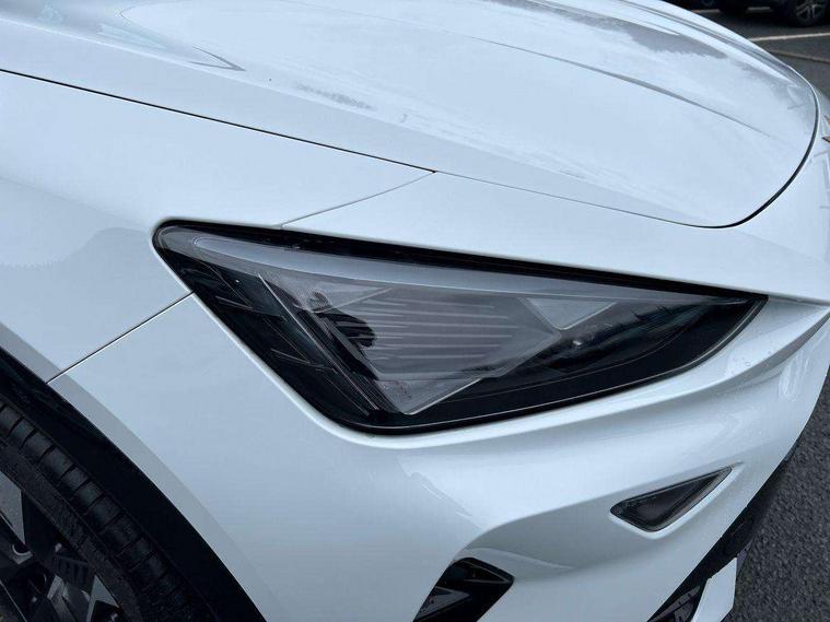 10.25" digital cockpit and configurable dashboard, Adaptive cruise control with follow-to-stop and speed limiter, Advanced driver alert system, Driving profile selection, Dynamic road sign display, Emergency steering support with turn assist, Forward collision warning with automatic braking, Front and rear parking sensors, Front cross traffic assist, Full link phone integration, Lane assist, Progressive steering, Rear view camera, RPM, trip computer, outside temp gauge, instrument light brightness, low fuel warning light, lights on reminder, gearshift indicator, Service interval indicator, Start/stop system with regenerative braking, Virtual pedal and electric tailgate, Voice control system, Wired Android Auto, Wireless apple carplay, Wireless phone charger, CUPRA sport suspension, Electronic locking differential and dynamic traction support, 2 front and 2 rear USB type C sockets, Media system with navigation, 12.9" touchscreen display, voice control, DAB, steering wheel mounted controls, Auto dimming rear view mirror, Body colour door handles, Body coloured bumpers, Dark grey wing mirror, Daytime running light with automatic headlight control and coming home feature, Door panel ambient lighting, Dynamic headlight range control, Electric front/rear windows, Electrically adjustable heated and folding door mirrors with memory function, Gloss black roof rails and window surrounds, High beam assist, LED 3rd brake light, LED front fog lamps with cornering function, LED Taillights with dynamic indicator, Rain sensing wipers, Rear diffuser with black simulated exhaust pipes, Rear fog lights, Rear side wing doors, Rear wash/wipe, Tinted rear windows, Welcome lights (within exterior mirror housing), 12V socket, 2 front and 2 rear reading lights, 3 seat bench in 2nd row, 60/40 split rear bench seat with armrest and mechanical seat release, Black headlining, Black interior roof lining, Dust/pollen filter, Electrically adjustable driver's seat with memory and lumbar support, Front and rear head restraints, Front centre armrest, Heated front seats, Height/reach adjust steering wheel, Illuminated aluminium doorsteps, Illuminated interior front door sills, Illuminated sunvisor with mirror, Isofix, Leather dashboard, door insert and side trim panel, Leather multi function steering wheel, LED smart wraparound lighting, PVC/Dinamica microfiber upholstery + bucket seats, Single front passenger seat, Storage pockets on rear of front seats, Three zone climate control with control panel in rear, Variable luggage/load compartment floor, 3 point seatbelts on all rear seats, ABS, Brake control system - ESC and brake booster, Child proof door locks, Driver and front passenger airbags with front passenger airbag de-activation, Electronic parking brake, Front and rear disc brakes, Front side curtain airbags, Hill hold control, Public e-call, Seat belt reminder for front and rear seats, Tyre pressure monitoring system, Anti theft alarm system, KESSY Advanced - Keyless start, keyless entry with SAFELOCK, Locking wheel bolts, Warranty - 5 years/90, 000 miles, Copper and aluminium interior detailing,