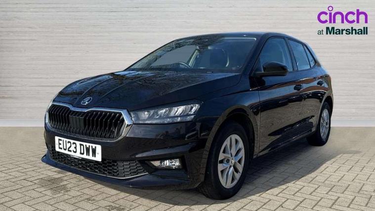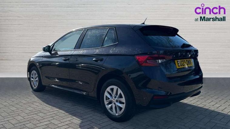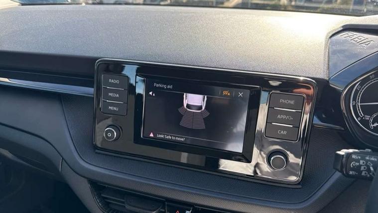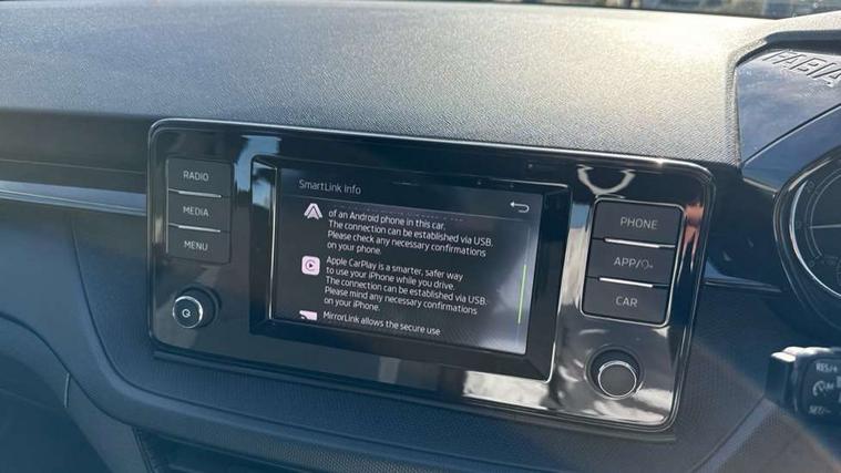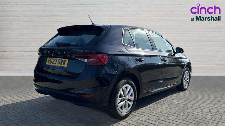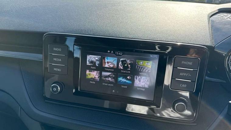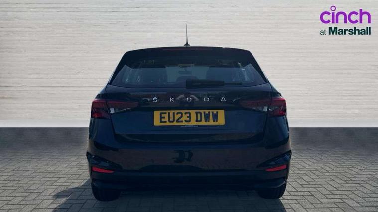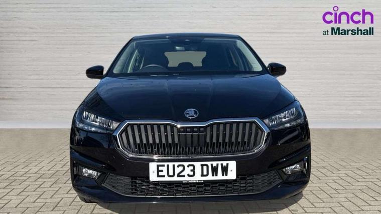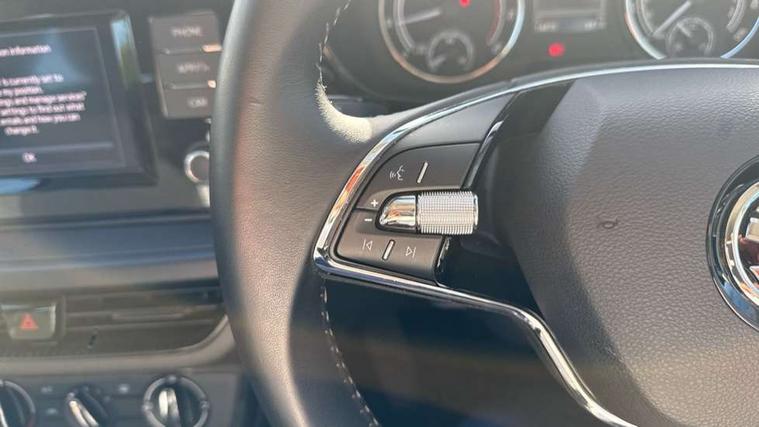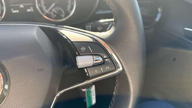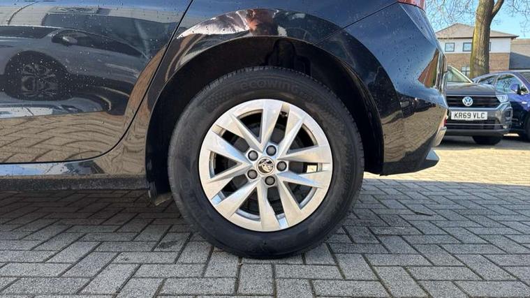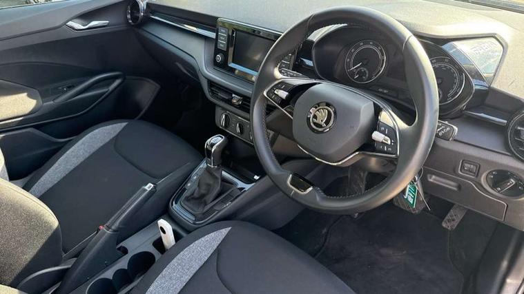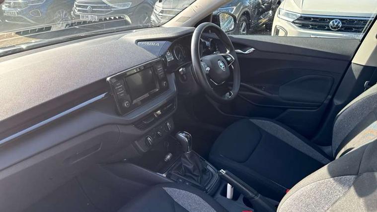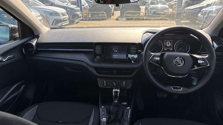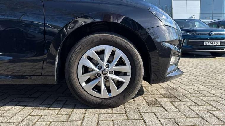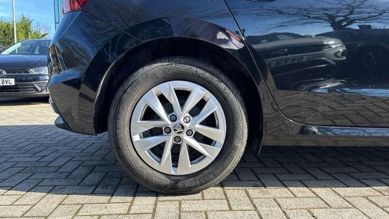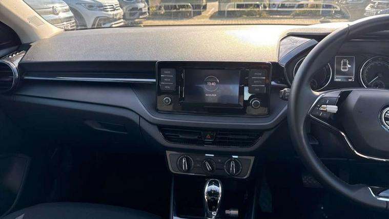 Bluetooth connection, Driver alert system - DAS, Electromechanical power steering, Exterior temperature gauge, Lane assist including road edge detection, Multifunction trip computer in black and white, Service interval indicator, Speed limiter, 2x USB-C in the front (for data transmission and charging), 4 speakers in front, Auxiliary socket for external MP3 player, DAB digital radio reception, Radio Swing with 6.5" colour display, Basic LED Headlights, Basic rear light, Body colour door mirrors, Body coloured bumpers, Dimming rear view mirror with black frame, Door mirror integrated indicators, Electrically adjustable and heated door mirrors, Electrically adjustable front windows with function auto up/down, Front fog lights, Front window wiper intermittent control, Headlight range control - Automatic, Ice scraper in fuel cap, LED daytime running lights with coming and leaving home feature, Mechanical adjustable rear windows, Rain sensor, Rear LED fog light, Rear side wing doors, Rear window wiper with washing nozzles, Roof mounted spoiler, SKODA tailgate lettering in chrome, Third brake light, 2 reading lights in front and 2 reading lights in rear, 2 spoke leather multifunction steering wheel, 3 rear headrests, Backrest split and folding, Central console with fixed cup holder and storage box, Chrome handbrake release button, Fabric upholstery, Gearshift knob/handle in leather, Grain satin black interior door handles, Hand brake lever handle in leather, Height adjustable front headrests, Height adjustable front seats, Height adjustable steering wheel, ISOFIX and TopTether anchorage points to the outer rear seats, ISOFIX and TopTether on the front passenger seat, Luggage compartment lighting, Manual air conditioning, Manually adjustable lumbar support in front seats, Pollen filter, Rear seat bench unsplit, Single front passenger seat, Storm grey headlining, Sun visors with mirror and airbag label on passenger side, Ticket holder, 3-point height adjustable front seats belts with pretensioner and force limiter, Automatic warning lights in case of crash, Driver and passengers airbag with switch off function, e-Call+, ESC including ABS, MSR, ASR, EDS, HBA and XDS, Front and rear seat belt warning, FRONT ASSIST (AEB City and AEB Inter Urban), Front side airbags, Head airbags, Hill hold assist, One tone horn, Pedestrian protection, Three rear 3-points safety seat belts with pretensioner and force limiter including stop function for outer rear seat belts, Tyre pressure monitoring system, Anti-theft alarm system including immobiliser, interior monitoring, backup horn, and towing protection, Central locking with radio remote control, interior controls, SAFE function and 2 foldable keys, Black painted air vents, Glossy black decorative trim, Grain satin black central console cover, Grain satin black lower decorative trim, Satin black door and side trim panel in front, Anti-theft wheel bolts protection, Super-low rolling resistance tyres,