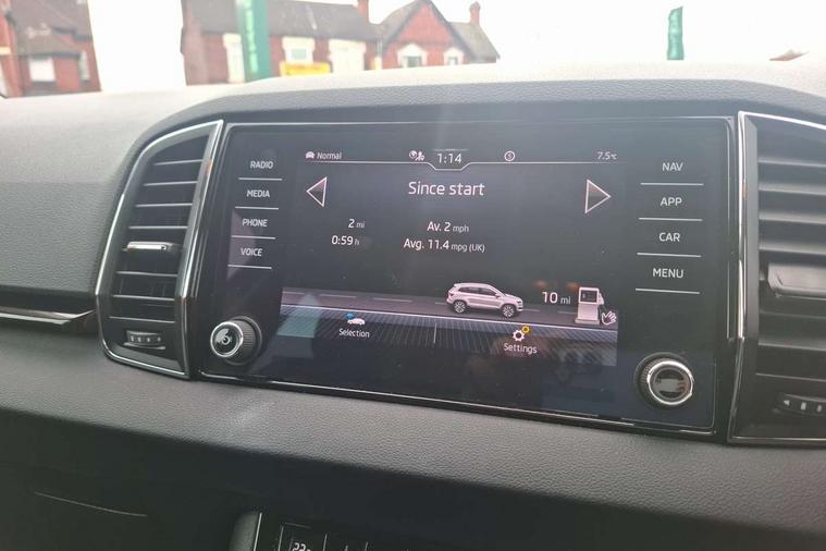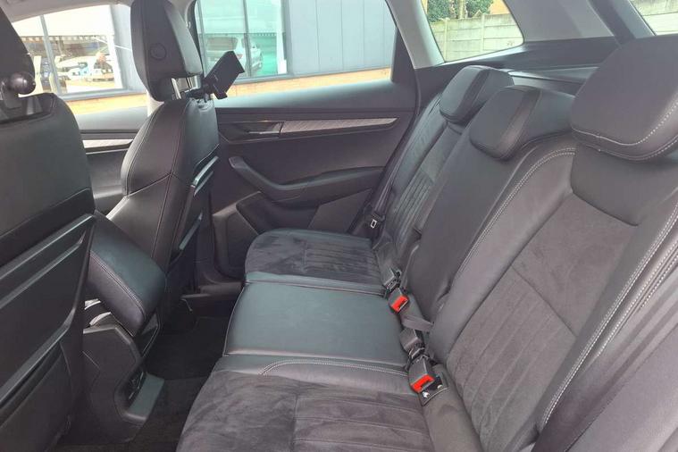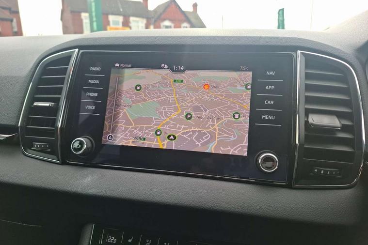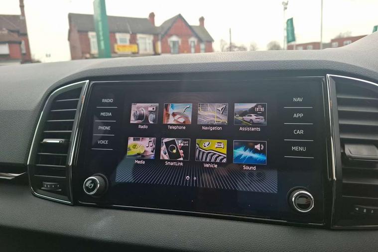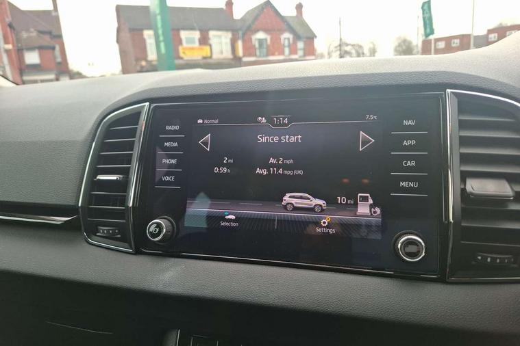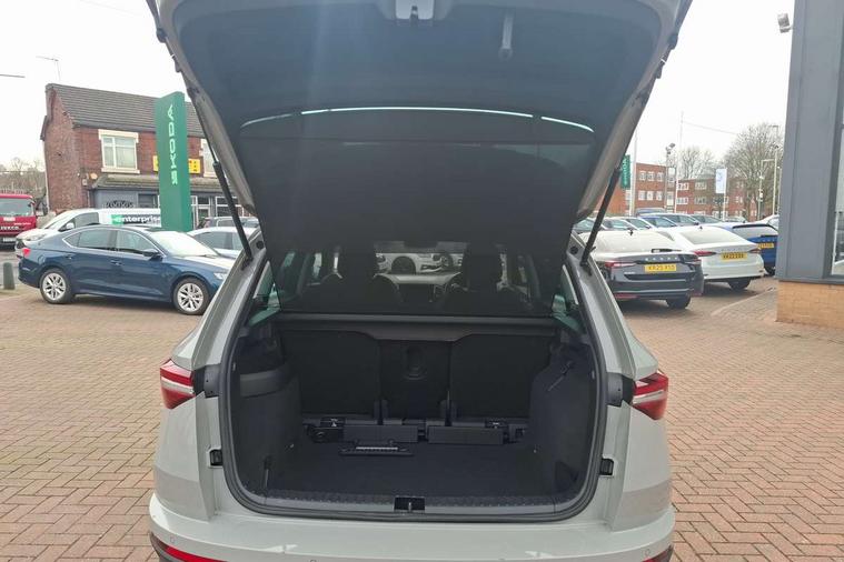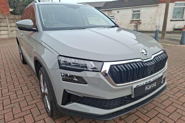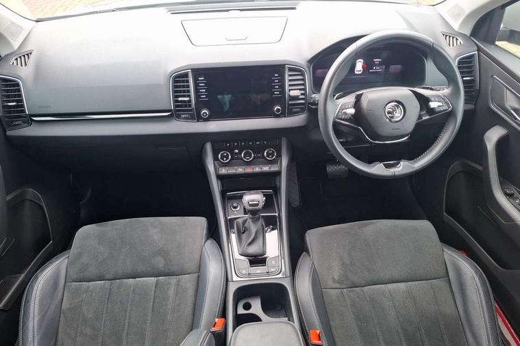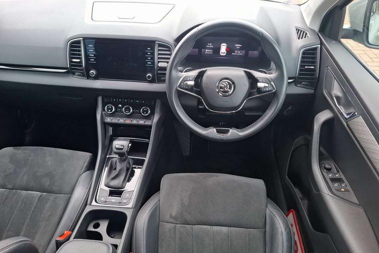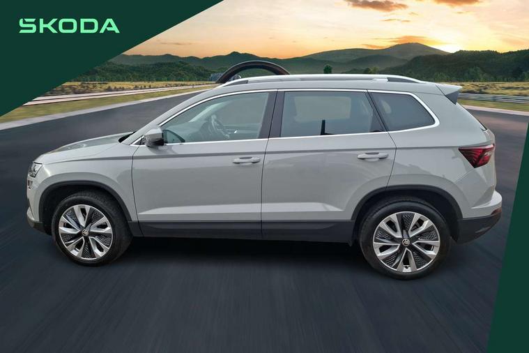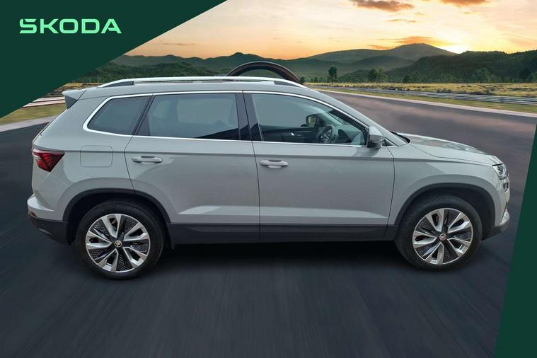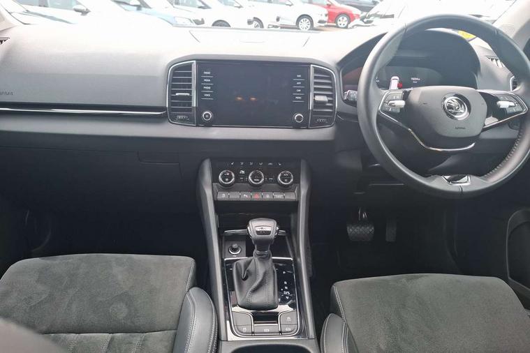 8" Digital display, Care connect, Driver fatigue sensor, Emergency services call system, Outside temperature gauge, Service interval indicator, SmartLink wireless for Apple and wired for Android, Start/stop system with regenerative braking, USB C Port x 2 in front centre console, 8 Speakers, DAB radio with Bluetooth, USB connection, Acoustic glass, Aero front windscreen wipers with intermittent function, Auto dimming rear view mirror with light and rain sensors, Black electric window control buttons, Body colour door mirrors and handles, Dynamic headlight range control with cornering light function, Electric front and rear windows with child proof lock, Heated rear windscreen, LED daytime running lights, LED rear lights with high functionality welcome effect and dynamic indicators, Light assistant (coming/leaving home/tunnel light), Plastic scuff plates, Privacy glass, Rear side wing doors, Rear spoiler, Rear window wiper with washer system and intermittent control, Safety reflectors on front doors, 1.5 litre bottle holders in driver and front passenger door panels, 12V socket in boot, 12v socket in front centre armrest with storage compartment and rear air vents, 2 spoke leather heated multifunction steering wheel with DSG paddles, 2 x Tablet holder, 3 rear height adjustable headrests, 3 seat bench in 2nd row, 4 foldable roof handles with rear coat hooks, Black floor carpet, Chrome inner door handles, Decorative door sills with KAROQ badging, Double sided boot floor, Foldable hooks in the boot, Front head restraints, Height adjustable front three point seats belts with tensioners, Height/reach adjust steering wheel, Ice scraper, Illuminated glovebox, Illuminated luggage compartment, Isofix child seat preparation for front passenger seat, Isofix child seat preparation outer rear, Manual lumbar support for front seats, Pen holder, Pollen filter, Rear boot cover, Rear reading lights, Rubbish bin door, Safety vest holder, Single front passenger seat, Storage box in upper central dashboard closed, Sunvisors with illuminated vanity mirrors, Textile floor mats, Ticket holder, VarioFlex seats with standard rear seat release, Boot pack - Karoq, Chrome roof rails + chrome pack - Karoq, Parking pack - Karoq, Automatic door unlocking in case of crash, Automatic fuel cut off in case of crash, Child locks on rear doors, Driver airbag, Electronic parking brake with auto hold function, Emergency rear braking signal, ESC including ABS, MSR, ASR, EDS, HBA, DSR, RBS, MKB and traction control, Front side airbags, Hill hold control, Knee airbags, Passenger airbag with switch-off function, Pedestrian monitor, Seatbelt reminder signalisation and pretensioner for all seats, Three point seatbelts rear, Two tone horn, Tyre pressure display, Tyre pressure monitor, Alarm with interior monitoring, back up horn and tilt sensor with safe function, Electronic engine immobiliser, Keyless entry and start/stop, Remote central locking with 2 remote folding keys, Chrome framed air vents, 18" Miran alloy wheels in black, Anti-theft wheel bolts protection, Storage on wheel cover, Tool kit,