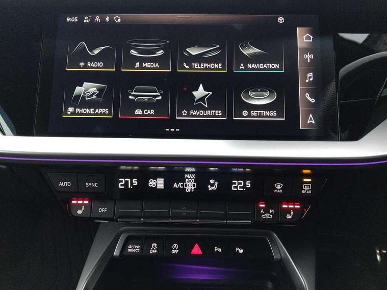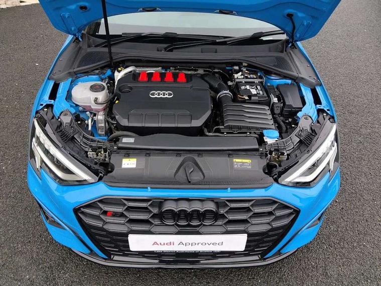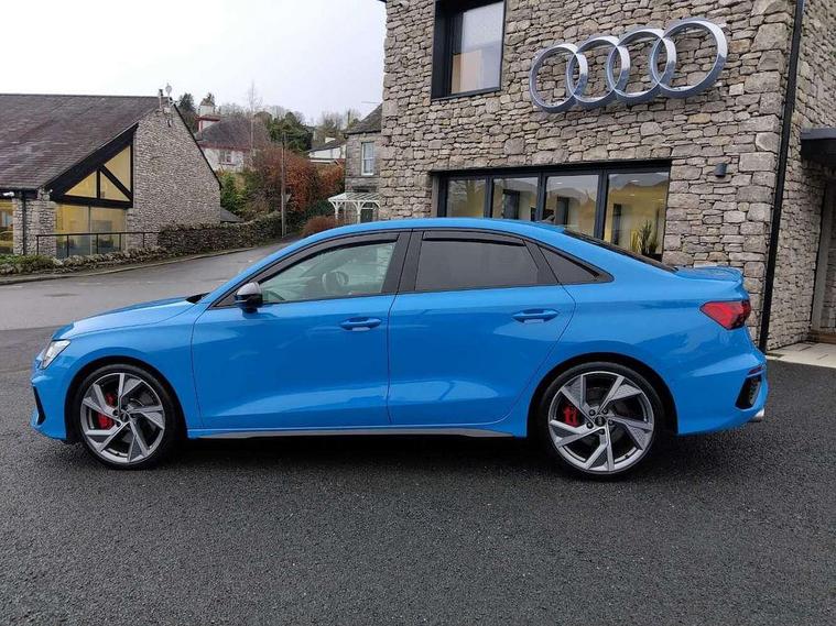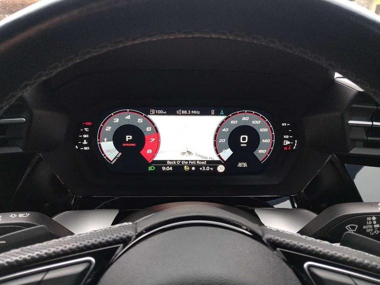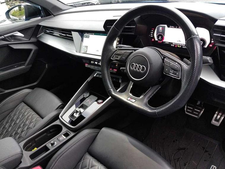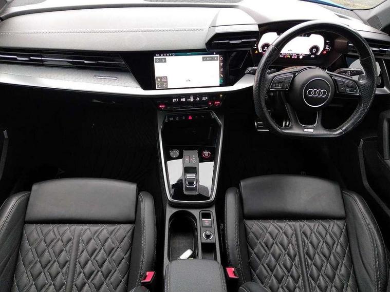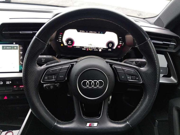 Audi drive select (Auto, Comfort, Dynamic, Efficiency and Individual), Audi smartphone interface, Audi Virtual Cockpit - 10.25" digital and colour instrument cluster, Automatic start/stop system with recuperation, Bluetooth interface, Camera based traffic sign recognition, Collision avoidance assistant, e-Call (emergency call), Lane departure warning system, MMI Navigation Plus with high resolution 10.1" colour touch screen display, Progressive steering, Service indicator, Trip computer, Voice control system with natural language interaction, Quattro permanent all wheel drive, S sport suspension with spring damper adjustment and lowering by 15mm, 2xUSB-C connection with data and charging functions, CD player, DAB Digital radio, 3rd brake light, Acoustic glass windscreen, Audi Beam uses LEDs to project the Audi logo onto the ground as you exit your S3, Auto dimming frameless rear view mirror, Dual branch oval twin tailpipes in chrome plated finish, Electrically adjustable/heated/folding/auto dimming door mirrors with integrated LED indications + kerb view function for passenger side, Front electric windows, Headlight washers, Illuminated door sills with aluminium inserts at the front with S logo, LED daytime running lights, LED headlights with LED rear lights and dynamic rear indicators, Light and rain sensors, Model and engine designation badges at rear, Privacy glass - dark tinted rear window, rear door and side windows, Rear boot, Rear electric windows, Rear side wing doors, 12V socket and storage compartment in front centre console, 3 seat bench in 2nd row, 3 spoke flat bottomed leather multifunction sport steering wheel with gear shift paddles, 4 way electrically adjustable lumbar support for driver and front passenger, 60/40 split folding rear seat bench, Black cloth headlining, Dual zone electronic climate control, Fine Nappa leather upholstery with front sports seats S embossed logo, Front and rear centre armrest in artificial leather, Front and rear headrests, Front/rear floor mats, Height and reach adjustable steering wheel, Interior lighting - glove compartment light and right hand side, Luggage compartment floor covering, Manual boot compartment lid, Manually adjustable front seats, Single front passenger seat, Stainless steel pedals and front footrest in black, Aluminium interior elements pack - A3, Black styling pack - A3 Saloon/S3, Body styling design pack - S3, Extended ambient lighting pack - A3/S3 Saloon, Storage pack - A3/S3 Saloon, Technology pack with parking assist - A3 Saloon, 3x3 point rear seat belts, Driver and front passenger airbag with passenger airbag deactivation, Electronic Stabilisation Control (ESC) including ABS, ASR and EDL, First aid kit with warning triangle and 2 safety vests, Front side airbags with head airbags and interaction airbag, Pre-sense front with pedestrian and cyclist detection, Seatbelt monitoring, Tyre pressure loss indicator, Anti theft alarm, Anti-theft wheel bolts, Electronically operated child locks, Immobiliser, Remote control central locking, Aluminium air vent surrounds, Dark spectrum aluminium inlays, accent surfaces in the dashboard and centre console in platinum grey silk effect paint finish,