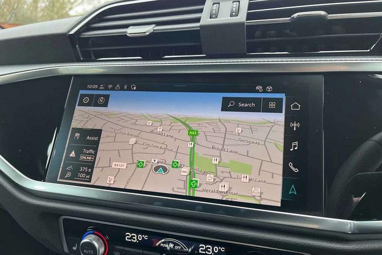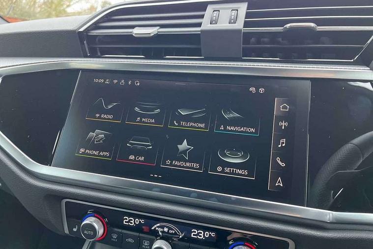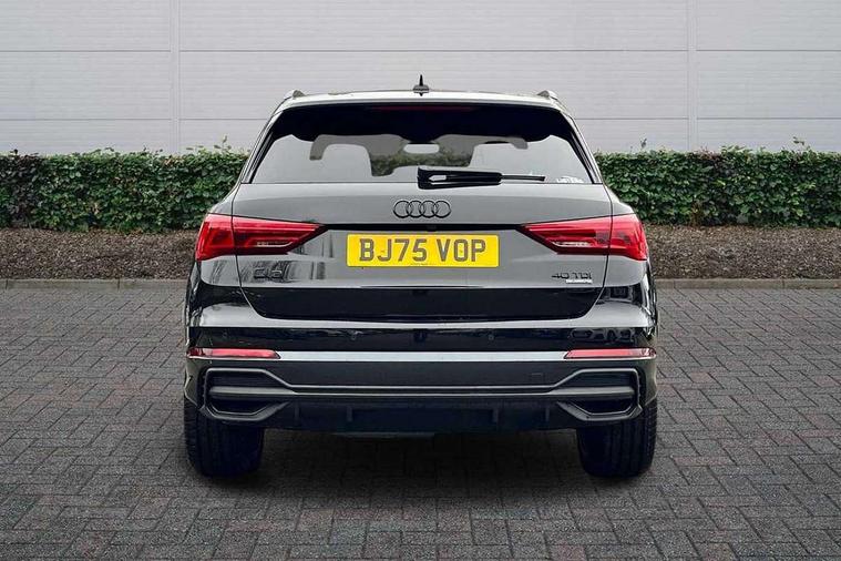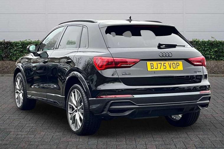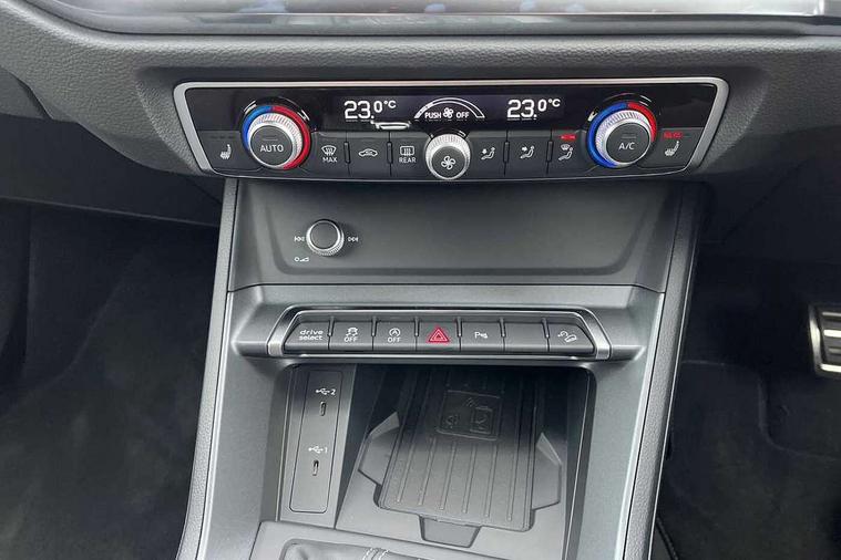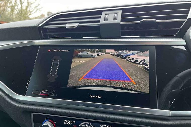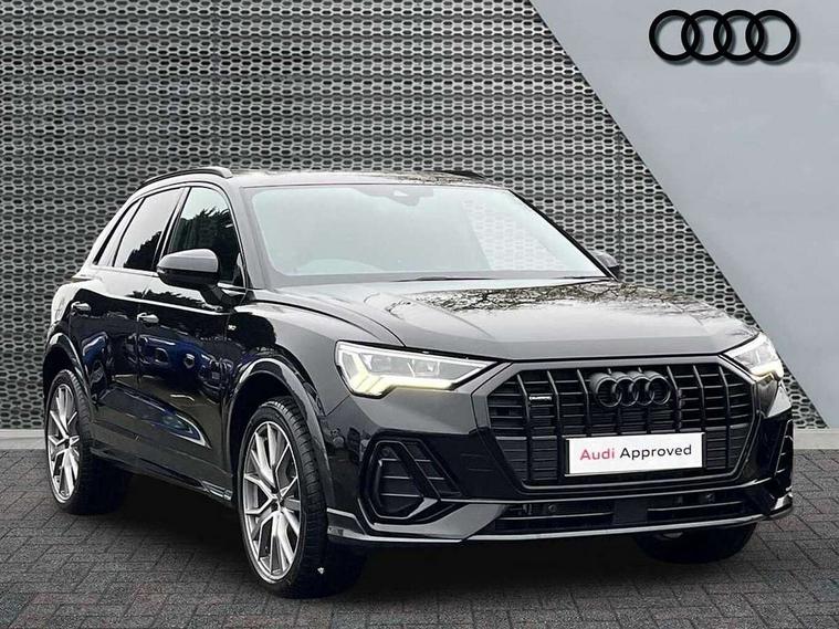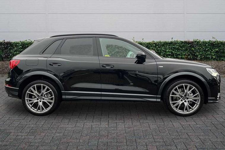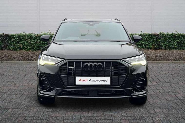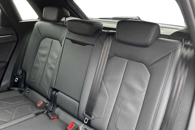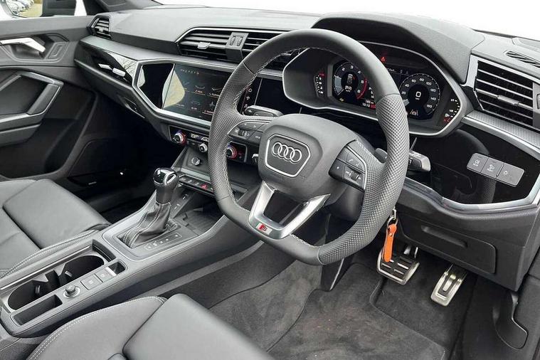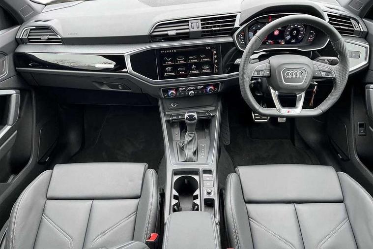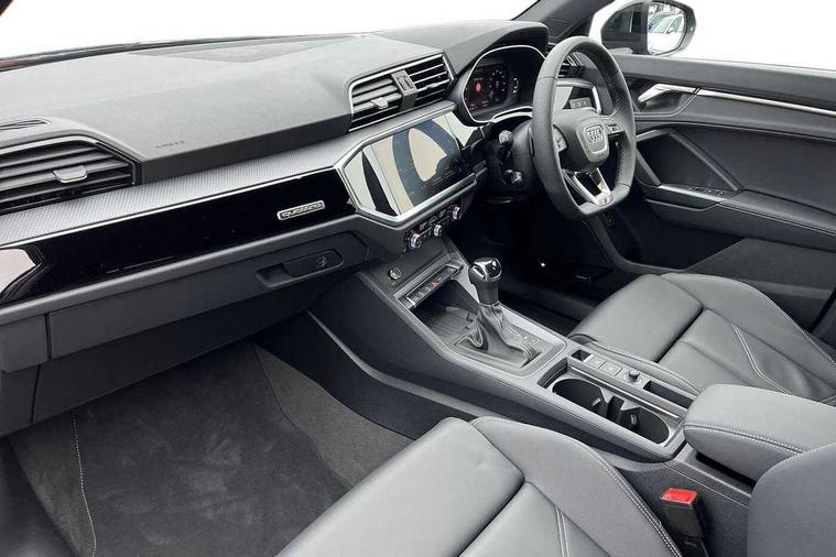 Amazon alexa Integration, Audi connect safety and service, Audi drive select, Audi lane departure warning, Audi Virtual Cockpit - 10.25" display, Bluetooth interface, Camera based traffic sign recognition, Distraction and Fatigue warning, Legal emergency call, MMI Navigation Plus with high resolution 10.1 inch touchscreen colour display, Power operated tailgate, Progressive steering, Service interval indicator, Smartphone interface includes wireless Apple carplay/Android Auto, Start stop system with recuperation, Voice control system with natural language interaction, Diesel particulate filter, Sports suspension, 2 USB-C ports with charge and data functions, 6 passive loudspeakers, DAB digital radio module, Acoustic windscreen, Anthracite black radiator grille, Audi Beam uses LEDs to project the Audi logo onto the ground as you exit your Q3, Auto dimming door mirrors, Auto dimming frameless rear view mirror, Black roof rails, Electrically folding, adjustable and heated door mirrors with integrated LED side indicators and kerb view function for passenger side, Front and rear electric windows, Front fog lights, Grille vertical bars in aluminium silver/Matt, High gloss black finish B and C pillars, LED Dynamic rear indicators, LED headlights with LED daytime running lights, LED rear lights, LED third brake light, Privacy glass dark tinted rear and rear-side windows (from B-pillar backwards), Rain and light sensors, Rear diffuser grille in grained matt black, Rear diffuser strip in matt anthracite black, Rear side wing doors, Rear wiper, S line bumpers in contrasting Manhattan grey, Variable front intermittent wipers, 12V socket in rear centre console, 3 seat bench in 2nd row, 40:20:40 folding with manual adjustment for 60:40 forwards/backwards position and backrest angle, Adjustable rear seat bench/backrest with centre armrest and cupholder, Black carpet mats, Black cloth headlining, Dual zone electronic climate control, Electric lumbar support, Front and rear black floor mats with contrast stitching in rock grey, Front and rear headrests, Front centre armrest, Height and reach adjustable steering wheel, Illuminated door sill trims with S logo, ISOFIX child seat mounting for front passenger with airbag deactivation and outer rear seat including top tether attachment point for outer rear seats, Luggage compartment sill protection in stainless steel, Manual front seats with height adjustment, Perforated leather gearknob, Single front passenger seat, Stainless steel pedals, Twin leather upholstery with front sport seats + S embossing, Black styling pack - Q3, Non smoking pack - Q3, 3x3 point rear seatbelts, 6 airbags - Driver, front passenger, curtain and side windows, Audi pre-sense front with pedestrain and cyclist recognition, Electrically operated child locks on rear doors, Electromechanical parking brake, Electronic stabilisation control including ABS, ASR and EDL, Front seatbelt reminder, Hill descent control, Hill hold assist, Pre sense basic, Seatbelt monitoring, Tyre pressure warning, Warning triangle and first aid kit, Anti theft wheel bolts, Immobiliser, Remote central locking, Thatcham approved category 1 anti theft alarm, Aluminium look interior elements, Detail dashboard around MMI touch colour display in glass look, black with surround in aluminium look, Leatherette door armrest, Piano black inlay,
