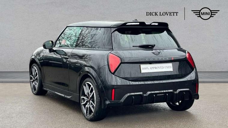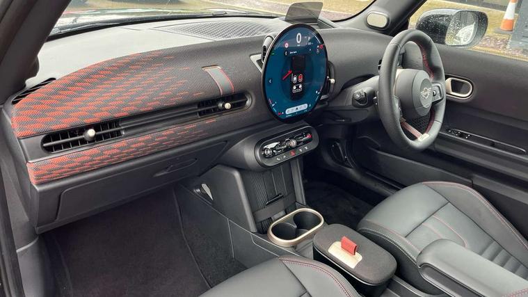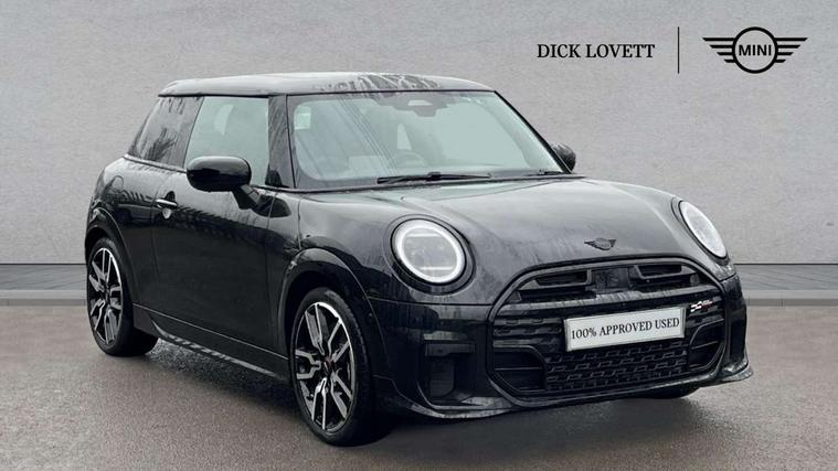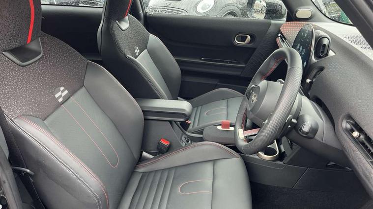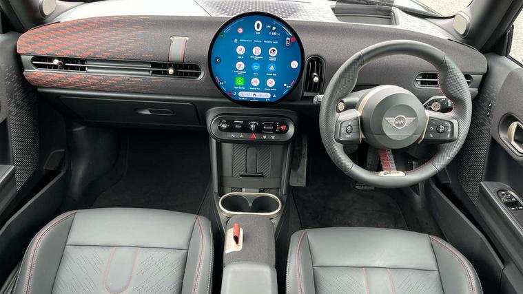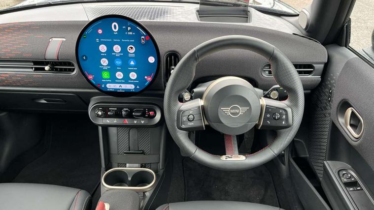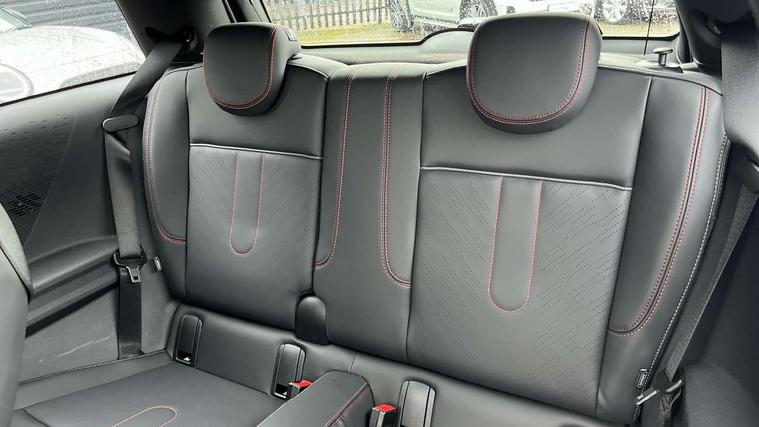 Central toggle bar, Circular OLED Screen, Compatible mobile phone bluetooth with audio streaming, Cruise control, Digital instrument cluster, Electro-mechanical speed dependant steering assistance, Emergency call service, MINI Experience Modes, Mini navigation system, On board computer, Service interval indicator, 7 speed steptronic sport transmission with double clutch, Adaptive suspension, DAB Digital radio, Personal eSim, Auto headlights, Electric adjustable heated door mirrors, Electric front windows, Front and rear apron, Heated rear window, Heated windscreen washer jets, High gloss black wheel arches, High gloss hexagonal patterned grille surround, JCW body kit, LED daytime running lights, LED indicator lights, LED rear lights, Rain sensor window wipers, Rear fog lights, Rear roof spoiler with airblades, Rear window wiper, 2 seat bench in second row, 2 zone automatic air conditioning, 60/40 rear seat bench, Ambient lighting, Cupholders, Dark headliner, Floor mats, Front and rear head restraints, Front compact armrest, Heated steering wheel, Height adjustable passenger seat, Lidded storage box in Black/Red knit, Luggage compartment lighting, Perforated Vescin steering wheel, Single front passenger seat, Steering wheel paddle shift, Sunvisors with vanity mirrors, Vescin/Cord upholstery, Driving assistant pack - Cooper Hatchback, Level 1 pack - Mini Hatchback, Park assistant pack - Cooper Hatchback, 3 point seatbelts on all four seats, 6 Airbags - front, side, head and seat belt tensioners, Acoustic pedestrian protection, Anti-lock braking system (ABS), Brake caliper in Black with JCW badge, DSC - Dynamic Stability Control, Electronic parking brake, Front and rear disc brakes, Front ISOFIX (iSize), Front passenger airbag deactivation, JCW Sport Brakes, Traction control, Tyre pressure monitoring system, Alarm, Immobiliser, Remote central locking, Black/Red decorative dash strap, JCW Black/Red dashboard knit, 18" JCW Lap spoke 2-tone alloy wheels, Tyre repair kit,