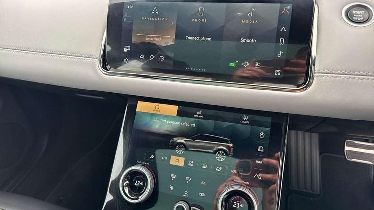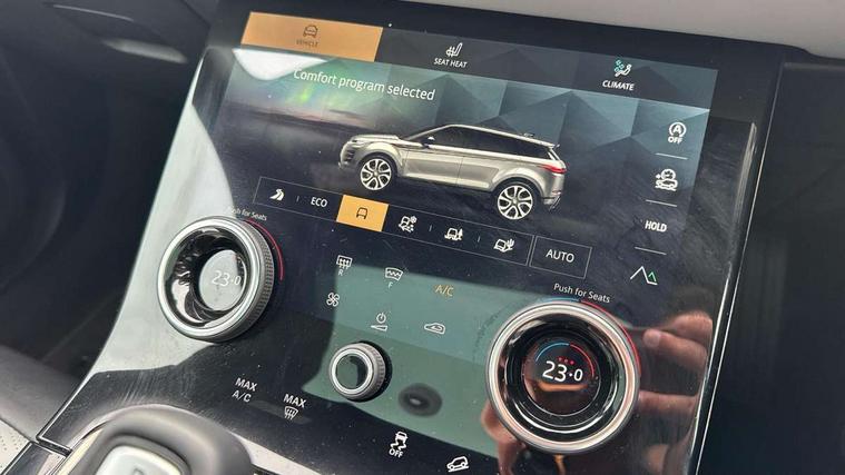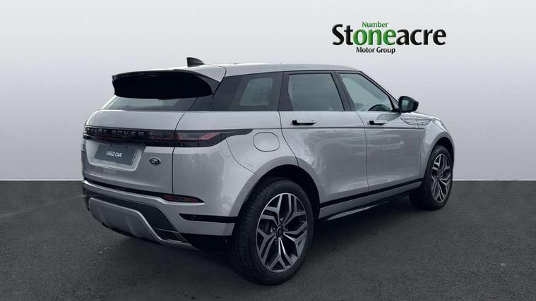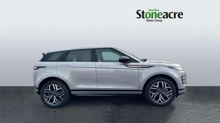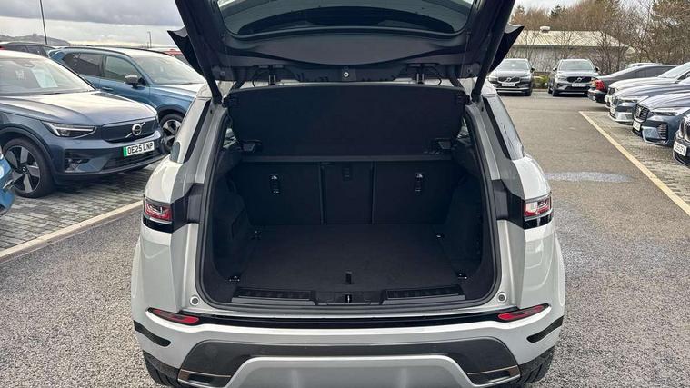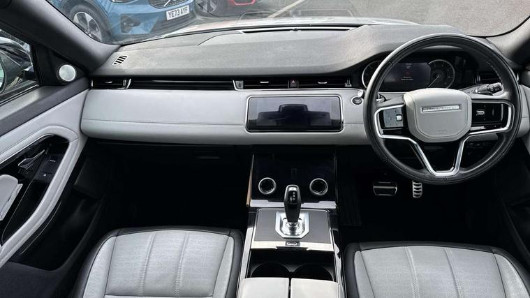 10" deployable touchscreen with lower touchscreen, Adaptive cruise control, Android Auto, Apple car play, Blind spot assist, Bluetooth connectivity, Brake pad wear indicator warning light, Driver condition monitor, eCall emergency system, Electronic power assisted steering (EPAS), Front and rear parking aid, InControl remote, Land Rover InControl apps, Lane keep assist, Pivi pro connected includes upgraded infotainment, connected navigation pro, Nuance speech licence, Push button starter, Rear collision monitor, Rear traffic monitor, Traffic sign recognition with adaptive speed limiter, Voice control system, All terrain progress control, Configurable dynamics, Efficient Driveline, Large fuel tank, Passive suspension, Terrain Response 2 Auto, Digital Audio Broadcast radio-DAB, Meridian surround sound system with 650W subwoofer and 14 speakers, Steering wheel mounted controls, Auto headlights, Automatic headlight levelling, Electric windows with one touch open/close and anti trap, Evoque and R-Dynamic badge, Flush deployable exterior door handles, Heated rear window with timer, Heated washer jets, Heated windscreen, Power fold, auto-dimming, heated door mirrors with approach lights and auto dimming driver side, Rain sensing windscreen wipers, Rear fog lights, Rear side wing doors, Rear wiper, Tailgate spoiler, Third brake light, 40:20:40 split folding rear seats with centre headrest and armrest, Ambient interior lighting, Bright metal pedals, Heated steering wheel, Isofix system on outer rear seats, Overhead lighting console, Overhead stowage for sunglasses, Passive front head restraints, Perforated full leather steering wheel, Rear air vents, Rear centre headrest, Rear head restraints, Satin chrome gearshift paddles, Single passenger seat, Sunvisors with illuminated vanity mirrors, Twin sliding front centre armrest, 3 rear 3 point seatbelts, Anti-lock braking system (ABS), Customer configurable autolock, DSC - Dynamic Stability Control, Electronic brake force distribution, Electronic parking brake, Electronic traction control, Emergency braking, Front and rear seatbelt reminder, Hill descent control, Hill launch assist, Low traction launch, Power operated child locks, Roll stability control, Six airbags - Driver and passenger airbags/driver knee airbag/front side airbag and curtain airbags, Torque vectoring brake, Tyre pressure monitoring system, Alarm, Immobiliser, Intrusion sensor, Keyless entry, Locking wheel nuts,