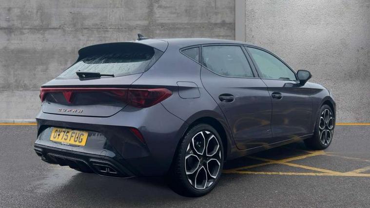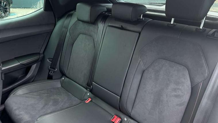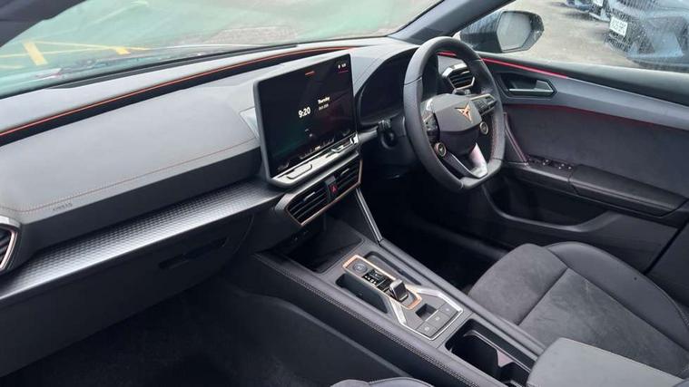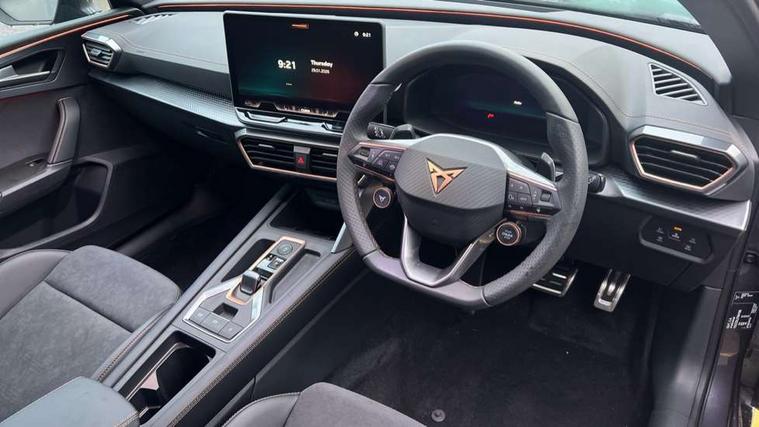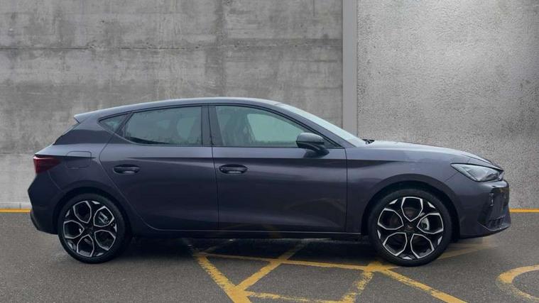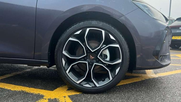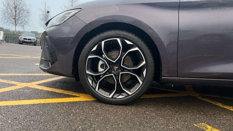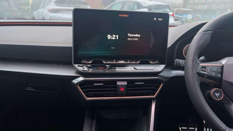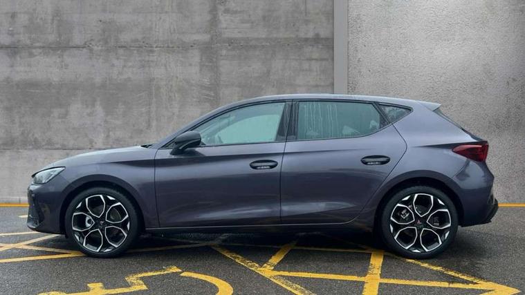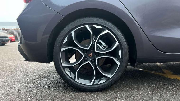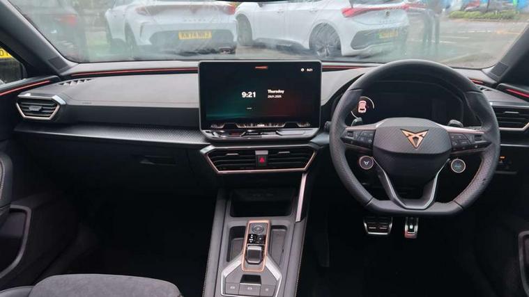 Adaptive cruise control with follow-to-stop and speed limiter, CUPRA drive profile selection with (Comfort/Performance/Individual), throttle response and gearshift mode, Digital cockpit, Driver alert system, Dynamic road sign display, E-call, Front and rear parking sensors, Front assist with forward collision warning braking reaction to vehicles, pedestrians and cyclists, Front cross traffic assist, Full link smartphone integration with Mirror Link, wireless Apple CarPlay and wired Google Android Auto, Lane assist, Lockable tailgate, PAS, Rear view camera, RPM, trip computer, outside temp gauge, instrument light brightness, low fuel warning light, lights on reminder, gearshift indicator, Service interval indicator, Start/stop system with regenerative braking, Wireless phone charger, Dynamic chassis control, Auxiliary input socket, Auto dimming rear view mirror, Body colour door handles, Body coloured bumpers, Cupra sports bumpers, Dark tinted rear windows, Electric front/rear windows, Electrically adjustable, heated and folding door mirrors, High beam assist, LED 3rd brake light, LED front fog lamps with cornering function, LED headlights with dynamic turn signals, tail lights, rear fog lights with rear coast to coast lighting, LED rear fog lamp, Rain sensing wipers, Rear diffuser with black simulated exhaust pipes, Rear side wing doors, Rear wash/wipe, Separate daytime running light with automatic headlight control and coming home feature, Welcome light with logo projector in door mirrors, 12v power supply in centre console, 3 seat bench in 2nd row, 5 headrests, 60/40 split rear bench seat with armrest, Ambient lighting (glovebox, footwell, ambient lighting multicoloured), Black headlining, Cupra sports pedals, CUPRA Supersports, heated steering wheel with satellite buttons, Dinamica cloth upholstery, Electrically adjustable driver seat and lumbar support with memory function + manually adjustable passenger seat, Folding boot cover, Four x USB Type C ports (2 in front and 2 in rear), Front and rear reading lights X 4, Front centre armrest, Heated front seats, Height/reach adjust steering wheel, Illuminated interior front door sills, Interior wraparound lighting, ISOFIX points in outer rear seats with top tether anchorage points, Single front passenger seat, Storage pockets on rear of front seats, Sunvisors with illuminated mirror, Three zone climate control, Media system plus with 12.9" display + navigation pack - Leon Cupra, 3 point seatbelts on all rear seats, ABS, Brake control system - ESC and brake booster, Child proof door locks, Cupra black brake calipers, Disc brakes in front, Driver and front passenger airbags with front passenger airbag de-activation, front side and curtain airbags, Electronic parking brake, Hill hold control, Rear disc brakes, Seat belt reminder for front and rear seats, Tiredness recognition system, Tyre pressure monitoring system, Anti theft alarm system with interior monitoring in cab, backup horn and towing protection, KESSY Advanced - Keyless start, keyless entry with SAFELOCK, Locking wheel bolts, Warranty - 5 years/90, 000 miles, Chrome and copper interior detailing, 19" Mistral machined black and copper alloy wheel with 91Y tyres, Tool kit,