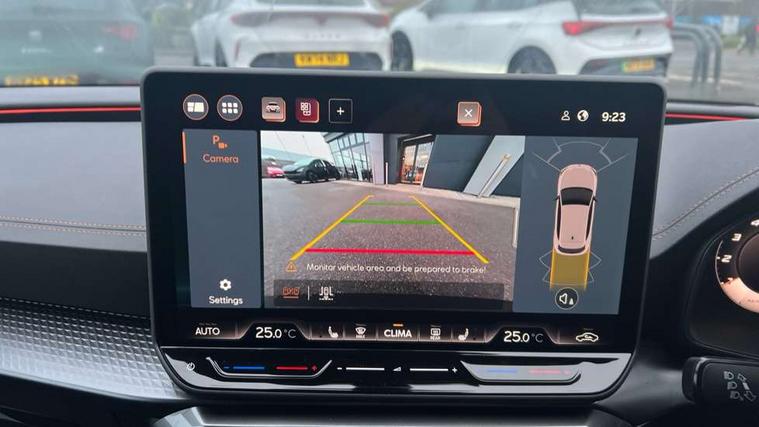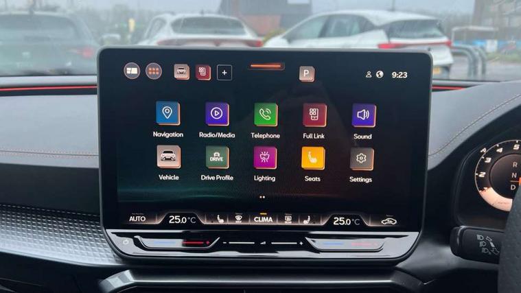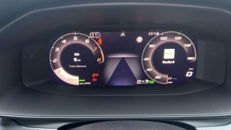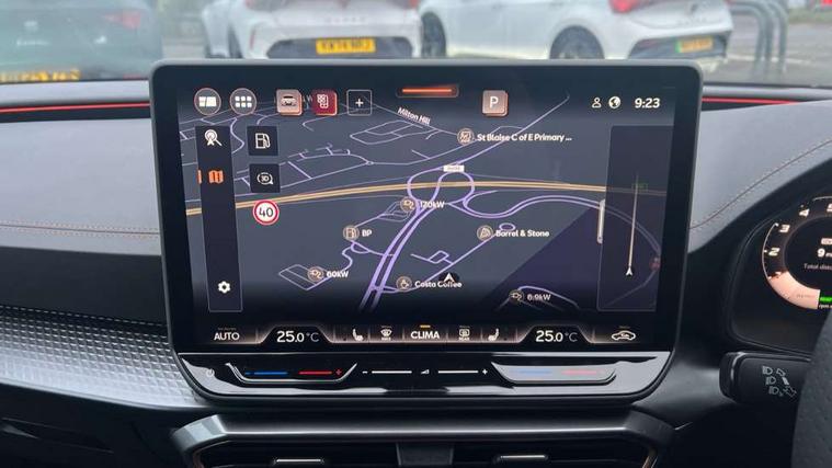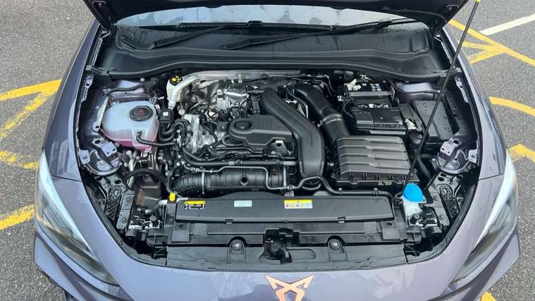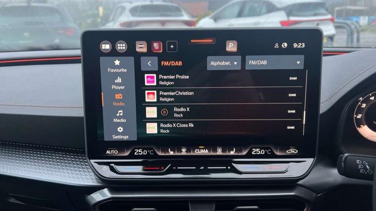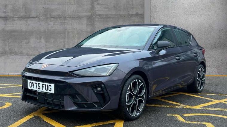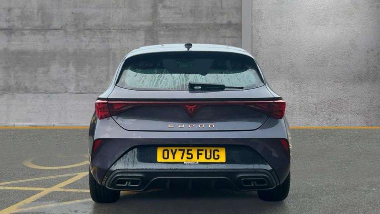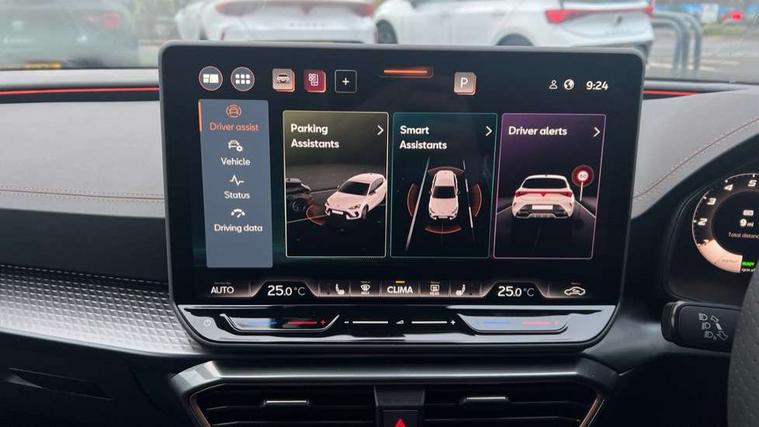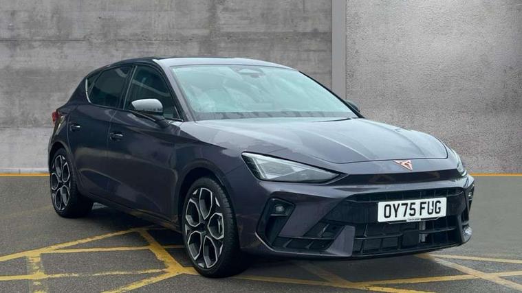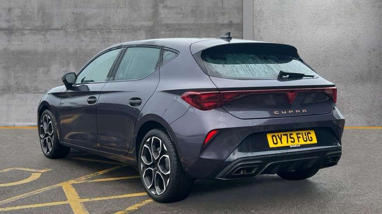 Adaptive cruise control with follow-to-stop and speed limiter, CUPRA drive profile selection with (Comfort/Performance/Individual), throttle response and gearshift mode, Digital cockpit, Driver alert system, Dynamic road sign display, E-call, Front and rear parking sensors, Front assist with forward collision warning braking reaction to vehicles, pedestrians and cyclists, Front cross traffic assist, Full link smartphone integration with Mirror Link, wireless Apple CarPlay and wired Google Android Auto, Lane assist, Lockable tailgate, PAS, Rear view camera, RPM, trip computer, outside temp gauge, instrument light brightness, low fuel warning light, lights on reminder, gearshift indicator, Service interval indicator, Start/stop system with regenerative braking, Wireless phone charger, Dynamic chassis control, Auxiliary input socket, Auto dimming rear view mirror, Body colour door handles, Body coloured bumpers, Cupra sports bumpers, Dark tinted rear windows, Electric front/rear windows, Electrically adjustable, heated and folding door mirrors, High beam assist, LED 3rd brake light, LED front fog lamps with cornering function, LED headlights with dynamic turn signals, tail lights, rear fog lights with rear coast to coast lighting, LED rear fog lamp, Rain sensing wipers, Rear diffuser with black simulated exhaust pipes, Rear side wing doors, Rear wash/wipe, Separate daytime running light with automatic headlight control and coming home feature, Welcome light with logo projector in door mirrors, 12v power supply in centre console, 3 seat bench in 2nd row, 5 headrests, 60/40 split rear bench seat with armrest, Ambient lighting (glovebox, footwell, ambient lighting multicoloured), Black headlining, Cupra sports pedals, CUPRA Supersports, heated steering wheel with satellite buttons, Dinamica cloth upholstery, Electrically adjustable driver seat and lumbar support with memory function + manually adjustable passenger seat, Folding boot cover, Four x USB Type C ports (2 in front and 2 in rear), Front and rear reading lights X 4, Front centre armrest, Heated front seats, Height/reach adjust steering wheel, Illuminated interior front door sills, Interior wraparound lighting, ISOFIX points in outer rear seats with top tether anchorage points, Single front passenger seat, Storage pockets on rear of front seats, Sunvisors with illuminated mirror, Three zone climate control, Media system plus with 12.9" display + navigation pack - Leon Cupra, 3 point seatbelts on all rear seats, ABS, Brake control system - ESC and brake booster, Child proof door locks, Cupra black brake calipers, Disc brakes in front, Driver and front passenger airbags with front passenger airbag de-activation, front side and curtain airbags, Electronic parking brake, Hill hold control, Rear disc brakes, Seat belt reminder for front and rear seats, Tiredness recognition system, Tyre pressure monitoring system, Anti theft alarm system with interior monitoring in cab, backup horn and towing protection, KESSY Advanced - Keyless start, keyless entry with SAFELOCK, Locking wheel bolts, Warranty - 5 years/90, 000 miles, Chrome and copper interior detailing, 19" Mistral machined black and copper alloy wheel with 91Y tyres, Tool kit,