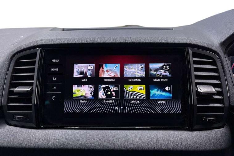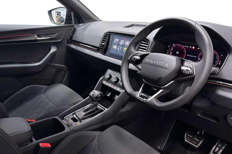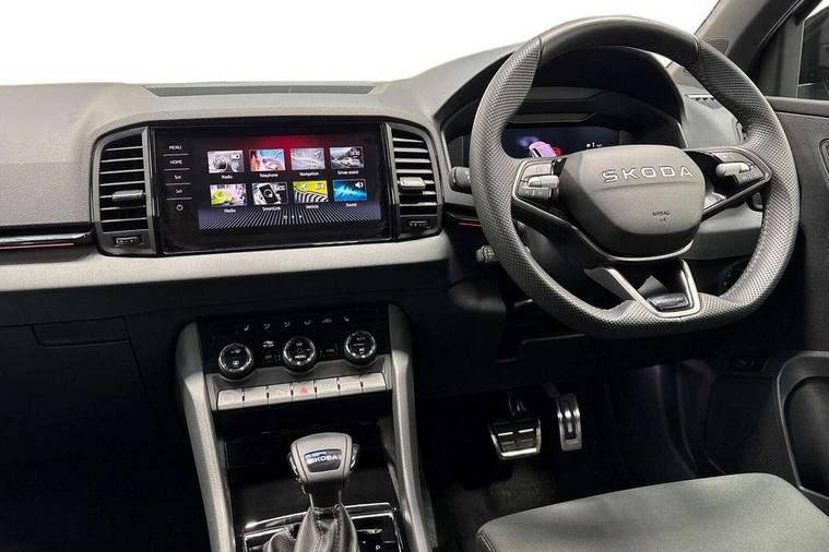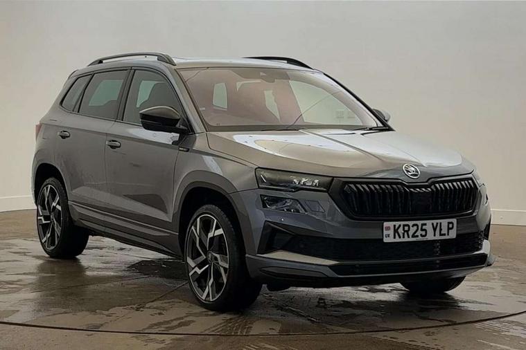 Advanced driver attention and drowsiness monitor, Emergency services call system, Outside temperature gauge, Sensor for driver assistance systems, Service interval indicator, SmartLink wireless for Apple and wired for Android, Start/stop system with regenerative braking, Traffic sign recognition, USB C Port x 2 in front centre console, Virtual Cockpit - 10.25" digital display, Virtual pedal with electrically operated boot door, Wireless smartphone charging, DAB radio with Bluetooth, USB connection, Acoustic glass, Aero front windscreen wipers with intermittent function, Auto dimming rear view mirror with light and rain sensors, Black door mirrors, Black electric window control buttons, Black radiator grille, Black roof rails, Body colour door handles, Electric front and rear windows with child proof lock, Extended rear roof spoiler, Front door steps with SportLine logo, Heated rear windscreen, LED daytime running lights, LED rear lights with high functionality welcome effect and dynamic indicators, Light assistant (coming/leaving home/tunnel light), Panoramic sliding sunroof, Plastic scuff plates in door apertures, Privacy glass, Protective door side sills in body colour, Rear diffuser, Rear side wing doors, Rear window wiper with washer system and intermittent control, Safety reflectors on front doors, Skoda lettering on tailgate in black, Sportline badge on front fender, Sports front and rear bumpers, Third brake light, Unique dark chrome design logo on alloy wheels, 1.5 litre bottle holders in driver and front passenger door panels, 12V socket in boot, 12v socket in front centre armrest with storage compartment and rear air vents, 2 x Tablet holder, 3 rear height adjustable headrests, 3 seat bench in 2nd row, 3 spoke sports leather heated multifunction steering wheel with DSG paddles, 4 foldable roof handles with rear coat hooks, Black floor carpet, Cargo elements in boot, Chrome inner door handles, Foldable hooks in the boot, Front head restraints, Height adjustable front three point seats belts with tensioners, Height/reach adjust steering wheel, Ice scraper, Illuminated glovebox, Illuminated luggage compartment, Isofix child seat preparation for front passenger seat, Isofix child seat preparation outer rear, Manual lumbar support for front seats, Pen holder, Pollen filter, Rear backrest release from boot, Rear boot cover, Rear package tray, Rear reading lights, Rear seats fixed folding and divided 60:40, Rubbish bin door, Safety vest holder, Single front passenger seat, Skoda lettering on steering wheel, Sportline decorative inserts, Storage box in upper central dashboard closed, Sunvisors with illuminated vanity mirrors, Textile floor mats, Ticket holder, Titan black interior ceiling, Umbrella under passenger seat, Under passenger seat storage compartment, Columbus pack - Karoq, LED Interior lighting pack with Skoda welcome logo - Karoq, Light Pack - Karoq, Non Smokers pack, Performance pack - Karoq, Winter plus pack with heated front and rear seats - Karoq, Automatic door unlocking in case of crash, Automatic fuel cut off in case of crash, Driver airbag, Electronic parking brake with auto hold function, Emergency rear braking signal, ESC (incl. ABS+MSR+ASR+EDS+HBA+DSR+RBS+MKB), Front side airbags, Head airbags, Hill hold control, Knee airbags, Passenger airbag with switch-off function, Pedestrian monitor, Seatbelt reminder signalisation and pretensioner for all seats, Three point seatbelts rear, Two tone horn, Tyre pressure monitor, Alarm with interior monitoring, back up horn and tilt sensor with safe function, Electronic engine immobiliser, Keyless entry and start/stop, Remote central locking with 2 remote folding keys, Black air vent surround, Black centre console, carbon door decor, Satin black dashboard, Satin black door trim, 19" Sagittarius anthracite alloy wheels, Anti-theft wheel bolts protection, Breakdown and tool kit,