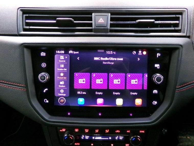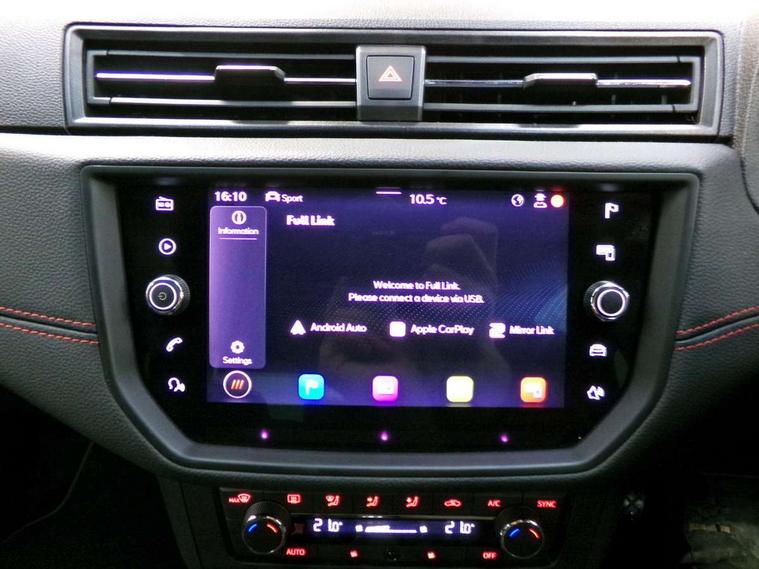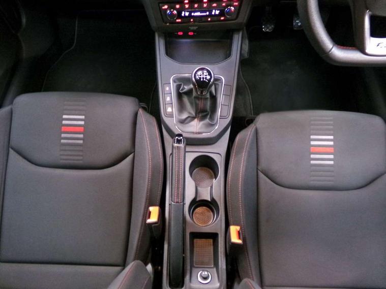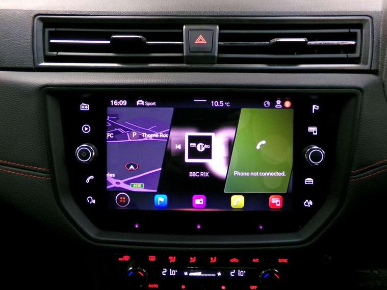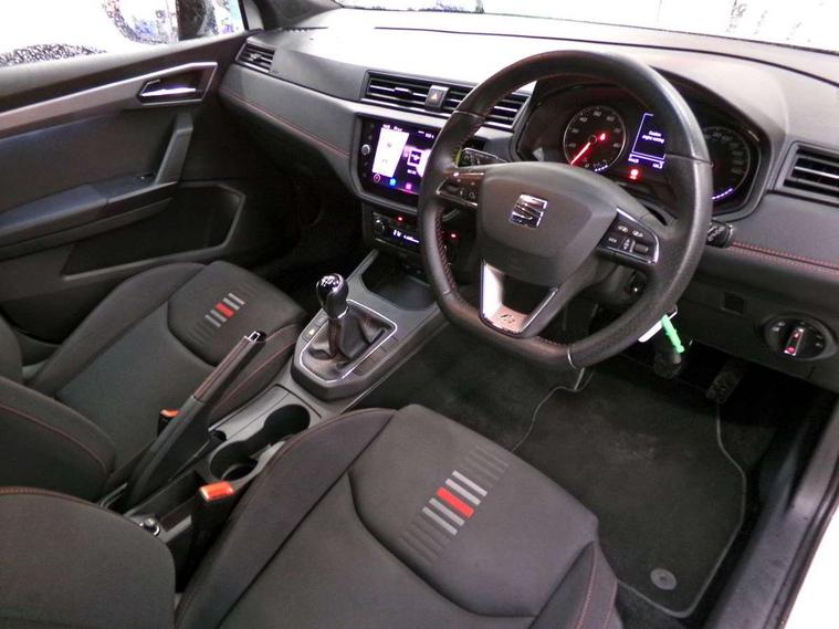 'Lights On' Reminder warning buzzer, Bluetooth audio streaming with handsfree system, Cruise control, Digital clock, Full Link Smartphone Integration with Mirror Link, Apple Car Play, Google Android Auto, Low fuel warning light, Navigation system with 8" touch screen + proximity sensor, voice control and USB type C sockets, Outside temperature gauge, Power Steering, Seat connect with safety, service, remote and online, SEAT Drive profile, SEAT logo boot release, Speed limiter, Trip computer, Sports suspension, 6 speakers, Auxiliary input socket, CD player, Digital Audio Broadcast (DAB) Tuner, Radio/MP3 player, SD card slot, Steering wheel mounted controls, USB (type C) cable for Apple and Android compatibility, Anti theft roof antenna, Auto dimming rear view mirror, Automatic headlights, Automatic rain sensing wipers, Body colour bumpers, Body colour door handles, Brilliant black door mirrors, Brilliant black window surrounds, Chrome front grille frame, Coming/leaving home lighting function, Dark tinted rear windows, Electric folding door mirrors, Electric front windows, Electric headlight adjustment, Electric rear windows, Electrically adjustable and heated door mirrors, Exclusive FR rear bumper, Front/rear fog lights, LED daytime running lights, LED headlights with dynamic headlight range control, LED tail lights, Rear spoiler with twin exhausts, 60/40 split folding rear seat, Ambient interior lighting, Chrome detailing, pearl grey headlining and leather effect door trim panels, Driver's sunvisor with ticket holder/vanity mirror, Dual zone climate control with combination filter, Front courtesy lights, Front cupholders x 2, Front reading lights, Gear shift indicator, Glovebox, Height adjustable driver's seat, Height adjustable passenger seat, Height/reach adjust steering wheel, Illuminated boot, Instrument lighting with brightness control, Leather dashboard, Leather multifunction flat bottomed steering wheel with FR logo, leather gear knob and handbrake, Nora cloth upholstery, Passenger sunvisor, Rear top tether child seat ISOFIX attachment, Sports seats, Two height adjustable front and rear headrests (three in rear), 3 point seatbelts on all 3 rear seats, ABS, Active front headrests, Child locks on rear doors, Curtain airbags, Driver/Front Passenger airbags, ESP+EBA, Front assist (AEB), Front passenger airbag deactivation, Front side airbags, Hill hold control, Multi-Collision braking, Seat belt reminder for front and rear seats, Tiredness recognition system, Tyre pressure monitoring system, Anti theft wheel bolts, Electronic engine immobiliser, Perimeter alarm and interior monitoring with backup horn and tow away protection, Remote central locking + deadlocks, 17" Dynamic alloy wheels,