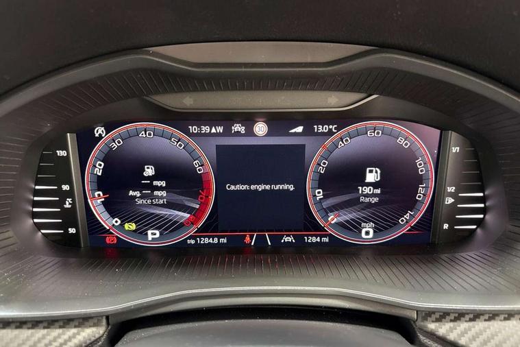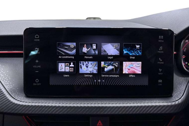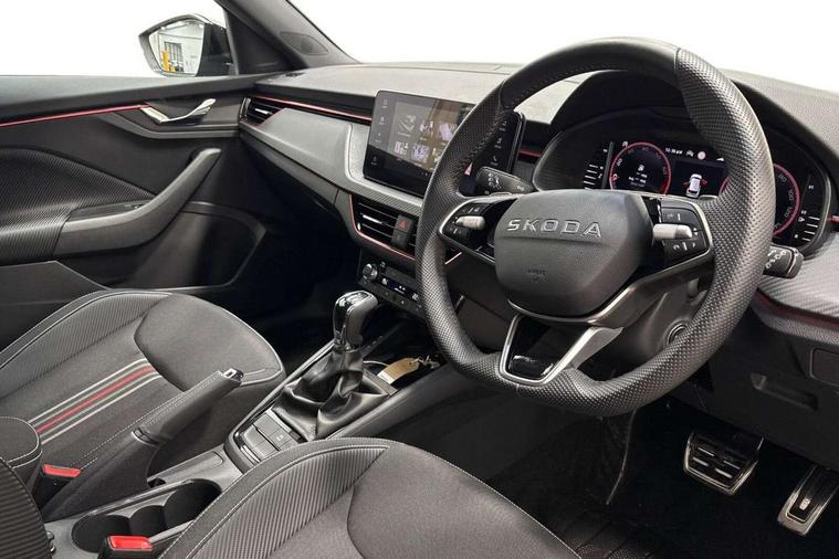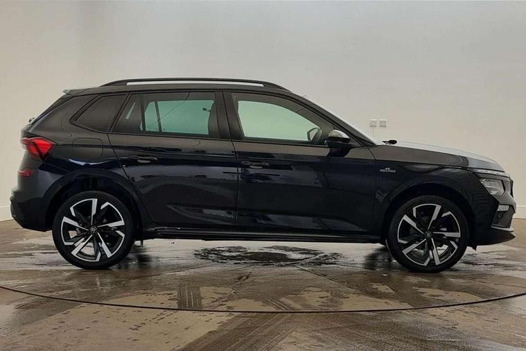 Advanced driver attention and drowsiness monitor, Bluetooth system, E-call, Front assist system, PAS, Rear parking sensors, Rear view camera, Service indicator, Speed limiter, Traffic sign recognition, Virtual cockpit with 10.25" display, Voice control system, Wireless smartlink, 4 USB C ports, 8 Speakers, 9.2" Skoda navigation display, DAB Digital radio, Auto dimming rear view mirror, Automatic headlight control with coming home and leaving home feature, Black door mirrors, Black radiator grille, Black rear diffuser, Black roof spoiler, Body colour bumpers, Body colour door handles, Boot lettering in black, Extended tailgate glass, Fixed panoramic sunroof with black roof rails, Front and rear electric windows, Heated rear window, LED daytime running lights, LED high beam, LED low beam, LED third brake light, Light sensors, Monte carlo plaque, Privacy glass, Rear side wing doors, Rear wiper, Ticket holder inside windscreen, 12V socket in luggage compartment, 3 seat bench in 2nd row, Aluminium pedals, Ambient lighting in white/red, Art leather carbon decor inserts, Art leather carbon door inserts, Black roof lining, Cargo elements, Chrome inner door handles, Driver and passenger sun visors with vanity mirror, Dual zone climate control, Front and rear roof lights, Front centre armrest, Front head restraints, Glove compartment with illumination, Height adjustable driver seat, Height adjustable front passenger seat, Ice scraper, Inner circulation control with pollen filter, ISOFIX on front passenger seat, Isofix preparation for back seats, Leather gearknob and handbrake lever, Manual lumbar support for front seats, Monte Carlo cloth upholstery, Net package and top tether hooks in boot space, Net under rear shelf, Pocket on the back of both front seats include mobile phone pockets, Rake/reach adjustable steering wheel, Reading lights, Rear centre armrests, Red hotstamping, Single front passenger seat, Sports seats, Textile floor mats, Third rear headrest, Top tether for front passenger seat, Umbrella in driver's door, Light and view plus package - Kamiq, 3x3 point rear seatbelts, Airbags - driver and front passenger, Disc brakes, ESP, Extended and predictive pedestrian/cyclist protection, Front passenger airbag deactivation switch, Front side airbags with curtain airbags, Hill hold control, Manual leather parking brake, Manual rear child locks, One tone horn, Seatbelt reminder for driver an co-driver, Traction control, Tyre pressure monitor, Anti-theft alarm system with interior monitoring, backup horn, towing protection and remote central locking with SAFE system, Anti-theft wheel bolts, Electronic engine immobilizer, 18" Ursa black diamond cut alloy wheels,