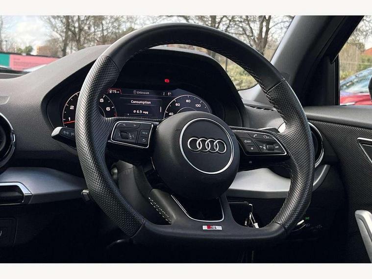 3D map display, Audi connect navigation and infotainment includes innovative services, Audi connect remote and control connects your vehicle to your smartphone, Audi drive select: S tronic - power steering assistance + engine + gearshift (modes: comfort, auto, dynamic, efficiency, individual), Audi smartphone interface - Apple carplay/Android Auto, USB connect, 2xSDXC card readers, voice control for navi, telephone, music and 3rd party apps, Audi virtual cockpit, Automatic start/stop system with recuperation, Bluetooth interface includes bluetooth audio streaming, Cruise control, E-call, Jukebox hard drive memory for music (10GB), MMI navigation plus with 8.3" colour MMI screen and MMI touch, Natural voice recognition, Power operated tailgate, Progressive steering, Rear parking sensors, Sport suspension, 6 passive loudspeakers, DAB Digital radio, Audi beam, Auto dimming rear view mirror, Black window trims, Bumper in full body colour paint finish, Electrically adjustable, folding, auto dimming and heated door mirrors with integrated LED side indicators, Front windscreen with grey tinted sunband, LED daytime running lights, LED headlights with dipped beam, high beam, position lights, indicators, LED rear lights, LED third brake light, Privacy glass - dark tinted rear and rear side windows from B-pillar backwards, Rear side wing doors, Rear wiper, Variable front intermittent wipers, Wheel arch trims in manhattan grey, 12V socket in front, 3 seat bench in 2nd row, 3 spoke flat bottomed multi-function leather sport steering wheel with gear shift paddles, 4-way electric lumbar support for front seats including manual seat height adjustment for both front seats, 60/40 split folding rear seat bench, Black carpets, Black cloth headlining, Front and rear head restraints, Front centre armrest, Front sport seats, Front/rear floor mats, Height/reach adjust steering wheel, Illuminated door sill trims with S logo, ISOFIX child seat mounting in front passenger and rear outer seats, Manual air conditioning, Single front passenger seat, Stainless steel pedals, Black styling pack - Q2, 3x3 point rear seatbelts, 6 airbags - Front, curtain and front side airbags, Electromechanical parking brake, Electronic stabilisation control including ABS, ASR and EDL, Front passenger airbag deactivation, Hill hold assist, Pre-sense front with pedestrian recognition, Seatbelt monitoring, Tyre pressure warning light with visual and acoustic warning, Warning triangle and first aid kit, Anti theft alarm, Anti theft wheel bolts, Electronically operated child locks, Remote central door locking, Aluminium interior element, Black dashboard, Matt brushed aluminium trim inlays, Tool kit,
