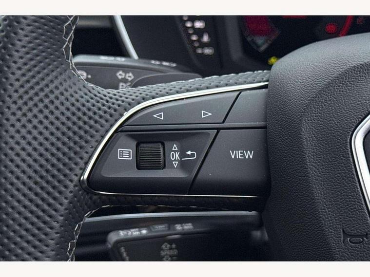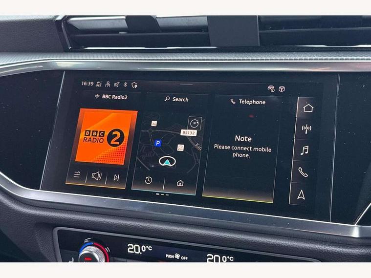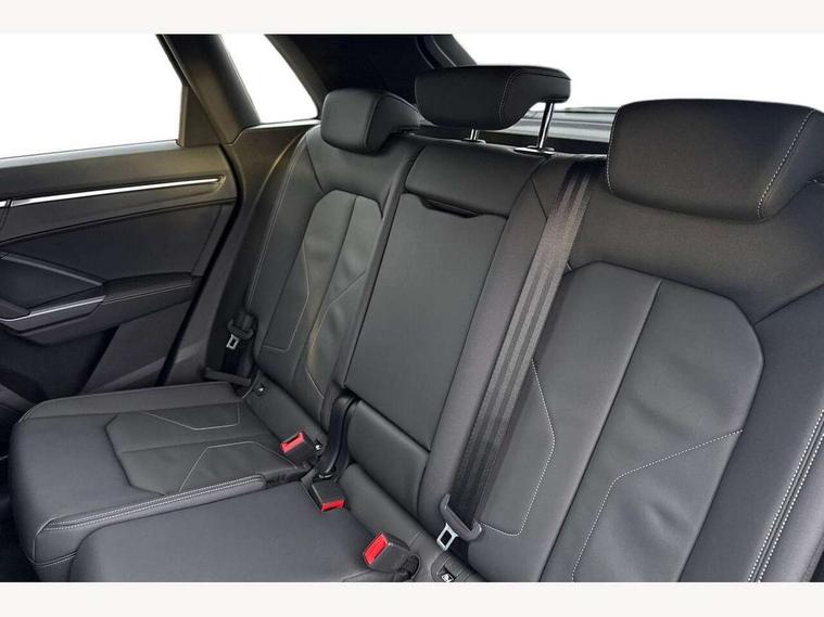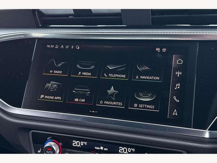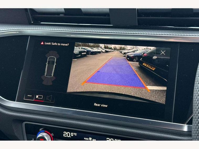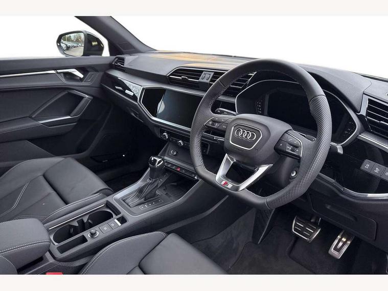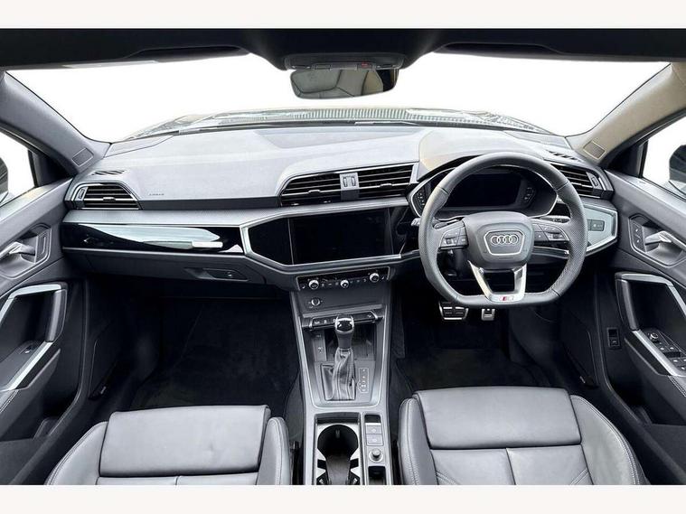 360 degree view camera, Audi connect safety and service, Audi drive select, Audi lane departure warning, Audi Virtual Cockpit - 10.25" display, Bluetooth interface, Camera based traffic sign recognition, Distraction and Fatigue warning, Legal emergency call, MMI Navigation Plus with high resolution 10.1 inch touchscreen colour display, Phonebox light with wireless charging, Power operated tailgate, Progressive steering, Service interval indicator, Smartphone interface includes wireless Apple carplay/Android Auto, Start stop system with recuperation, Voice control system with natural language interaction, Sports suspension, 2 USB-C ports with charge and data functions, DAB digital radio module, SONOS premium sound system, Acoustic windscreen, Audi Beam uses LEDs to project the Audi logo onto the ground as you exit your Q3, Auto dimming door mirrors, Auto dimming frameless rear view mirror, Electrically folding, adjustable and heated door mirrors with integrated LED side indicators and kerb view function for passenger side, Front and rear electric windows, Front fog lights, Front underbody protection in manhattan grey paint finish, High gloss black finish B and C pillars, Honeycomb design radiator grille in matt anthracite black, LED Dynamic rear indicators, LED rear lights, LED third brake light, Matrix LED headlights with LED daytime running lights, Panoramic glass sunroof, Privacy glass dark tinted rear and rear-side windows (from B-pillar backwards), Rain and light sensors, Rear diffuser grille in grained matt black, Rear diffuser strip in matt anthracite black, Rear side wing doors, Rear underbody protection in matt black, Rear wiper, S line front and rear bumpers and side skirts in contrasting Manhattan grey paint finish, Variable front intermittent wipers, 12V socket in rear centre console, 3 seat bench in 2nd row, 40:20:40 folding with manual adjustment for 60:40 forwards/backwards position and backrest angle, Adjustable rear seat bench/backrest with centre armrest and cupholder, Black carpet mats, Black cloth headlining, Dual zone electronic climate control, Electric lumbar support, Electrically adjustable front seats, Front and rear black floor mats with contrast stitching in rock grey, Front and rear headrests, Front centre armrest, Heated front seats, Height and reach adjustable steering wheel, Illuminated door sill trims with S logo, ISOFIX child seat mounting for front passenger with airbag deactivation and outer rear seat including top tether attachment point for outer rear seats, Luggage compartment sill protection in stainless steel, Perforated leather gearknob, Single front passenger seat, Stainless steel pedals, Twin leather upholstery with front sport seats + S embossing, Black styling pack - Q3, Non smoking pack - Q3, 3x3 point rear seatbelts, 6 airbags - Driver, front passenger, curtain and side windows, Audi pre-sense front with pedestrain and cyclist recognition, Electrically operated child locks on rear doors, Electromechanical parking brake, Electronic stabilisation control including ABS, ASR and EDL, Front seatbelt reminder, Hill descent control, Hill hold assist, Pre sense basic, Seatbelt monitoring, Tyre pressure warning, Warning triangle and first aid kit, Advanced key, Anti theft wheel bolts, Immobiliser, Remote central locking, Thatcham approved category 1 anti theft alarm, Aluminium look interior elements, Detail dashboard around MMI touch colour display in glass look, black with surround in aluminium look, Leatherette door armrest, Piano black inlay,
