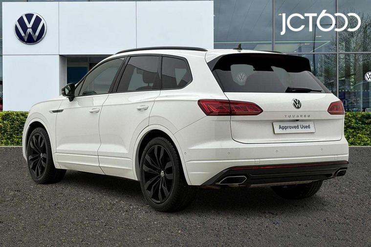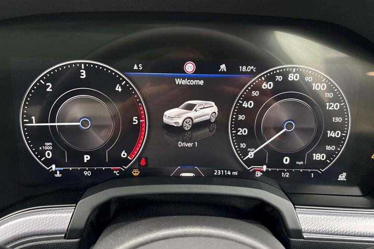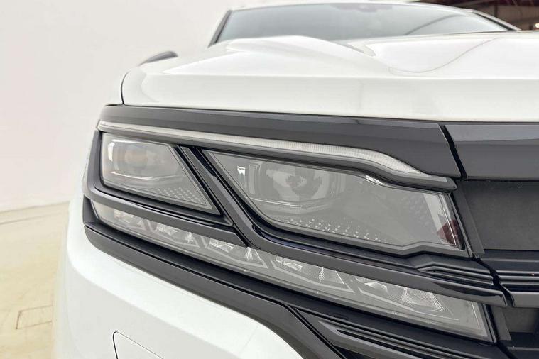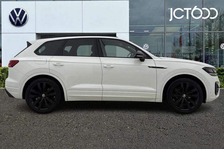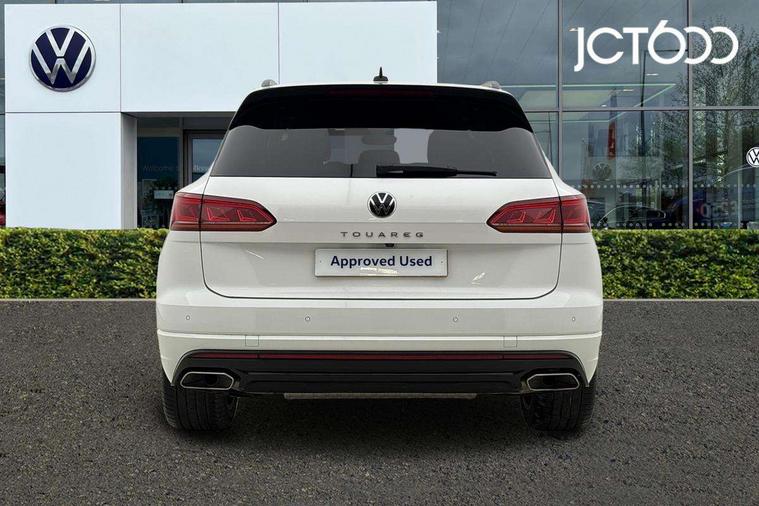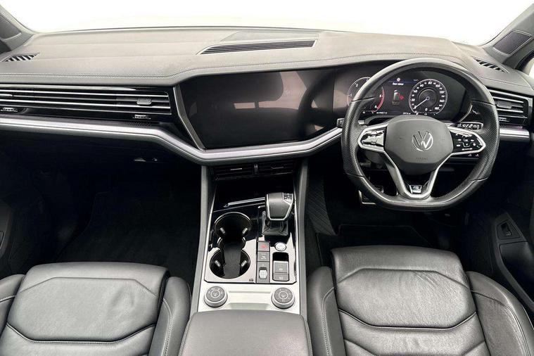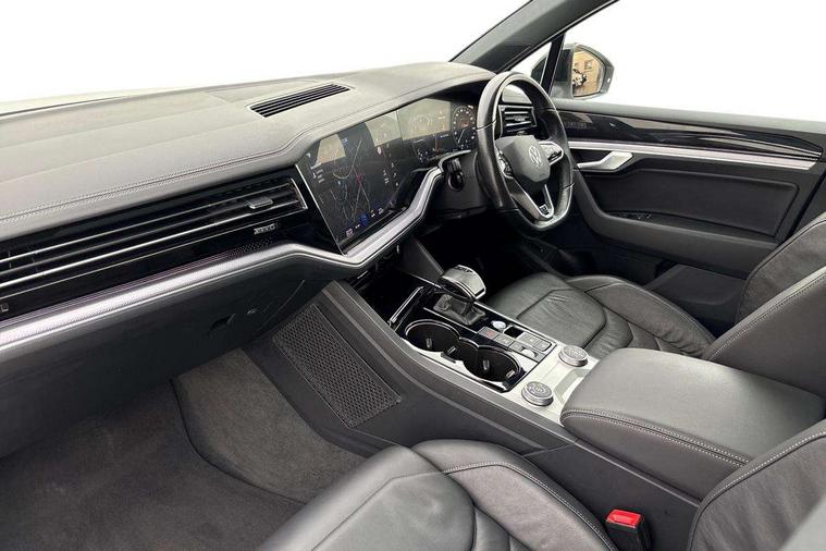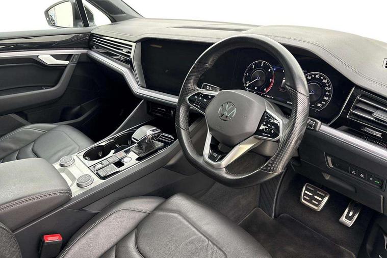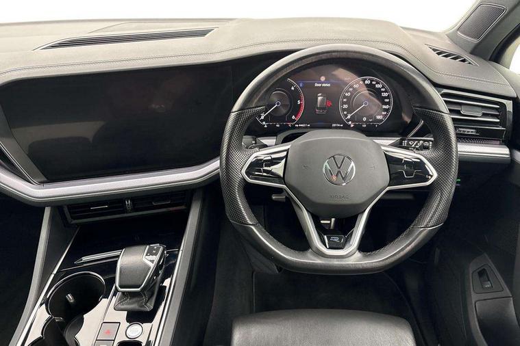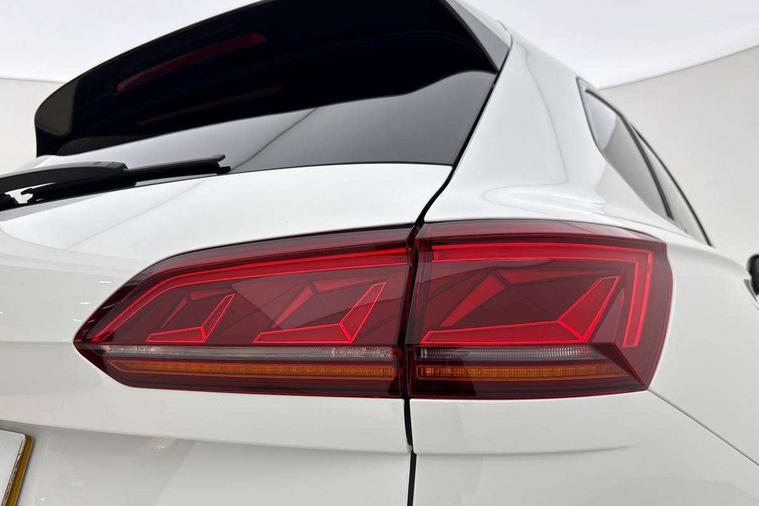 2D/3D map view, ACC - Adaptive cruise control with front assist, forward collision warning, distance monitoring, city emergency brake and speed limiter, Apple car play/Android Auto, Audible and visual fatigue detection system, Bluetooth hands free telephone connection, Car information display, Drive select with Damper control, Driver alert system, Driver profile selection, Dynamic road sign display camera controlled system with visual warning for traffic and road signs, eCall emergency system, Fully electric tailgate + keyless entry and start, Instrument cluster, MirrorLink, Multifunction camera, Multifunction computer premium with 7" colour display, One touch indicators with repeat function, Service interval indicator, Speed sensitive power steering, Start/stop system with regenerative braking, Tailgate power latch, Think blue trainer driver tips and journey analysis, Traffic sign recognition, Voice control system, Wireless Smartphone charger, 24 litre AdBlue tank, Torsen limited slip differential, DAB Digital radio, Dynamic navigation based on TMC+, Gesture control for infotainment system, Multi device interface (MDI) with illuminated USB-C connection, Music playback - MP3, WMA and AAC files, SD card slot, Simultaneous pairing of 2 compatible mobile devices, SMS functionality - read, compose and send SMS messages using touch-screen display, Title and cover art display, Volkswagen media control, Adaptive low beam for urban and motorway use, Auto dimming rear view mirror, Automatic coming/leaving home lighting function, Automatic headlights, Black anodised roof rails, Black door mirrors, Black rear diffuser, Black side window surrounds, Black upper and lower grille louvres extending into headlights and radiator grille, Body colour door handles, Body coloured wheel arches, C signature gloss black front air intake, Chromed tailpipe on the left and right integrated in the bumper with trapezoid design, Dusk sensor, Dynamic headlight range control, Electric front tilt/slide panoramic sunroof and fixed rear sunroof, Electrically power adjustable, heated, folding, auto dimming, front passenger exterior door mirror lowering function, Front and rear electric windows, Galvanised body, Gloss black finish B pillar, Gloss black rear diffuser, Headlight washers, Heat insulating darkened glass in side and rear windows, Heated windscreen washer jets, IQ.Light-LED matrix headlight, daytime running light with dynamic cornering light and indicator, LED 3rd brake light, LED rear fog light, LED rear number plate lights, Plastic scuff plates in door apertures, Poor weather light, Puddle lights, Rain sensor, Rear side wing doors, Rear wiper, 12V socket in front and rear centre console and boot, 2 Coat hooks on B pillar, 3 rear head restraints, 3 seat bench in 2nd row, 3 spoke sport heated leather multi-function sports steering wheel with gear shift paddles - generation 2, 4 way adjustable front head restraints, 4 way electric lumbar support for driver and front passenger, 4 zone climate control, 40:20:40 split folding slide/recline rear seat, B pillar vents, Black lower edge of door extending sills, Branded points of interest, Double sun visor for drivier and passenger with LED illuminated vanity mirrors, Electric luggage compartment cover, Folding rear centre armrest with 2 cupholders, Front + rear carpet mats, Front centre armrest with storage box, Gear shift indicator, Height/reach adjust steering wheel, Illuminated air conditioned glovebox, Isofix preparation for 2 rear child seats, Jack and tool kit, Leather trimmed gear knob with gloss black inlay/aluminum trim, Leatherette door trim, LED luggage compartment lighting, Load through provision, Luggage compartment with load lashing rings, Plastic loading edge protection, Rear seat remote release levers, Single front passenger seat, Soul black headlining, Stainless steel pedals, Innovision cockpit pack - Touareg, 3 point front seatbelts with pre-tensioners, ABS, Active bonnet, Automatic post collision braking system, Curtain airbags, Driver/Front Passenger airbags, EBD + Brake Assist, EDL, Electronic parking brake with auto hold, ESC with ASR, Front seat side impact airbags, Hill descent control, Hill start assist, Passenger airbag deactivate switch, Seatbelt warning lamp and buzzer, Three 3 point rear seatbelts, Two tone horn, Volkswagen roadside assistance, Warning triangle and first aid kit, Alarm with interior monitoring in cab, backup horn and towing protection, Child security locks for front and rear doors, Electronic engine immobiliser, Remote central locking, Black decorative trims on the side windows, High gloss black centre console,