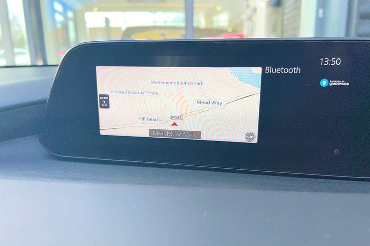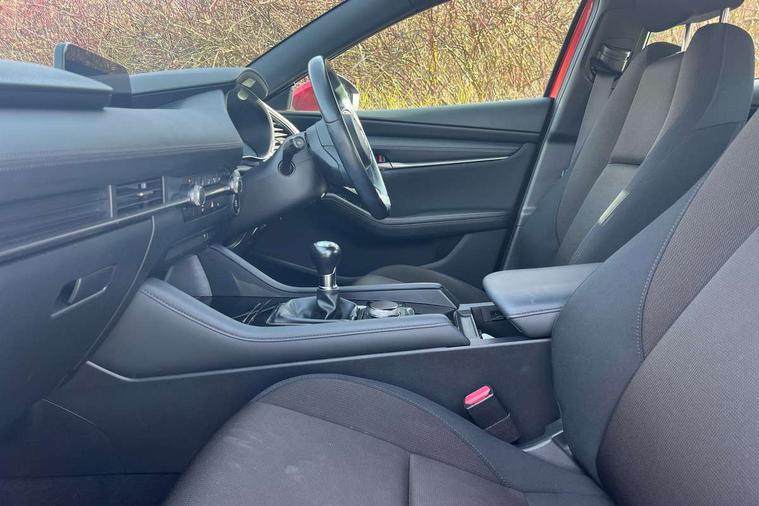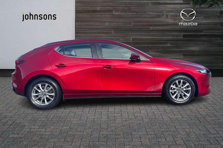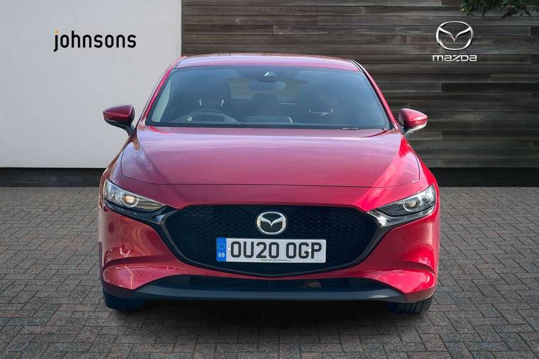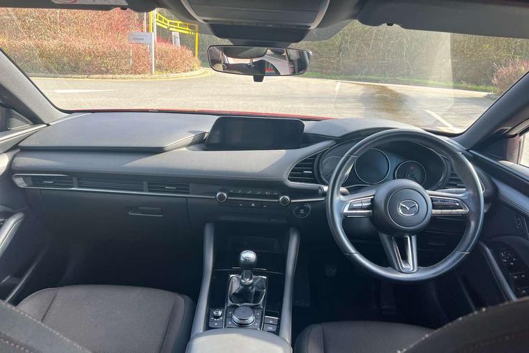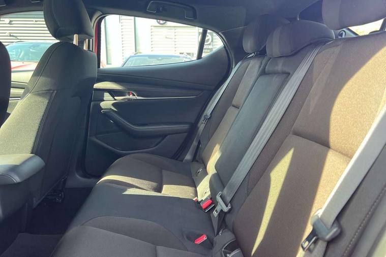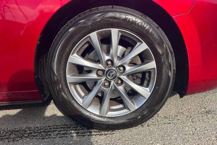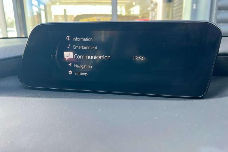 7" colour TFT display, 8.8" Colour centre touch screen display with Mazda Connect infotainment, Apple car play/Android Auto, Audio transfer from bluetooth devices, Blind spot monitoring with rear cross traffic alert, Colour active driving display inc Windscreen projected, Traffic Sign Recognition, turn-by- turn navigation and Mazda Radar Cruise Control information, Digital instrument cluster, Driver attention alert system, E-call with GPS, Emergency stop signalling system, Engine start/stop button, Head up Display, Integrated bluetooth with steering wheel mounted controls, Intelligent speed assist, Lane keep assist system (LAS) with Lane departure warning system (LDWS), Mazda Navigation System with european mapping, Mazda Radar Cruise Control, Mobile App interface, Multimedia Commander, PAS, Rear parking sensor, Service indicator, Trip computer, Auxiliary input socket, Mazda Multimedia System with AM / FM / DAB radio with 8 speakers, Coming/leaving home lighting function, Dark metallic finish signature wing, Daytime running lights, Dusk sensing headlights, Electric front/rear windows with one touch/auto up/down, Electrically adjustable/heated/auto power folding door mirrors with integrated indicators, Front body coloured bumper with black/bright lower bezel, Gloss black mesh grille, Gloss black rear roof spoiler, High beam assist, LED front fog lights, LED headlamps with auto levelling, LED indicator lights, LED rear combination lights with LED rear turn lights, LED third brake light, Rain sensing front wipers, Rear fog lights, Rear gloss black lower moulding, Speed adjustable rear wash wiper with intermittent wipe, 60/40 split fold down rear seats, Cloth upholstery, Driver, Front passenger and two rear grab handles with coathooks, Driver/passenger sunvisors + vanity mirrors (drivers side with ticket holder), Drivers seat manual slide recline and height adjustment, Electrical power outlet, Folding rear centre armrest with two cup holders, Front and rear courtesy lamps, Front armrest, Front centre console with storage box with tray, lid + 2 cupholders, Front head restraints, Front passengers seat manual slide, recline and height adjustment, Illuminated glovebox, ISOFIX child seat anchorage points attached on outer rear seats, Leather wrapped gear shift knob, Leather wrapped steering wheel, LED interior light, Luggage compartment light, Manual air conditioning, Reach adjustable steering wheel, Storage - glovebox, driver and front passenger door pockets and roof mounted sunglasses holder, Three height adjustable rear head restraints, Tilt/height adjustable steering wheel, USB charging point, 3 point ELR front seatbelts with pretensioners, 3 rear 3 point seatbelts with ELR, Anti-lock braking system (ABS), Collision mitigation braking system, Drivers knee airbag, DSC - Dynamic Stability Control, Dual front airbags, EBD - Electronic brakeforce distribution, Electronic parking brake with auto disengage function and auto hold function, ESP, Front and rear curtain airbags, Front passenger airbag cut-off switch, Front side airbags, Front smart city brake support, G-Vectoring control plus, Hill launch assist, Intelligent Traction Control system, Mild Hybrid system with regenerative braking, Seatbelt reminder for driver/front passenger and rear seats, Tyre pressure monitoring system (TPMS), Auto door lock when driving, Remote central locking + deadlocks, Thatcham accredited alarm and immobiliser, 16" Silver metallic alloy wheels, Emergency tyre repair kit,