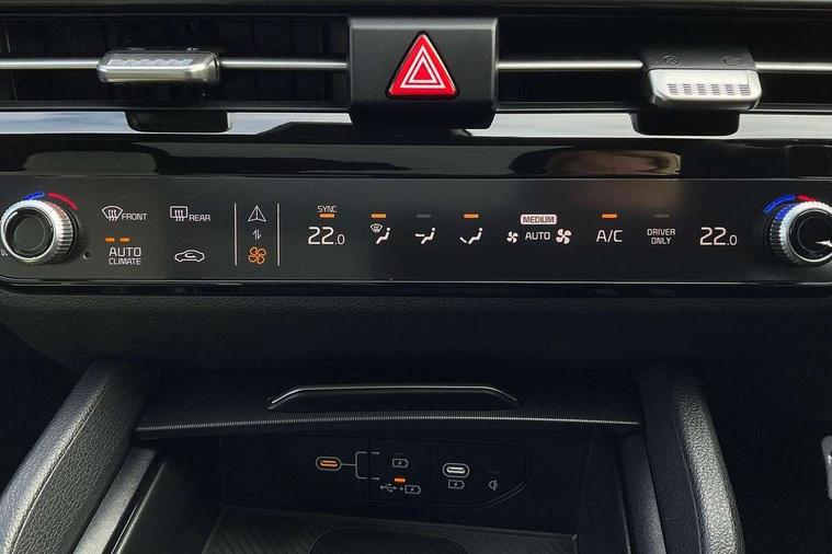 12.3" Driver display screen, 12.3" Touchscreen navigation system, 360 degree around view monitor, Blind spot collision avoidance assist, Blind spot view monitor, Bluetooth connection, Customisable head-up display, Digital key 2.0, Drive mode selector, Driver attention warning, E-call, Emergency stop signalling system, Forward collision avoidance assist 2.0, Front and rear parking sensors, Highway Driving Assist (HDA 2.0), Intelligent speed limit assist, Kia Connect (UVO), Lane Following Assist (LFA), Lane keep assist, Low washer fluid warning, Motor driven power steering, Over the air (OTA) functionality, Parking collision avoidance assist (PCA), Rear cross traffic collision avoidance assist (RCCA), Remote smart parking assist, Reversing camera, Safe exit warning (SEW), Smart cruise control with stop and go functionality, Smart power tailgate, Speed limiter, Trip computer, Windscreen washer level indicator, Wireless apple car play/android Auto, Wireless Smartphone charger, DAB Radio with MP3, Front passenger 1x USB-C port, Harman Kardon premium sound system with 8 speakers, Rear passenger 2x USB-C port, Steering wheel mounted audio controls, USB-C port for connection of a media device, Auto dimming rear view mirror, Automatic defog system, Automatic headlight control system, Black and body coloured bumpers, Black window surrounds, Body colour exterior door handles, Body colour radiator upper garnish and door garnish, Dual LED headlights with adaptive driving beam, Electric front and rear windows with front one touch function, Electrically adjustable/heated/folding door mirrors with LED indicators, Front and rear body colour skid plates, Gloss black door mirrors, Gloss black radiator grille, Gloss black wheel arches, Glossy black roof rails, GT-Line exterior styling, Heated rear window, High beam assist, LED daytime running lights, LED front fog lamps, LED High mounted stop light, LED rear lights, Panoramic sunroof with tilting and sliding function with electric blind, Privacy glass in rear windows and tailgate, Rain sensing wipers, Rear fog lamp, Rear roof spoiler, Rear side wing doors, Rear wiper, Satin finished beltline, Trailer stability assist, 12V power socket in front and luggage compartment, 3 seat bench in 2nd row, 3 x passenger assist grips, 40/20/40 split folding rear seat, All-round height adjustable headrests, Alloy pedals, Automatic air conditioning, Black headlining, Centre console storage box, Cupholders in rear armrest, Customisable ambient lighting, Door courtesy lamps, Driver and front passenger sunvisors with illuminated vanity mirrors, Drivers seat power lumbar support, Electric adjustable driver seat with memory function, Electric adjustable front passenger seat, Front and rear door storage, Front seat and rear pockets, Gear shift indicator, Glovebox, GT-Line Interior Styling, Heated front and outer rear seats, Heated steering wheel, ISOFIX Child seat top tethers and anchor fixings outer rear seats, Leather steering wheel, Leather/suede upholstery, LED front cabin light, LED interior personal lamp, LED lighting in overhead console, LED rear reading lights, Luggage area LED light, Luggage area load cover, Luggage area parcel shelf, Luggage board, Luggage compartment under floor storage, Luggage net hooks, Manual adjust steering wheel, Metal paint interior door handles, Paddle shift controls, Rear air conditioning, Rear cabin light, Rear coat hooks, Single front passenger seat, Ventilated front seats, Ventilation ducts to rear compartment, Active front headrests, All round 3-point seatbelts, Anti-lock braking system (ABS), Dual front side airbags, Dual horn, Dynamic brake control, Electronic parking brake with auto hold function, Electronic stability control with downhill brake control, Front passenger airbag cut-off switch, Front seatbelt pretensioners + load limiters, Height adjustable front seatbelts, Hill start assist control (HAC), Impact sensing auto door unlocking, Multi collision brake assist, Rear airbags, Rear door child safety locks, Rear seat alert system, Seatbelt reminder warning, Traction control, Twin curtain airbags, Twin front airbags, Tyre pressure monitoring system, Vehicle stability management, Customisable automatic door locking, Customisable automatic door unlocking, Door deadlocks, Engine Start/Stop Button with Smart Entry System, Locking wheel nuts, Smart key with motion sensor, Speed sensitive auto door locking, Thatcham category 2 security alarm and immobiliser, Visible vehicle identification number, 19" GT-Line alloy wheels, Tyre mobility kit,