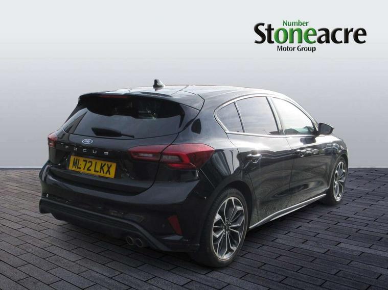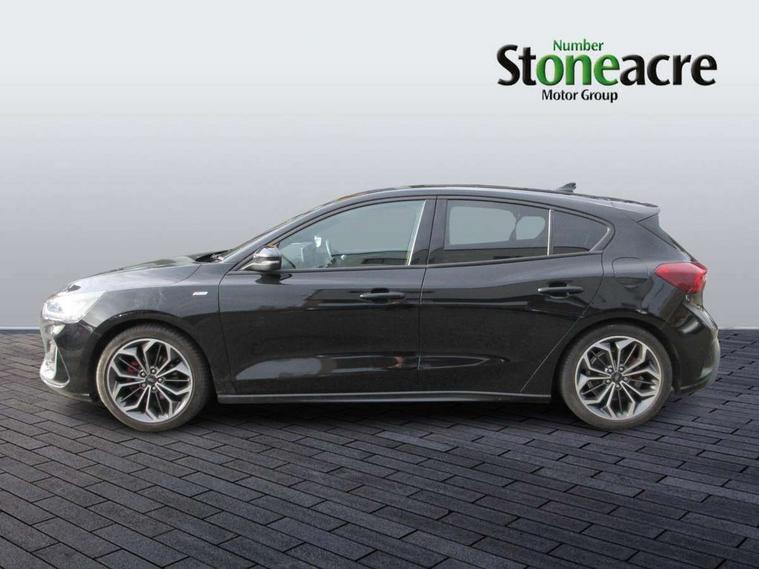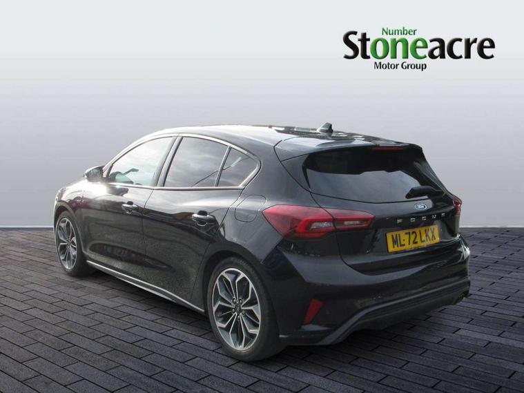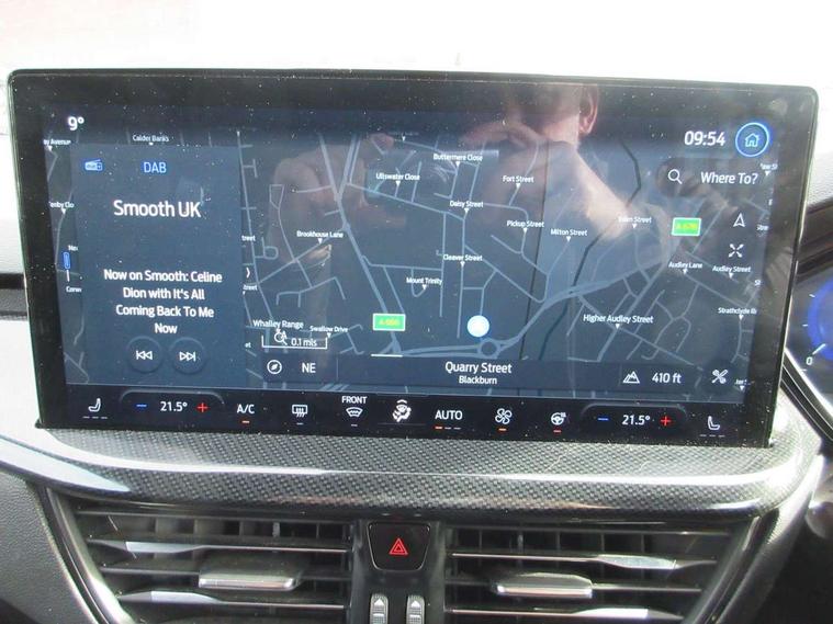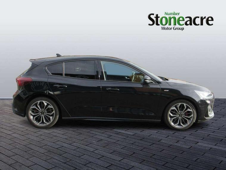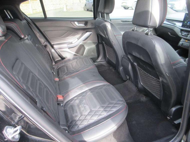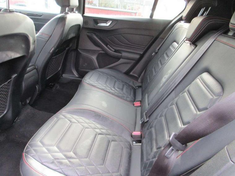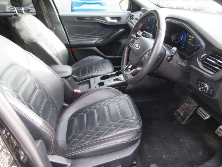 12.3" Digital instrument cluster, Bluetooth system, Digital clock, Easy fuel capless refuelling system, Eco mode, Ford SYNC4 Nav with 13.2'' touchscreen, DAB, Emergency Assistance, Apple Carplay & Android Auto, B&O Premium Audio with 10 speakers, FordPass Connect, Lane keeping system - lane keeping alert and lane keeping aid, PAS, Rev counter, Selectable drive mode, Service interval indicator, Trip computer, Wireless charging pad, Sports tuned suspension, 2 USB ports, Auto headlamps (on/off), Body coloured door handles, Electrically operated front and rear windows with one touch opening and closing, Electrically operated heated power fold door mirrors with puddle lamp with side indicators, Front variable intermittent wipers with electric wash, Heated rear window, LED daytime running lamp, LED rear lamps, LED third brake light, Polished twin tailpipe, Privacy glass, Quickclear heated windscreen, Rain sensor, Rear side wing doors, Tailgate wash/wipe, Unique ST-Line grille, full bodystyling kit, and large body coloured rear spoiler, 3 rear headrests, 3 seat bench in 2nd row, Dual zone electronic air temperature control, Full sensico premium upholstery, Height adjustable front headrests, Isofix child seat preparation, Load through ski hatch, Manual 4-way passenger seat adjusts, Power 4-way driver seat adjust, with power lumbar adjust, Reach + rake adjustable steering column, Single front passenger seat, Winter pack - Focus, 3x3 point rear seatbelts, ABS+Electronic Brake force Distribution, Auto hold function, Driver airbag, EDL traction control, Electronic parking brake, Electronic stability control, Front and rear seatbelt reminder, Front inertia reel height adjustable seatbelts with pre-tensioners, Front passenger airbag, Front side airbags, Passenger airbag deactivate switch, Post collision braking, Pre collision assist with autonomous emergency braking and pedestrian/cyclist detection, Red brake calipers, Remote/power child rear door locks, Side curtain airbags, Three rear inertia reel lap/diagonal seatbelts, Tyre pressure monitoring system, Keyless entry and keyless start, MyKey system, Remote central locking & engine immobiliser, Thatcham alarm with power door dead locks, 18" 5x3 spoke pearl grey high gloss machined finish alloy wheels with mini spare wheel,