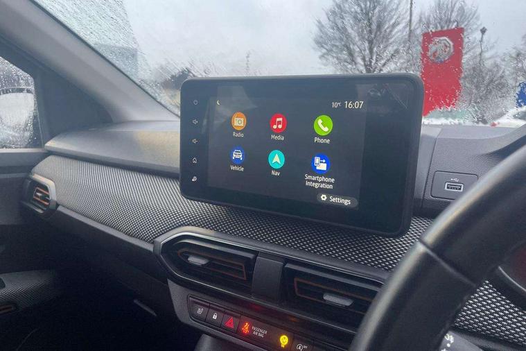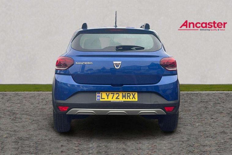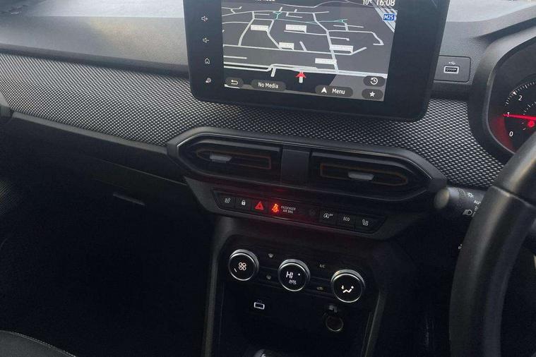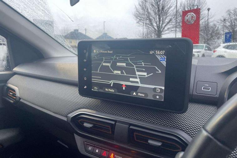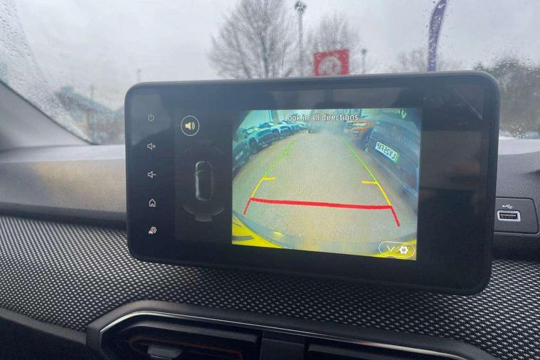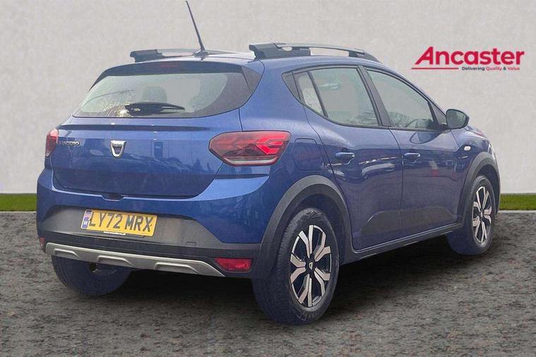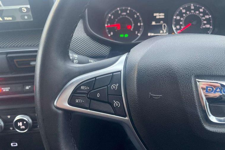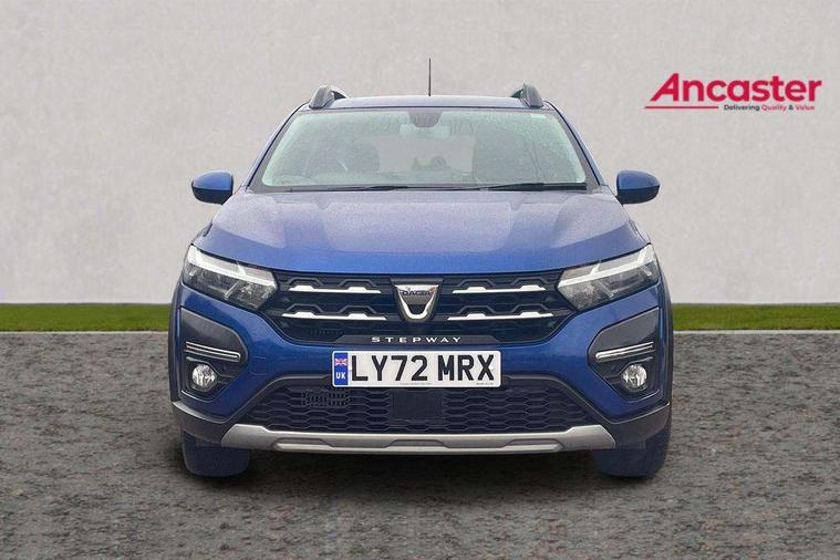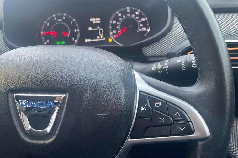 3.5" TFT instrument panel with on-board computer, Blind spot warning, Cruise control with speed limiter, eCall emergency call system, Eco mode, Electric power assisted steering, Front parking sensors, Rear parking sensors, Rev counter, Reversing camera, Stop/start system, 8" MediaNav - DAB Radio, Wifi smartphone replication, Bluetooth, 6 speakres, Apple CarPlay and Android Auto, USB connection for data transfer and charging, USB socket, 3 speed windscreen wipers, Auto lighting, Automatic wipers, Body colour door handles, Body colour door mirrors, Body coloured bumpers, Chrome longitudinal roof bars, Chrome radiator grille, Electrically adjustable and heated door mirrors, Front fog lights, Heated rear window, High level third brake light, LED automatic daytime running lights, LED Y-shape Dacia signature lighting, Modular roof bars, One touch electric front windows, Rear electric windows, Rear side wing doors, Rear wash/wipe, Stepway inscription on radiator grille and roof bars, Tinted windows, 1/3 to 2/3 split folding rear seats, 12 volt front socket, 12 volt rear socket, 3 height adjustable rear headrests, 3 seat rear bench, Automatic air conditioning, Driver + passenger vanity mirrors, Fabric upholstery, Fixed smartphone holder on dashboard, Height adjustable driver seat, Height adjustable front headrests, Height/depth adjustable steering wheel, High central armrest with console storage, Isofix points for child seats in both outer rear seats, Satin chrome interior door handles, Satin Chrome/Copper orange air vents, Single front passenger seat, Soft feel steering wheel, Steering wheel controls, 3x3 point rear seatbelts, ABS and Emergency brake assist, Automatic emergency braking system, Child locks on rear doors, Door open warning, Driver airbag, Electronic parking brake, ESC (Electronic Stability Control), ESP + Hill Start Assist, Front curtain airbags, Front seatbelt pretensioners, Front side airbags, Height adjustable front seatbelts, Passenger airbag, Seatbelt reminder for driver and front passenger, Tyre pressure monitor, Automatic central locking, Immobiliser, Keyless entry, Remote central locking, Decopart on instrument panel and door with textile, 16" Diamond-effect alloy wheels,