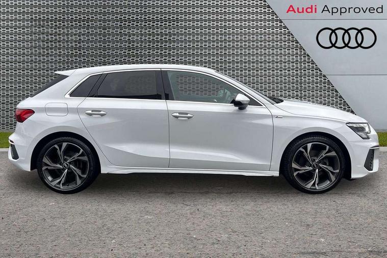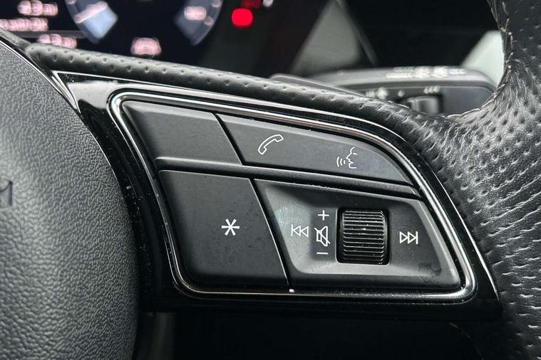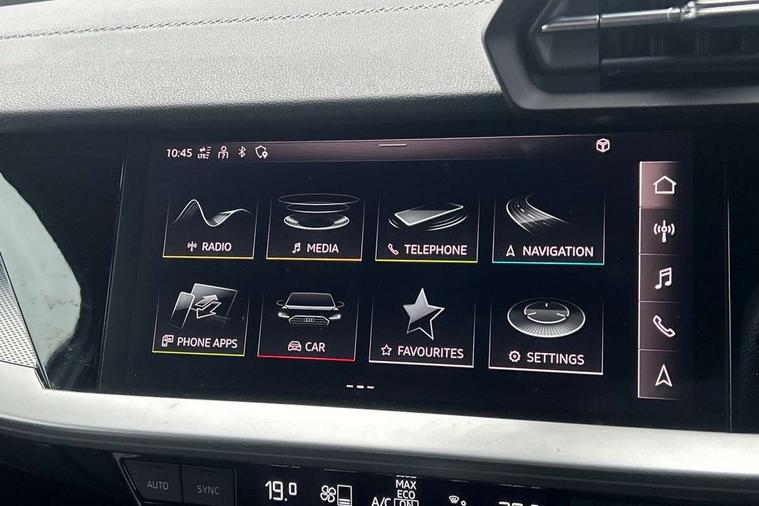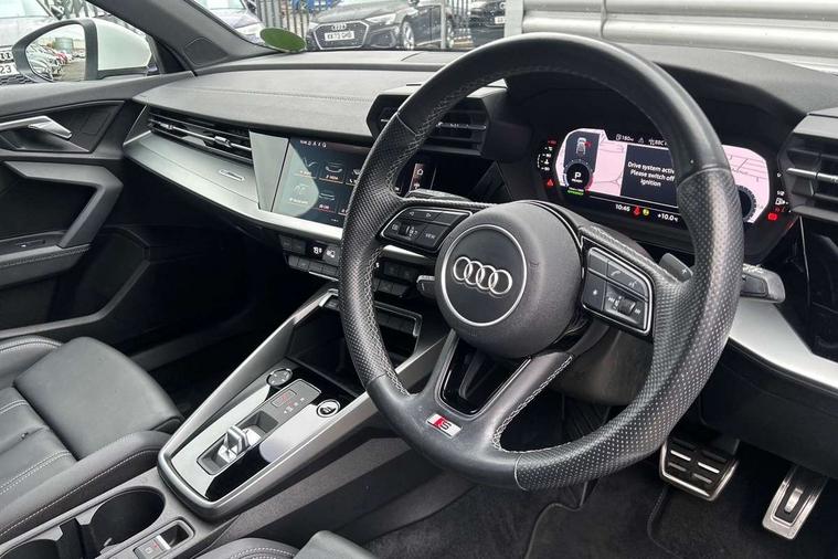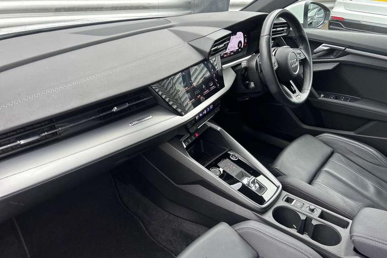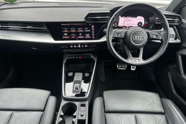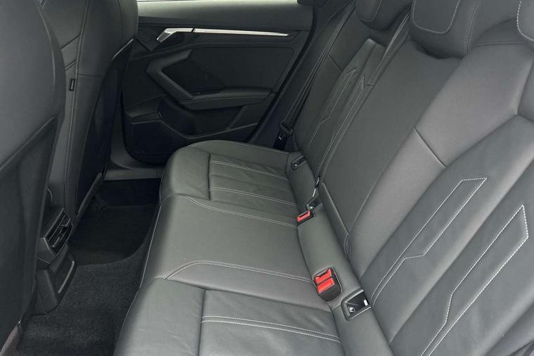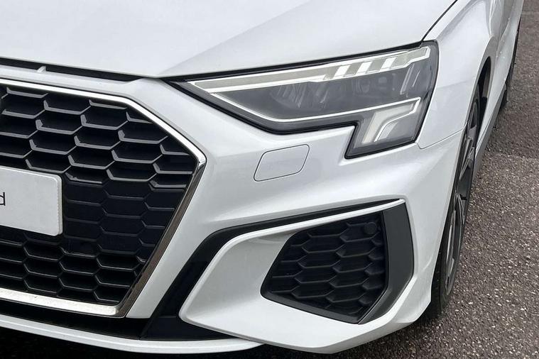 Audi connect emergency call and service, Audi drive select (Auto, Comfort, Dynamic, Efficiency and Individual), Audi smartphone interface, Audi Virtual Cockpit - 10.25" digital and colour instrument cluster, Automatic start/stop system with recuperation, Bluetooth interface, Collision avoidance assistant, Electromechanical power speed sensitive steering, Lane departure warning system, MMI Navigation Plus with high resolution 10.1" colour touch screen display, Service indicator, Trip computer, Voice control system with natural language interaction, 2xUSB-C connection with data and charging functions, 6 passive loudspeakers, DAB Digital radio, 3rd brake light, Acoustic glass windscreen, Aluminium window trim, Auto dimming frameless rear view mirror, Electrically adjustable/heated/folding/dimming door mirrors with kerb view includes integrated LED indications + kerb view function for passenger side, Front electric windows, Illuminated aluminium inserts front door sills with S logo, LED daytime running lights, LED headlights with LED rear lights and dynamic rear indicators, Light and rain sensors, Privacy glass - dark tinted rear window, rear door and side windows, Rear electric windows, Rear side air outlets in grained matt black, Rear wiper, S line bumpers, S roof spoiler, 12V socket and storage compartment in front centre console, 40/20/40 split folding rear seat bench with cupholder, Black cloth headlining, Dual zone electronic climate control, Front and rear centre armrest in leather, Front and rear headrests, Front/rear floor mats, Height and reach adjustable steering wheel, Interior lighting - glove compartment light and right hand side, Luggage compartment floor covering, Manual boot compartment lid, Manually adjustable front seats, Seat side bolsters, Stainless steel pedals and front footrest, Twin leather upholstery with front sports seats S embossed logo, Aluminium interior elements pack - A3 Sportback, S line styling pack - A3 Sportback, 3x3 point rear seat belts, Driver and front passenger airbag with passenger airbag deactivation, Electronic Stabilisation Control (ESC) including ABS, ASR and EDL, First aid kit with warning triangle and 2 safety vests, Front side airbags with head airbags and interaction airbag, Hill hold assist, Pre-sense front with pedestrian and cyclist detection, Seatbelt monitoring, Tyre pressure loss indicator, Anti theft alarm, Anti-theft wheel bolts, Electronically operated child lock, Immobiliser, Remote control central locking, Accent surfaces in the dashboard and centre console in platinum grey silk effect paint finish, Dark spectrum aluminium inlays,