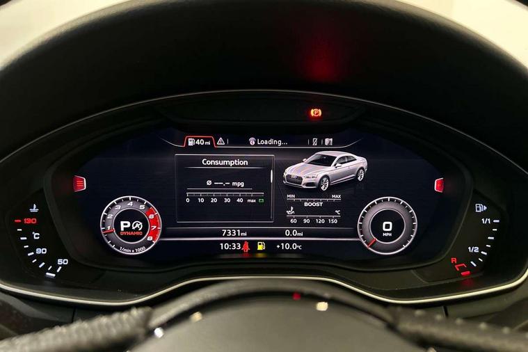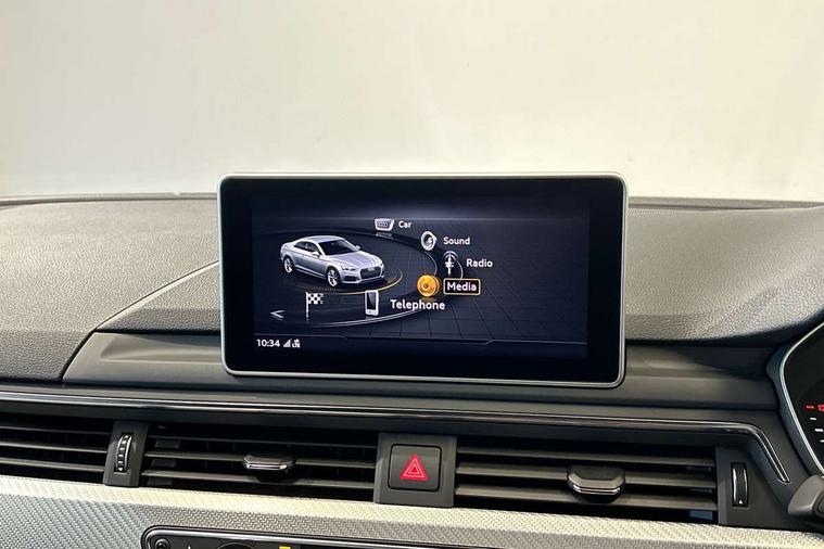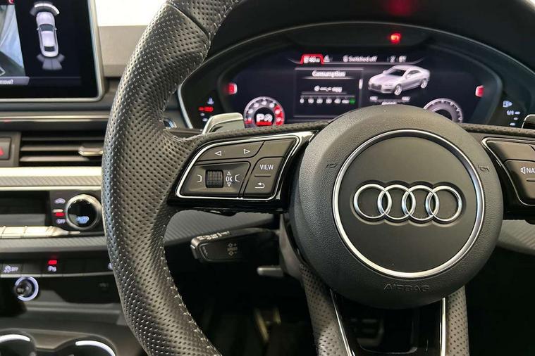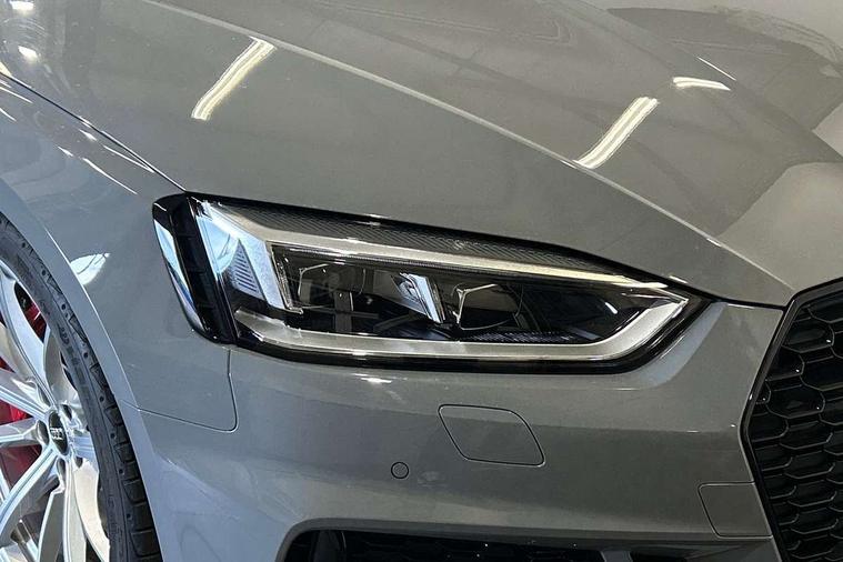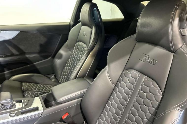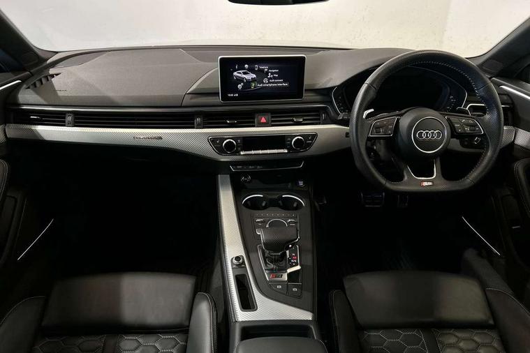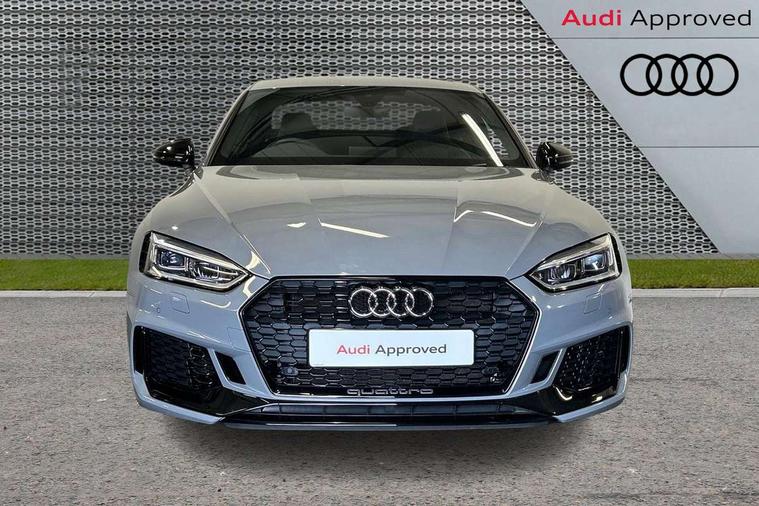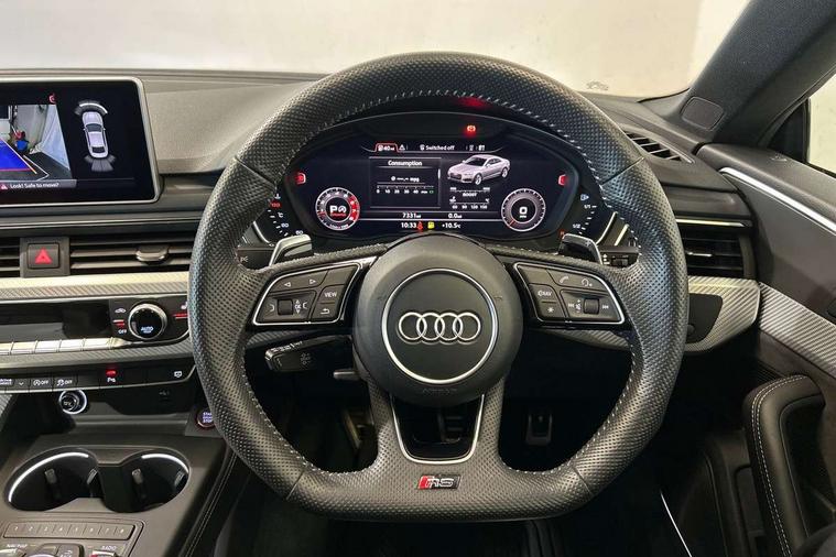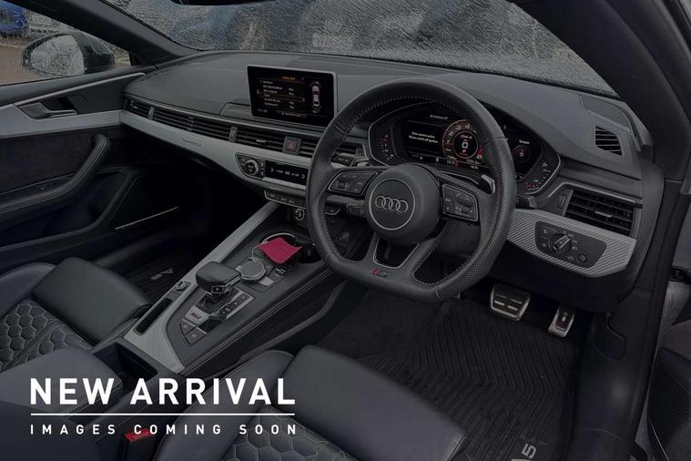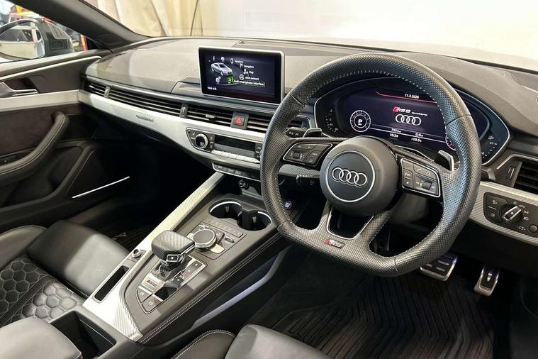 Audi connect, Audi drive select, Audi parking system plus with front and rear sensors, Audi smartphone interface, Colour driver's information system display, Electric boot release, MMI navigation plus with MMI touch, Mobile telephone preparation - bluetooth interface, Service interval indicator, Virtual cockpit, Voice control system, Quattro sports differential, 2 x USB charging port with aux input socket, CD player, DAB Digital radio, MMI radio plus with 7" colour MMI screen and MMI controller, Two SDXC card slots, Air inlets in titanium black, Auto dimming rear view mirror with acoustic windscreen, Body colour bumpers, Body colour door handles, Body colour rear diffuser with chrome strip, Electric front windows, Electrically adjustable and heated door mirrors, Front fog lights, Headlight washers, Heat insulated glass, High beam assistant, Rain and light sensors, Twilight grey matt radiator grille in matt aluminium inlay, Twilight grey matt rear diffuser, Twin chrome exhaust tailpipes x2, Adjustable steering column, Aluminium door sill trims, Automatic tri-zone climate control, Black headlining, Boot mat, Centre console with cupholders, Electric lumbar support, Fine Nappa leather upholstery, Front centre armrest, Front head restraints, Front/rear floor mats, Illuminated door sills, Isofix front passenger and rear seat preparation, Jack and tool kit, Massage function for front seats, Rear centre armrest, Rear headrests, Rear seat storage trays, Split folding rear seat, Stainless steel pedals and foot rest, Super sports seats, Top tether anchor plate for isofix child seat, Extended interior upholstery pack - A5/RS5, Non Smokers pack, ABS, ASR, Driver/Front Passenger airbags, Enhanced braking system, ESP + traction control, First aid kit, Front and rear curtain airbags, Front passenger airbag deactivation, Height adjustable front seatbelts, Multi-Collision braking, Pre-sense city emergency braking system, Seatbelt warning, Side airbags, Warning triangle, Anti theft system, Keyless start, Locking wheel bolts, Remote central locking, Space saver spare wheel,