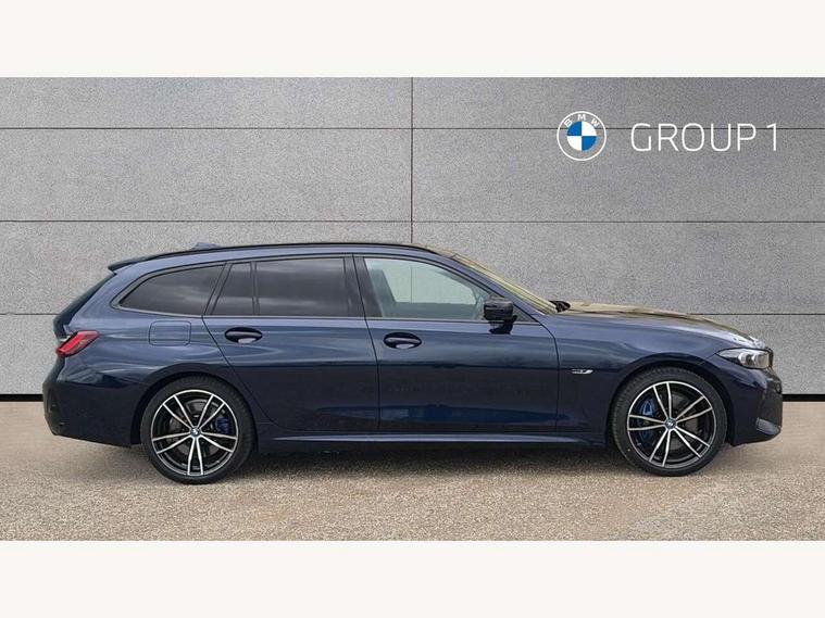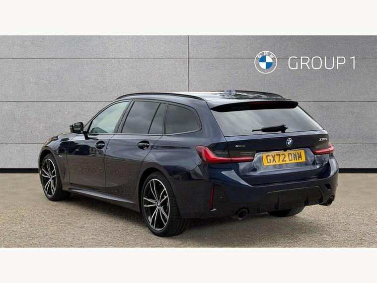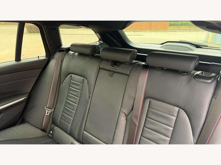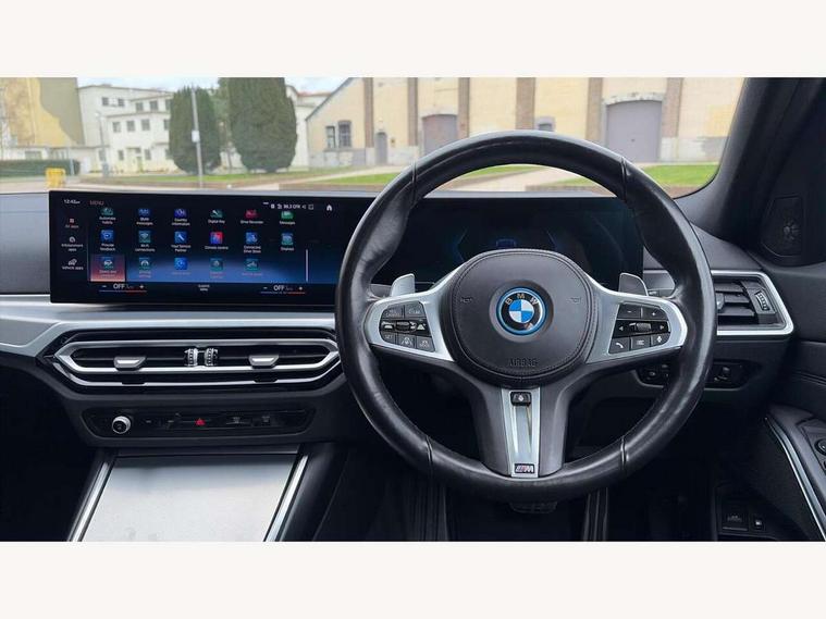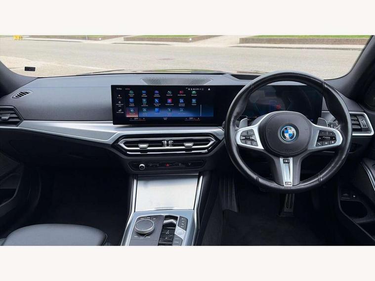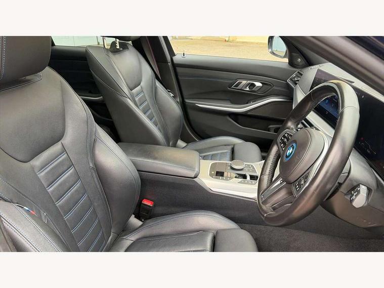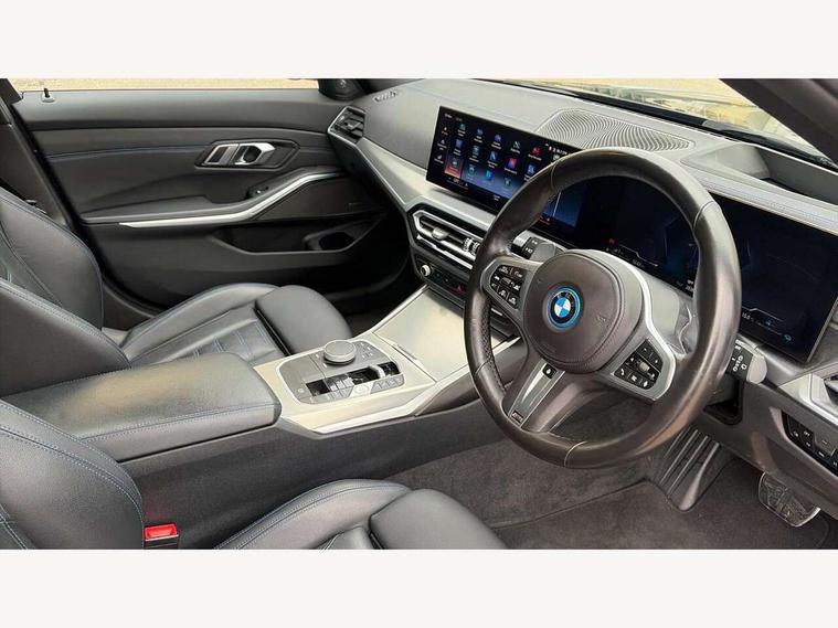 Active guard plus, Attentiveness assist, Automatic Start/stop button, BMW iDrive, BMW Teleservices, Condition based service, ConnectedDrive Services, Driving experience switch, Live cockpit plus with Navigation + 12.3" instrument display + 14.9" display, Intelligent voice assist, 2 USB, 4G LTE connect, Oil sensor for level and grade, PAS, Preparation for driver assistance, Shifting point display, Double joint spring strut front axle, Electronic differential lock control (EDLC), Fast charging cable - Mode 3, Flexible charger (Mode 2), Fuel tank breather system, Sport automatic transmission with steering-wheel mounted gearshift paddles and launch control, Standard suspension, DAB tuner, "Electrified by i" exterior badging on charging flap, 3rd brake light, Acoustic glazing, Automatic headlight beam throw control with load dependent regulating reaction, dynamic compensation of braking dive and acceleration squat, BMW emblem, engine compartment lid and tailgate, Body colour roof fin, Door sill strips, Electric windows - front and rear, with open/close fingertip control, anti-trap facility and comfort closing, Follow me home headlight function, Front and rear bumper system with replaceable deformation elements, Front apron plastic in body colour, Fuel filler flap - right rear in body colour, Heated washer jets, High gloss shadow line exterior trim, High gloss shadow line roof rails, Illuminated bow type door handles in body colour drivers side with door lock, Interior rear view electrochromatic mirror with automatic anti dazzle function, LED rear lights, Licence plate panel integrated into front bumper and tailgate, Matt black B-pillar finsher, Matt black window recess cover, Model designation on right side of tailgate, One piece front bumper cover including towing eye cover in body colour, Rain sensor with automatic headlight activation, Rear side wing doors, Rear wiper, Reversing lights, Side frame decorative moulding black matt, Visible exhaust tailpipe finisher, Welcome lights in interior and door handle area, 12V power socket in front storage compartment, 2 front cupholder in centre console with clamping elements and matt black inlay, 3 seat bench in 2nd row, 3 zone automatic air conditioning, 40:20:40 split folding rear seat with loading system, Ambient inside door handle light, Ambient light design projected onto the left and right entering and exiting area, Ambient lighting front and rear with 9 selectable colours, Ambient storage compartment lighting in the centre console, Anthracite headlining, Armrest integrated in front and rear door trim + front centre console armrest, Battery in luggage compartment, BMW ID, Contour lighting in instrument panel and door trim panel, Cruise control operation in steering wheel, Driver backrest width adjustment, Folding rear centre armrest with 2 cupholders, Front and rear ambient footwell lighting, Front and rear door exit lighting (left / right), Front and rear headrests, Front and rear reading lights, Front and rear velour floor mats, Front sport seats, Heated front seats, Height adjustable mechanically and infinitely variable steering column, Illuminated armrest storage compartment, Illuminated glove compartment, Illuminated luggage compartment, Lashing eyelets in luggage compartment, M Sport multifunction leather steering wheel, Make-up mirror lights, Single front passenger seat, Standard seat for driver and passenger with manual adjustment, Sunvisors with vanity mirrors and ticket pocket, Toolkit located in luggage compartment, Connected pack professional - 3 Series Saloon/Touring, Interior and exterior mirror pack - 3 Series Touring/Saloon, M Aerodynamics package - 3 Series Saloon/Touring, M sport exterior styling pack - 3 Series Saloon/Touring, Storage compartment pack - 3 Series Saloon/Touring, 3x3 point rear seatbelts, BMW emergency call, Child locks on rear doors, Crash sensor activating of airbags, Unlocking doors, hazard warning lights, interior light, safety battery terminal, Driver and front passenger with seat occupancy detection for driver's and passenger side, Driver and passenger side airbags, body protection at side and airbags deploy from seat backrests, Dynamic brake control, Dynamic stability control + (DSC+) - Anti-lock Braking System (ABS) with brake assist and cornering brake control + Automatic Stability Control (ASC), Dynamic Traction Control - DTC, Electric parking brake including automatic hold function and automatic release of the parking brake when driving off, Head airbags in 1st and 2nd row, head protection at side, curtain airbags open from headliner above 1st and 2nd row, Plastic fuel tank, Side impact protection, Tyre pressure monitoring with three level warning strategy, Ventilated front and rear disc brakes, Warning triangle and first aid kit, Alarm system, Centre lock switch, Closing system with central locking, Electronic vehicle immobiliser,