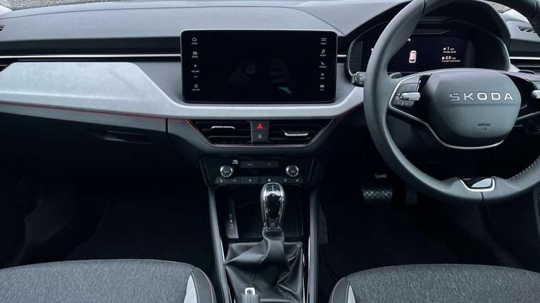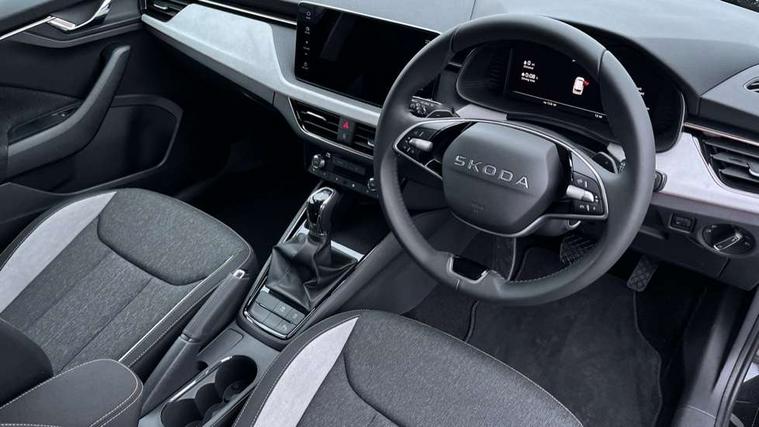 Advanced driver attention and drowsiness monitor, Bluetooth system, E-call, Front assist system, PAS, Rear parking sensors, Rear view camera, Service indicator, Speed limiter, Traffic sign recognition, Virtual cockpit with 10.25" display, Voice control system, Wireless smartlink, 4 USB C ports, 8 Speakers, 9.2" Skoda navigation display, DAB Digital radio, Auto dimming rear view mirror, Automatic headlight control with coming home and leaving home feature, Body colour bumpers, Body colour door mirrors and handles, Chrome grille surround, Chrome roof rails with chrome window surround, Front and rear electric windows, Heated rear window, LED daytime running lights, LED high beam, LED low beam, LED third brake light, Light sensors, Privacy glass, Rear side wing doors, Rear wiper, Ticket holder inside windscreen, 12V socket in luggage compartment, 3 seat bench in 2nd row, Accent black door inserts, Ambient lighting in white/red, Cargo elements, Chrome inner door handles, Copper hotstamping, Driver and passenger sun visors with vanity mirror, Dual zone climate control, Front and rear roof lights, Front centre armrest, Front head restraints, Glove compartment with illumination, Height adjustable driver seat, Height adjustable front passenger seat, Ice scraper, Inner circulation control with pollen filter, ISOFIX on front passenger seat, Isofix preparation for back seats, Leather gearknob and handbrake lever, Lodge cloth upholstery, Manual lumbar support for front seats, Net package and top tether hooks in boot space, Net under rear shelf, Overhead glasses storage compartment, Pocket on the back of both front seats include mobile phone pockets, Rake/reach adjustable steering wheel, Reading lights, Rear centre armrests, Single front passenger seat, Suedia grey decor inserts, Textile floor mats, Third rear headrest, Top tether for front passenger seat, Umbrella in driver's door, Convenience pack - Kamiq, 3x3 point rear seatbelts, Airbags - driver and front passenger, Disc brakes, ESP, Extended and predictive pedestrian/cyclist protection, Front passenger airbag deactivation switch, Front side airbags with curtain airbags, Hill hold control, Manual leather parking brake, Manual rear child locks, One tone horn, Seatbelt reminder for driver an co-driver, Traction control, Tyre pressure monitor, Anti-theft alarm system with interior monitoring, backup horn, towing protection and remote central locking with SAFE system, Anti-theft wheel bolts, Electronic engine immobilizer,