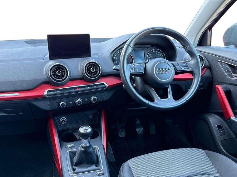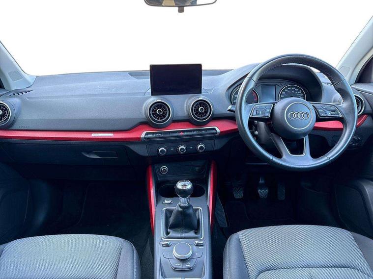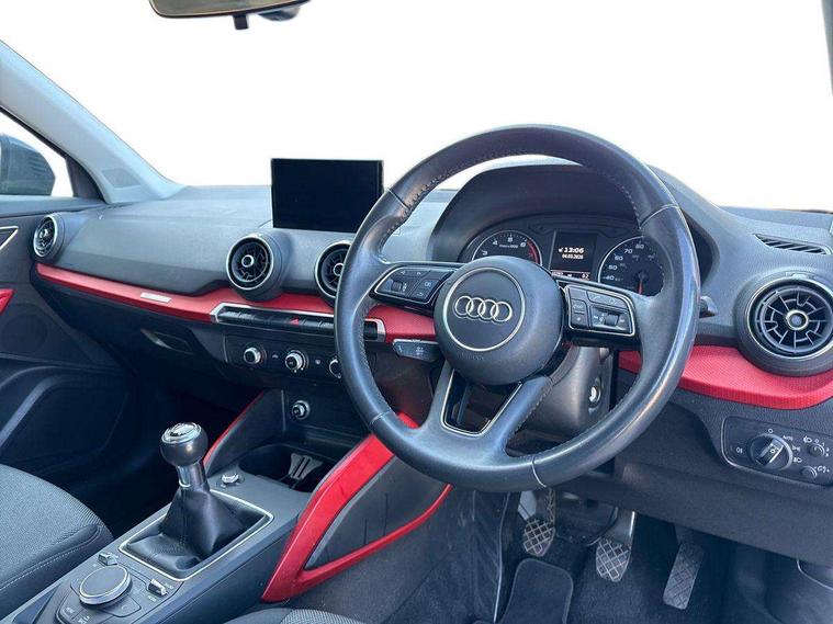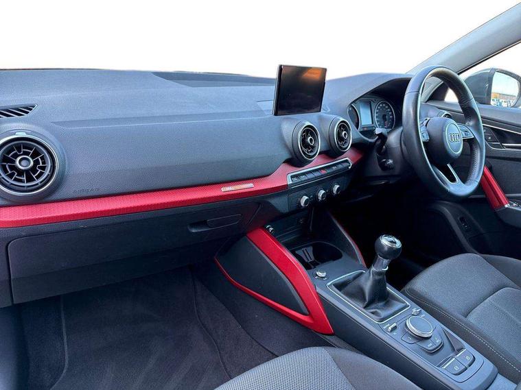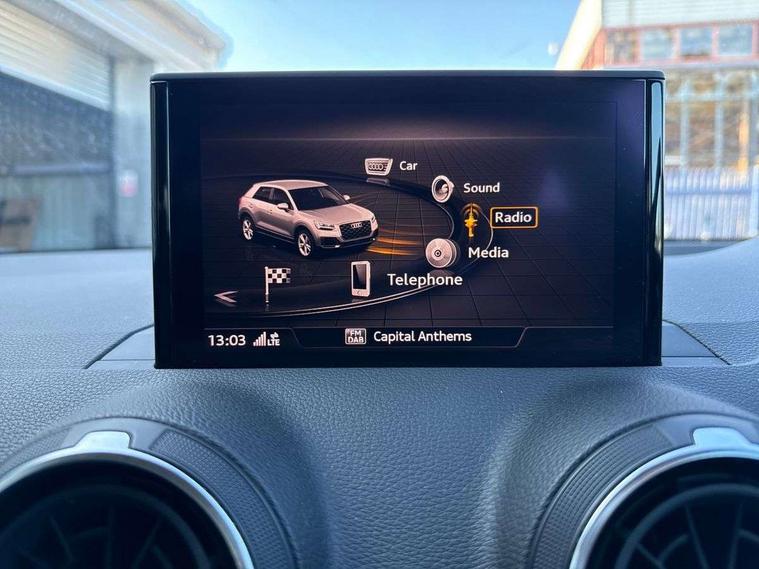 Audi drive select, Audi smartphone interface, Bluetooth hands free telephone connection, MMI - Multi Media Interface control system, MMI SD card Navigation, PAS, Service interval indicator, Voice control system, Dynamic suspension, Audi music interface, Aux input, CD player, DAB digital radio module, MMI radio plus with 7" colour MMI screen and MMI controller, USB port, Body colour door mirrors, Chrome exhaust tailpipe, Door mirror integrated indicators, Electrically adjustable and heated door mirrors, Front and rear electric windows, Rear wiper, Sunband for windscreen, Aluminium door sill trims, Centre console with storage/cupholders, Front and rear door pockets, Front and rear headrests, Front and rear velour floor mats, Front centre armrest, Front sports seats, Glovebox, Height adjustable front seats, Height/reach adjust steering wheel, ISOFIX on front passenger and rear outer seats, Storage compartment in rear centre console, Titanium grey cloth headlining, Non smoking pack - Q2, 3x3 point rear seatbelts, ABS+Electronic Brake force Distribution, Curtain airbags, Driver and passenger airbags, Driver and passenger side airbags, EDL + ASR, Electrically operated child locks on rear doors, Electromechanical parking brake, ESP, Multi-Collision braking, Pre-sense front with pedestrian recognition, Seatbelt warning light, Tyre pressure monitoring system, Warning triangle and first aid kit, Locking wheel bolts, Remote central locking, Thatcham category 1 alarm + immobiliser, Aluminium interior trim,