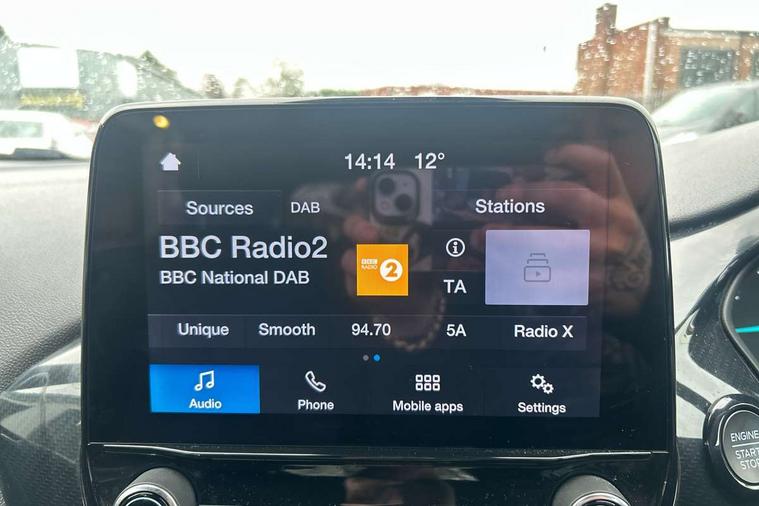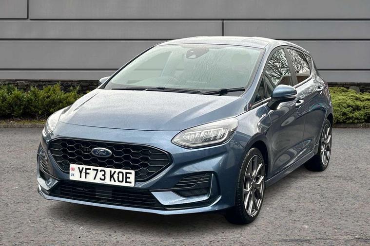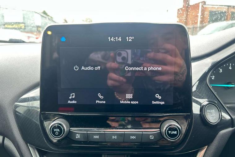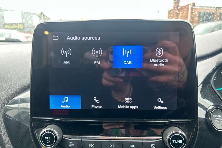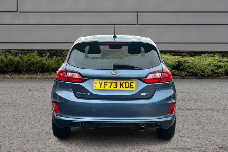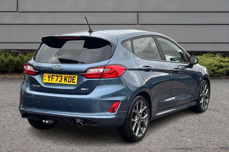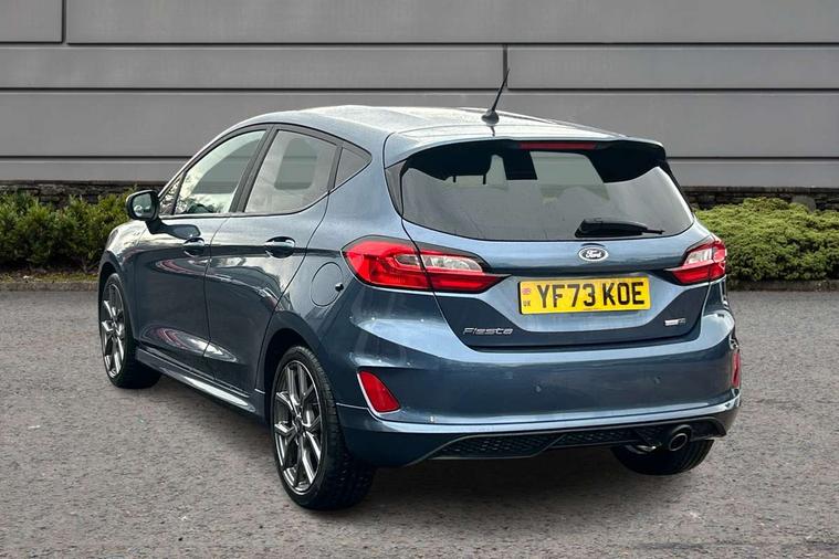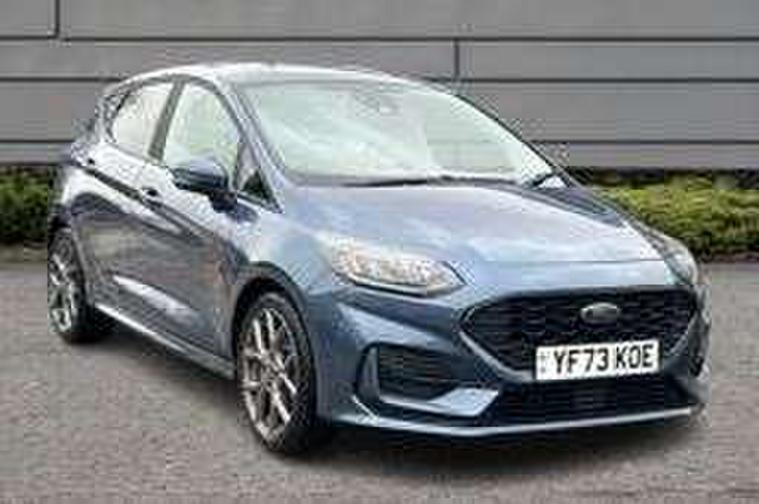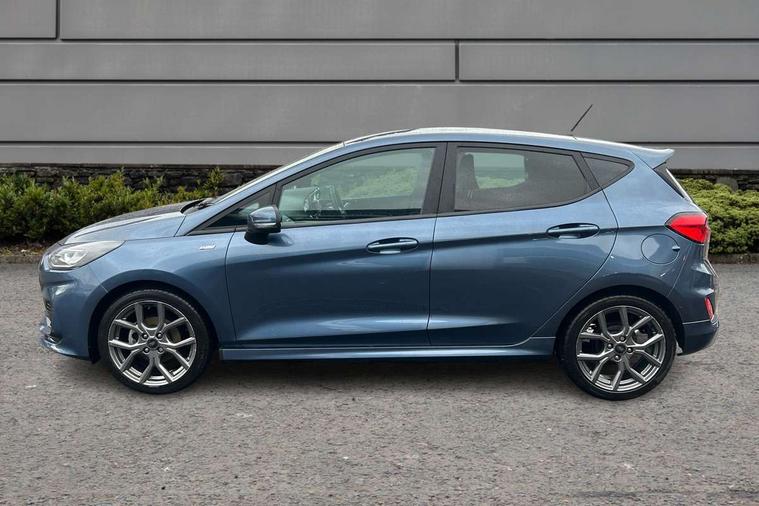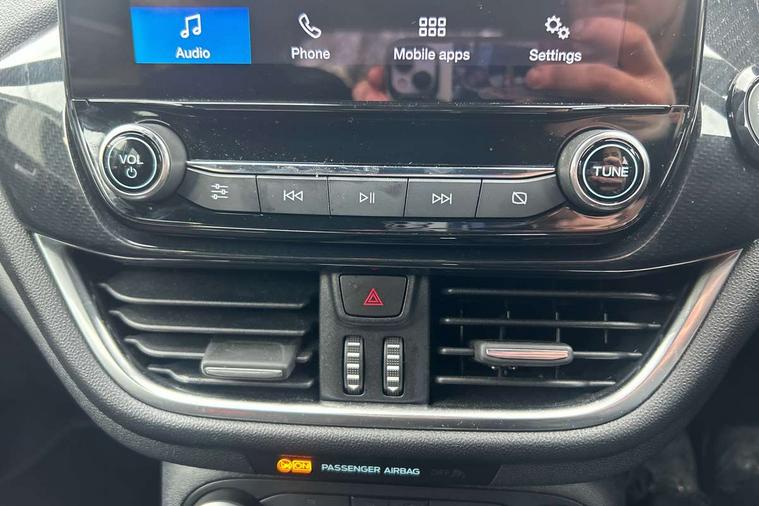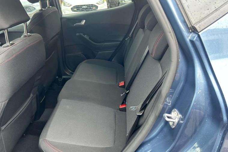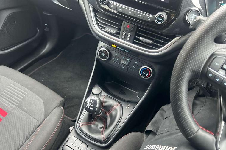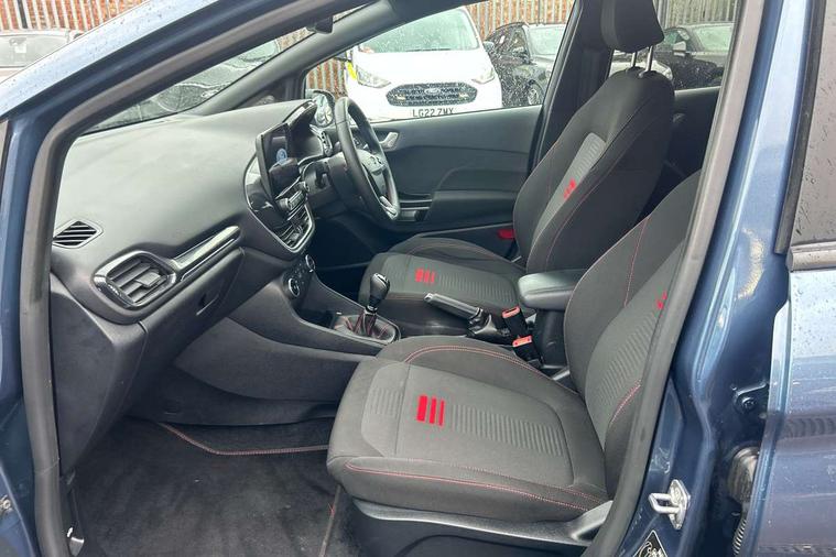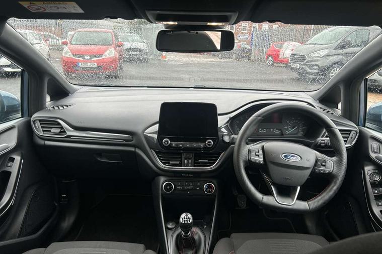 Bluetooth system, Electric power steering, Ford easy fuel, Ford SYNC 3 Navigation system incl 8" touchscreen, 7 speakers, FordPass connect, Apple carplay, android auto, voice control and emergency assistance, Rear parking distance sensors, Selectable drive modes (Normal, Sport, Track), Trip computer, Sports suspension, 2 USB ports, Auxiliary input socket, DAB Digital radio, Steering wheel mounted controls, Body colour bumpers, Body colour door handles, Body colour large rear spoiler, Body coloured electrically operated and heated door mirrors with side indicators, Cornering front fog lights, Electric front windows/one touch facility, Electric rear windows, LED Night signature to rear lights, Quickclear heated windscreen, Rain sensing wipers and auto dimming rear view mirror, Rear privacy glass, Rear wiper, Unique ST-Line upper grille & full bodystyling kit with ST-Line wing badges, 3 spoke flat bottomed leather steering wheel, 60/40 split folding rear seat, Adjustable head restraints, Black headlining, Boot carpet, Centre console with opening armrest, 2x cupholders, 12v and USB, Chrome inner door handles, Cloth upholstery, Footwell illumination, Front floor mats in velour, Front map reading lights, Front seat and rear pockets, Illuminated glovebox, Leather gaiter, Load area light, Manual 2 way passenger seat adjust, Manual 4-way driver seat adjust, Manual air conditioning, Overhead console with sunglasses holder, Pollen filter, Rake/reach adjustable steering wheel, Sensico wrapped steering wheel, Sports front seats, NCAP Pack - Fiesta, 3 point seatbelts on all rear seats, ABS+EBA, Curtain airbags, Driver and passenger airbags, Drivers knee airbag, Electronic stability control with hill start assist, Front passenger airbag deactivation, Front side airbags, Seatbelt warning, Two tone horn, Tyre pressure monitoring system, Keyless start with 'Ford Power' starter button, MyKey system, Remote central locking & engine immobiliser, Thatcham Cat.1 alarm, 17" 5 spoke alloy wheels with rock metallic finish,