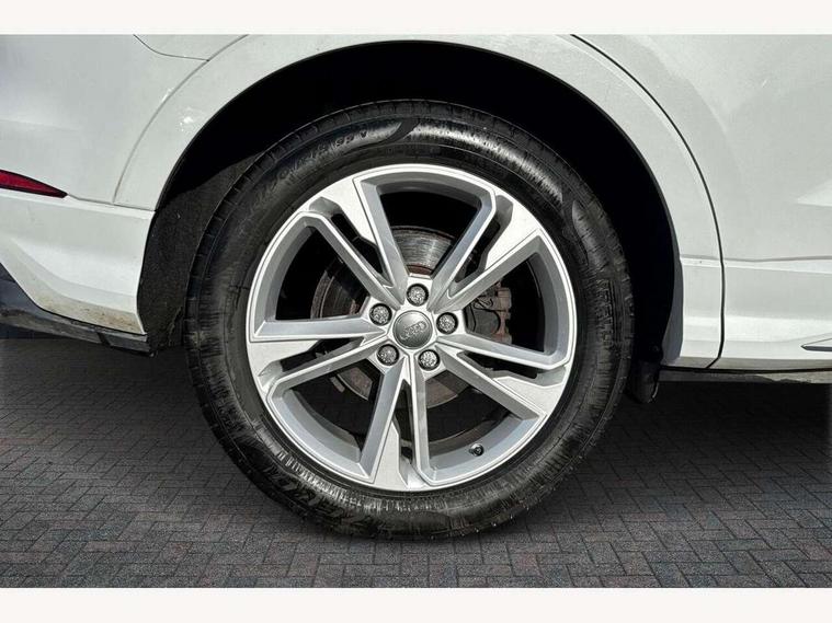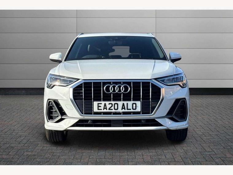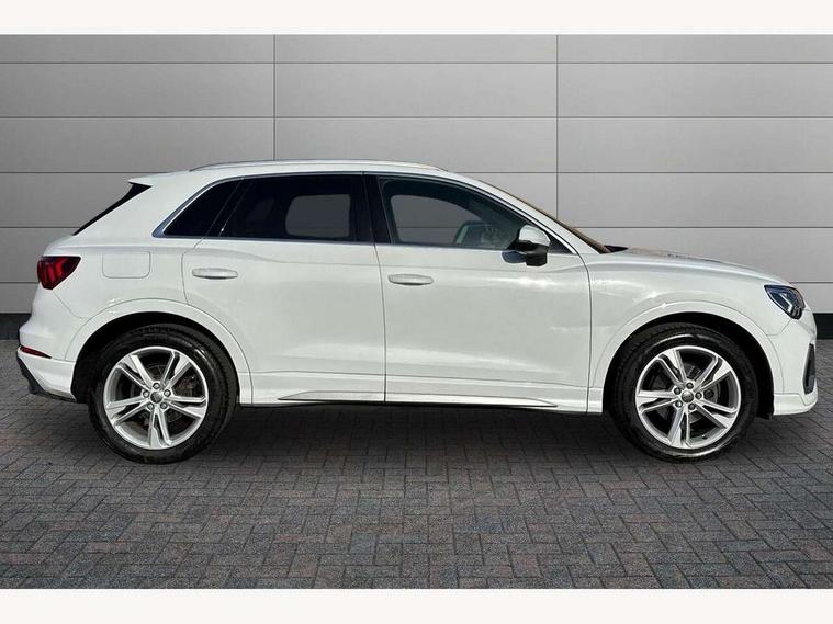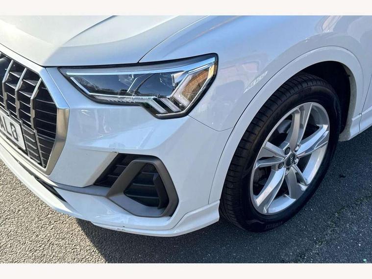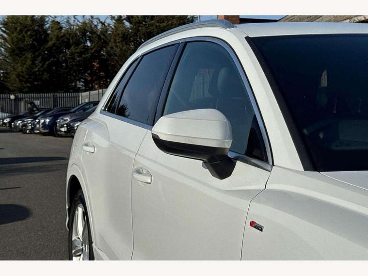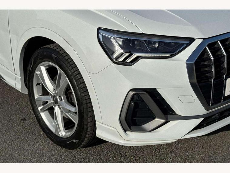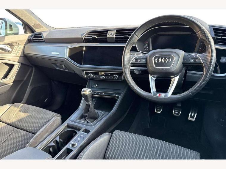 Apple CarPlay, Audi connect safety and service (e-call), Audi drive select, Audi lane departure warning, Audi side assist, Audi smartphone interface, Audi Virtual Cockpit - 10.25" display, Bluetooth interface, Camera based traffic sign recognition, Cruise control + speed limiter, MMI Navigation Plus with high resolution 10.1 inch touchscreen colour display, Power opening/closing tailgate, Progressive steering, Rear parking sensors, Service interval indicator, Start stop system with recuperation, Voice control system with natural language interaction, Sports suspension, 1 x USB type C and 1 USB type A charging points, 6 speakers, DAB digital radio module, Acoustic windscreen, Aluminium roof rails, Aluminium window trim, Auto dimming frameless rear view mirror, Body coloured bumpers, Electrically folding, adjustable and heated door mirrors with integrated LED side indicators and kerb view function for passenger side, Front and rear electric windows, Front fog lights, Front side air inlets in matt platinum grey, Front spoiler blade in matt platinum grey, Grille vertical bars in aluminium silver/Matt, High gloss black finish B and C pillars, LED headlights with LED daytime running lights and dynamic rear indicator, LED rear lights, Privacy glass, Rain and light sensors, Rear diffuser strip in matt titanium black, S Line badge on wings, S Line front and rear bumpers, Side skirt insert in matt Platinium grey, Silver chrome grille surround, Titanium black radiator grille, 12V socket in rear centre console, 40:20:40 split folding rear bench seat, 60:40 forwards/backwards position and backrest angle, Adjustable rear seat bench/backrest with centre armrest and cupholder, Aluminium door sill trims, Black cloth headlining, Dual zone electronic climate control, Front and rear black floor mats with contrast stitching in rock grey, Front and rear headrests, Front and rear roof module including reading lights, Front centre armrest with storage compartment and angle adjustment, Glove compartment lighting, Height and reach adjustable steering wheel, Illuminated door sill trims with S logo, ISOFIX child seat mounting and Top Tether with front passenger airbag deactivation, Luggage compartment light, Manual front seats with height adjustment, Perforated leather gearknob, Stainless steel luggage compartment sill finisher, Stainless steel pedals, Non smoking pack - Q3, 3x3 point rear seatbelts, 6 airbags - Driver, front passenger, curtain and side windows, Audi pre-sense front with pedestrain and cyclist recognition, Electrically operated child locks on rear doors, Electromechanical parking brake, Electronic stabilisation control including ABS, ASR and EDL, Hill descent control, Hill hold assist, Pre sense basic, Seatbelt monitoring, Tyre pressure warning, Warning triangle and first aid kit, Anti theft alarm, Anti theft wheel bolts, Remote central locking, Dark matt brushed aluminium inlay, Leatherette door armrest, MMI touch colour display in gloss black with aluminium surround,