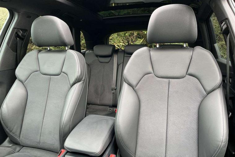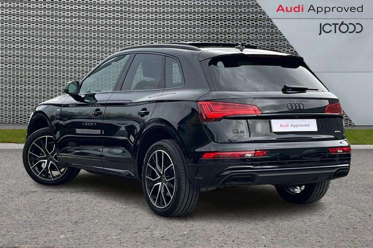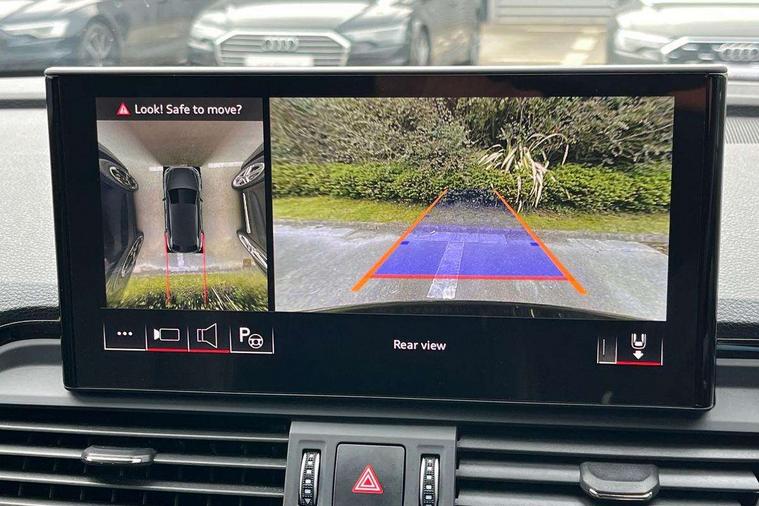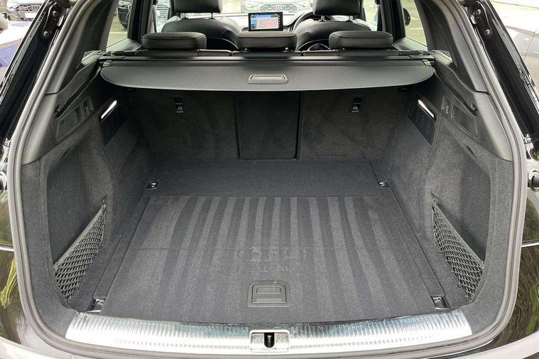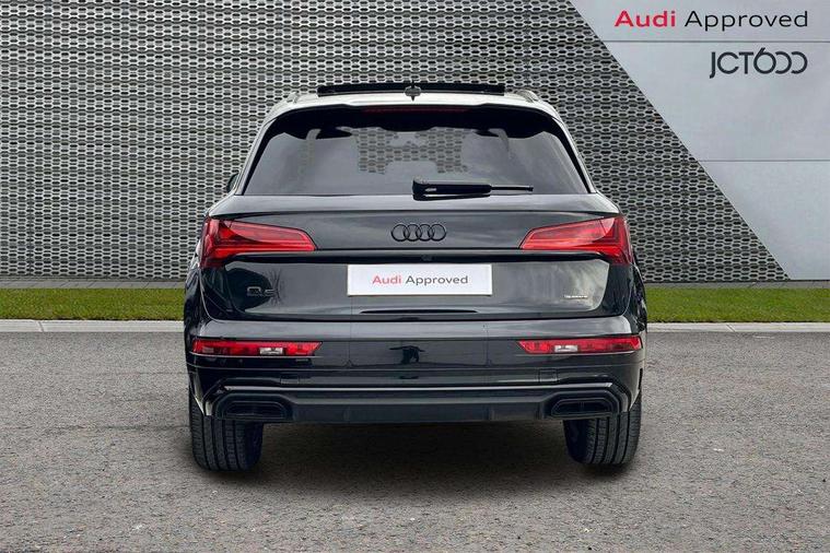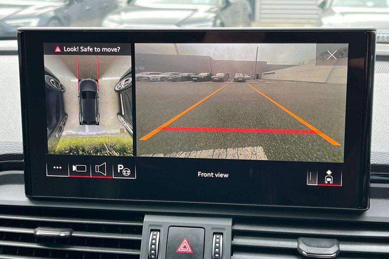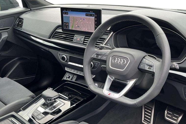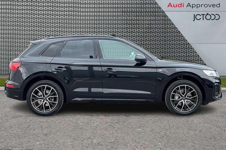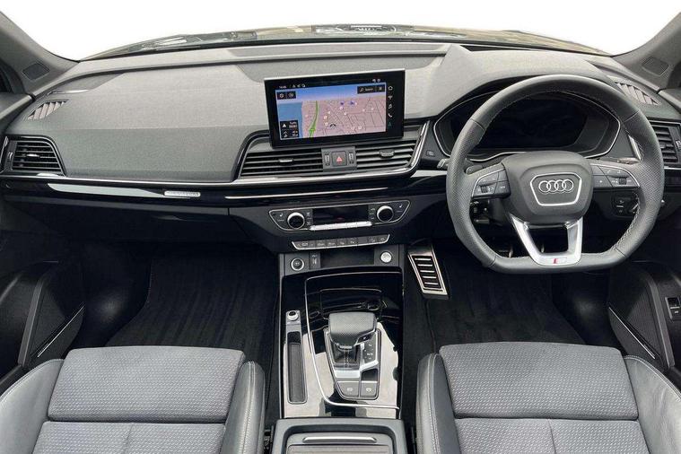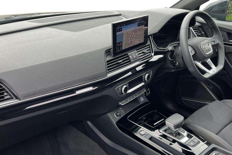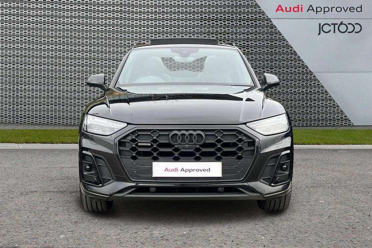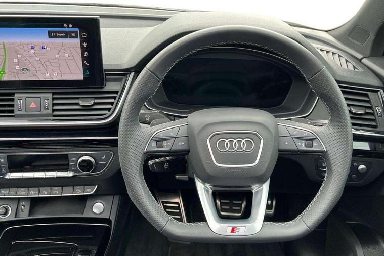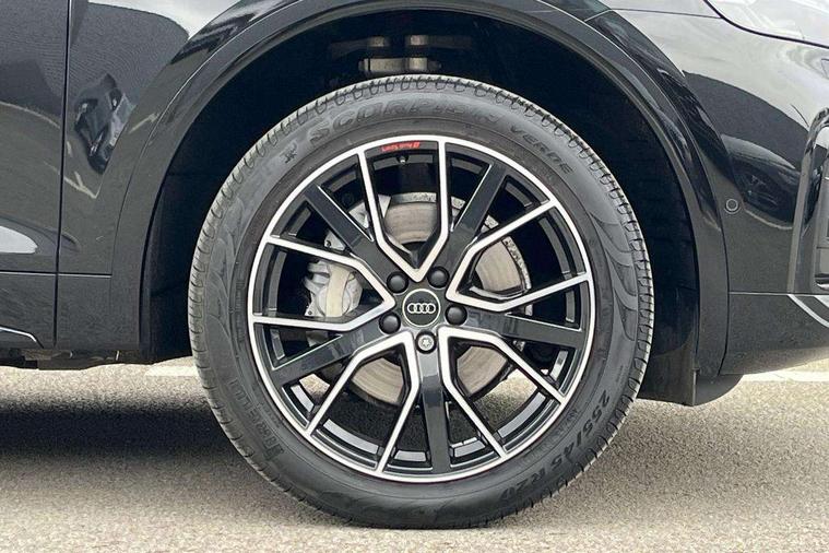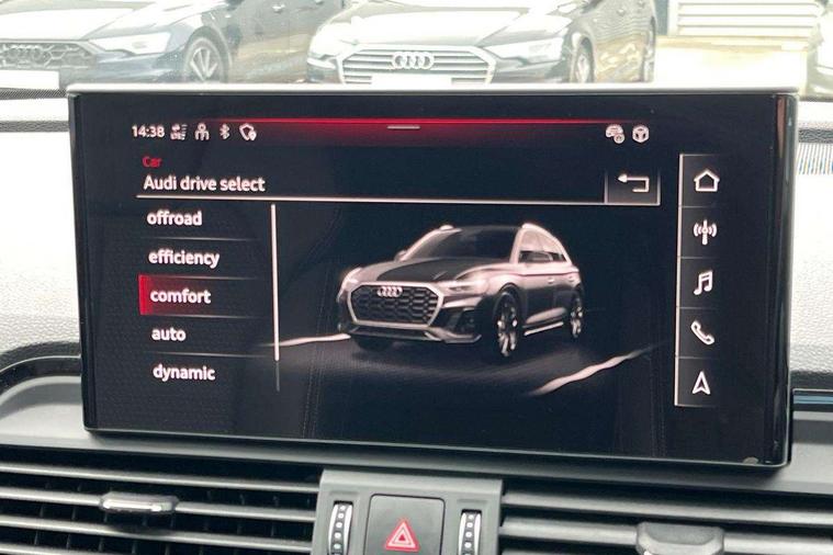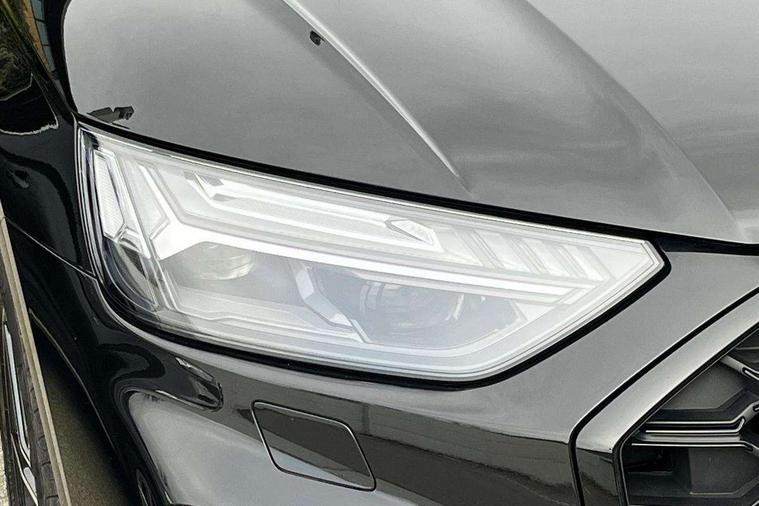 Acoustic front and rear parking sensor, Audi connect safety and service (e-call), Audi drive select, Audi virtual cockpit plus with 12.3" screen and three different layout designs, Audi wireless smartphone interface, Automatic start-stop system with coasting functionality and efficiency programme, Bluetooth interface, Camera based traffic sign recognition, Electro - mechanical power assisted steering, Lane departure warning, MMI navigation plus with 10.1" touch screen, Power tailgate, Reversing camera, Service interval indicator, Voice control system with Audi hotword activation "Hey Audi", Diesel particulate filter, Quattro on demand, S line sports suspension, 2 x USB charging port with aux input socket, 8 loudspeakers, DAB Digital radio, Acoustic windscreen, Auto dimming door mirrors, Auto dimming frameless rear view mirror, Automatic headlight adjustment, Automatic headlights and windscreen wipers, Black roof rails, Black styling with black rings, Body colour bumpers, Body colour rear diffuser with matt aluminium silver surrounds, Body colour underbody protection, Chrome plated exhaust trims, Daytime running lights, Door sills in Selenite silver, Electric adjustable/heated/folding door mirrors, Front air inlet surrounds in aluminium, Front and rear electric windows, Front radiator grille in honeycomb design, LED 3rd brake light, LED headlights and LED tail lights, Loading edge protection in stainless steel, Lower bumpers painted in contrast Manhattan grey, Rear chrome trim strip below lights, Rear privacy glass and rear side windows, Rear side wing doors, Rear wiper, Roof bars, S Line badges on the front wing panels, S Line front and rear bumpers, S Line rear spoiler, S Line side skirts, 3 rear headrests, Black cloth headlining, Comfort front centre armrest, Contrast stitching on seats, steering wheel and gear lever gaiter, Deluxe 3 zone electronic climate control, Front head restraints, Front sport seats with S embossed logo, Front/rear floor mats, Gear lever in black leather, Heated front seats, Height/reach adjustable steering column, Illuminated door sill trims with S logo, Luggage compartment cover, Manual seat adjustment with 4-way electric lumbar support, Single front passenger seat, Stainless steel pedals, Sunvisors with vanity mirrors, Top surface of the rear centre armrest in artificial leather, High gloss pack - Q5, LED interior light pack - Q5, 3 point seatbelts on all seats, 6 airbags - Driver, front passenger, curtain and side airbags, Attention and drowsiness assist, Electrically operated child locks on rear doors, Electromechanical parking brake, Electronic stabilisation control including ABS, ASR and EDL, First aid kit with warning triangle and vests, Front passenger airbag deactivation, Hill descent control, Hill hold assist, ISOFIX child seat mounting for front passenger seat and ISOFIX child seat mounting with Top Tether for outer rear seats, Multi collision brake assist, Pop-up bonnet for pedestrian protection, Pre sense city, Seatbelt monitoring, Tyre pressure warning, Anti theft alarm, Anti-theft wheel bolts, Remote central locking, Remote control key with SAFELOCK and keyless go, Air vents inserts and centre console in gloss black, Tool kit, Tyre repair kit,