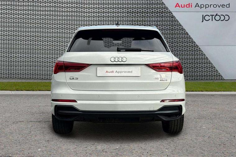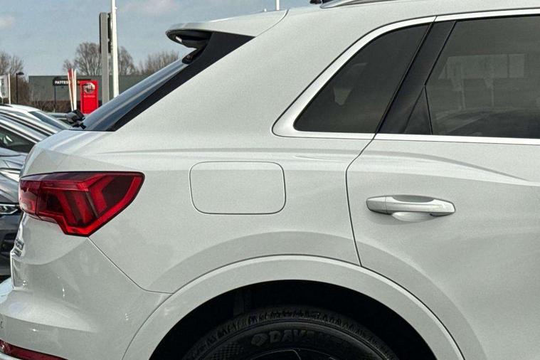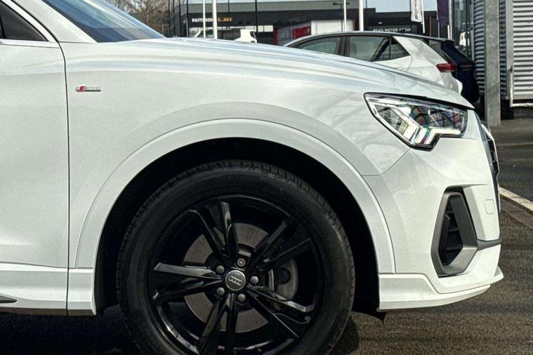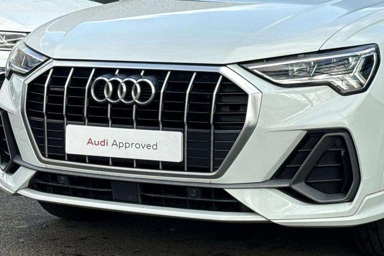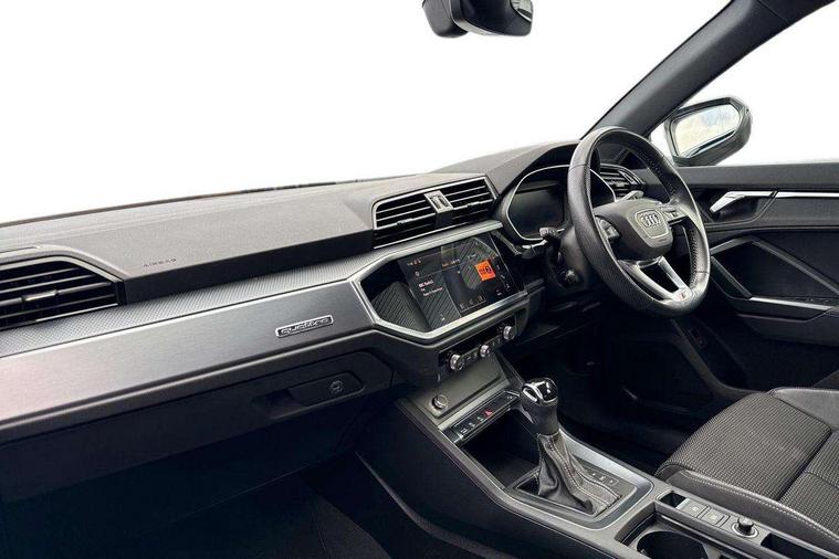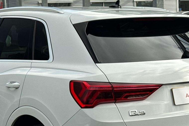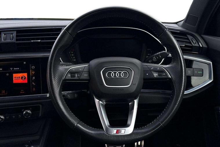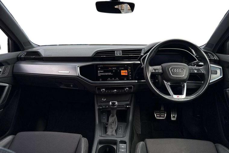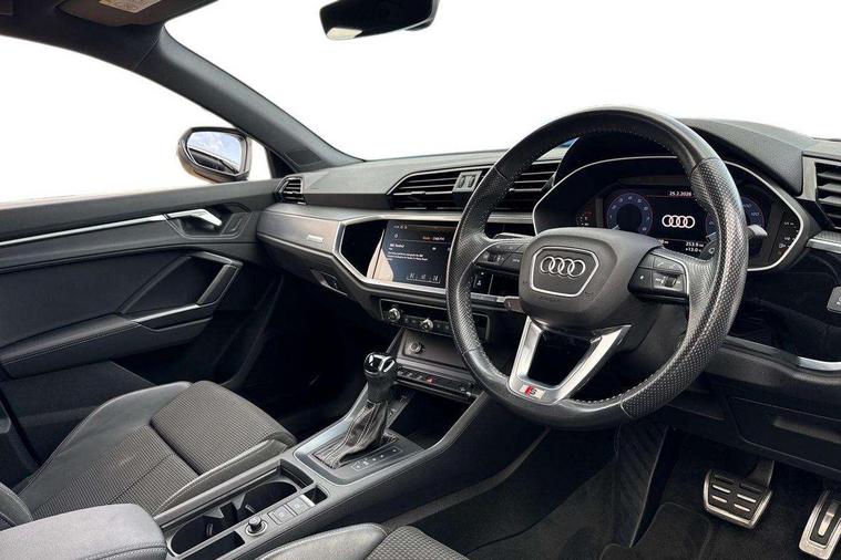 Audi connect safety and service (e-call), Audi drive select, Audi lane departure warning, Audi side assist, Audi Virtual Cockpit - 10.25" display, Bluetooth interface, Camera based traffic sign recognition, MMI Navigation Plus with high resolution 10.1 inch touchscreen colour display, Power operated tailgate, Progressive steering, Service interval indicator, Smartphone interface includes wireless Apple carplay/Android Auto, Start stop system with recuperation, Voice control system with natural language interaction, Sports suspension, 1 x USB type C and 1 USB type A charging points, 6 passive loudspeakers, DAB digital radio module, Acoustic windscreen, Aluminium roof rails, Aluminium window trim, Auto dimming frameless rear view mirror, Body coloured bumpers, Electrically folding, adjustable and heated door mirrors with integrated LED side indicators and kerb view function for passenger side, Front and rear electric windows, Front fog lights, Front side air inlets in matt platinum grey, Front spoiler blade in matt platinum grey, Grille vertical bars in aluminium silver/Matt, High gloss black finish B and C pillars, LED headlights with LED daytime running lights and dynamic rear indicator, LED rear lights, Privacy glass dark tinted rear and rear-side windows (from B-pillar backwards), Rain and light sensors, Rear diffuser strip in matt titanium black, S line badges on front wings, S Line front and rear bumpers, Side skirt insert in matt Platinium grey, Silver chrome grille surround, Titanium black radiator grille, 12V socket in rear centre console, 40:20:40 folding with manual adjustment for 60:40 forwards/backwards position and backrest angle, Adjustable rear seat bench/backrest with centre armrest and cupholder, Black cloth headlining, Dual zone electronic climate control, Front and rear black floor mats with contrast stitching in rock grey, Front and rear headrests, Front and rear roof module including reading lights, Front centre armrest, Glove compartment lighting, Height and reach adjustable steering wheel, Illuminated door sill trims with S logo, ISOFIX child seat mounting for front passenger with airbag deactivation and outer rear seat including top tether attachment point for outer rear seats, Luggage compartment light, Manual front seats with height adjustment, Perforated leather gearknob, Stainless steel luggage compartment sill finisher, Stainless steel pedals, Non smoking pack - Q3, 3x3 point rear seatbelts, 6 airbags - Driver, front passenger, curtain and side windows, Audi pre-sense front with pedestrain and cyclist recognition, Electrically operated child locks on rear doors, Electromechanical parking brake, Electronic stabilisation control including ABS, ASR and EDL, Hill descent control, Hill hold assist, Pre sense basic, Seatbelt monitoring, Tyre pressure warning, Warning triangle and first aid kit, Anti theft alarm, Anti theft wheel bolts, Remote central locking, Dark matt brushed aluminium inlay, Detail dashboard around MMI touch colour display in glass look, black with surround in aluminium look, Leatherette door armrest,
