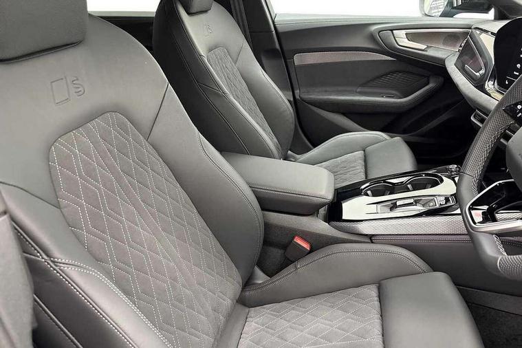 Adaptive cruise control, Advanced driver attention and fatigue montior, Audi application store, Audi assistant, Audi connect emergency call and service, Audi drive select, Audi virtual cockpit plus with 11.9" OLED colour display, Automatic start/stop system with coasting functionality, Camera based traffic sign recognition, Intersection assist, Lane change assistant with exit warning system, rear cross traffic alert and rear turn assist, Lane departure warning with emergency assist, MMI 10.9" front passenger touch display, MMI navigation plus with high resolution 14.5" OLED touchscreen colour display, Park assist plus, Parking system plus with 360 display, Progressive steering with servotronic, Smartphone interface, Swerve assist and turn assist, Top view camera, Traffic sign based speed limiter, Sports suspension lowered by 20mm, 2 USB-C ports in both the front and rear, Audi sound system impressive sound with 8 loudspeakers including centre speaker and subwoofer, 6-channel amplifier with a total output of 180 watts, DAB digital radio reception, Smartphone compartment with wireless charging, Aluminium window trims, Auto dimming rear view mirror, Black door handles, Black roof rails, Dark chrome-plated tailpipe trims, Door mirrors - electrically adjustable, heated, folding and auto dimming on both sides, Front and rear electric windows, Front door sill trims with aluminium inlays, illuminated with 'S' logo, Headlight cleaning system, High beam assist, LED daytime running lights, LED rear lights pro incl. dynamic rear indicators and illuminated light strip with animated coming and leaving home function, LED third brake light, Matrix LED headlights with eight light signatures selectable via the MMI or the myAudi app, Privacy glass, Rear and side windows with heat insulating glass, Rear side wing doors, Rear wash/wipe, S Line badges on the front wings, S line bumpers, radiator grille and diffuser in phantom black and diffuser insert in matt anthracite, White rhombus logo projection light in exterior mirrors, Windscreen with acoustic glazing, 3 rear headrests, 3 seat rear bench, 3 spoke leather steering wheel with multi-function buttons with touch control, flattened on top and bottom, with S badging and contrast stitching, 3-zone automatic climate control, 40:20:40 split folding rear seat bench with centre armrest and cup holders, Comfort front centre armrest, Electrically adjustable front seats, Front and rear floor mats, Front sport seats with integrated headrest and S embossed logo, Headlining in black cloth, Heated front seats, i-Size child seat mounting on the front passenger side and outer rear seats, i-Size and top tether on the outer rear seats, Luggage compartment lid, electrically opening and closing, Manual steering column height and depth adjustment, Memory function for driver seat, Single front passenger seat, Stainless steel pedals and footrest, Steering wheel grips in perforated leather and shift paddles, Ambient lighting package plus - A5, Black styling package plus - A5, 3x3 point rear seat belts, Acoustic vehicle alerting system, Convenience key with safelock, Driver airbag, Electric child safety locks, First aid kit with warning triangle and vests, Front emergency brake assist, Front passenger airbag, Front passenger airbag deactivation, Hill hold assist, Occupant detection in rear seat area, Proactive passenger protection system for front, sides and rear, Red brake calipers, Seat belt monitoring with rear seat occupant reminder, Side airbags in front and rear with head airbag system and front interaction airbag, Tyre pressure loss indicator, Anti theft alarm, Anti-theft wheel bolts, Keyless Go, Accent surfaces and control buttons in gloss black, Black dashboard with contrast stitching, Softwrap in Dinamica with contrast stitching, Upper and lower interior elements in dinamica microfiber, 20" 5 arm fold design Audi sport alloy wheels in silk matt grey and gloss turned finish, Tyre repair kit,