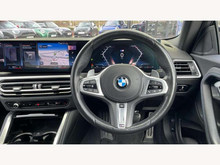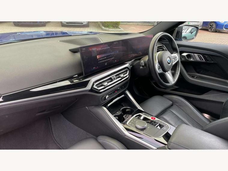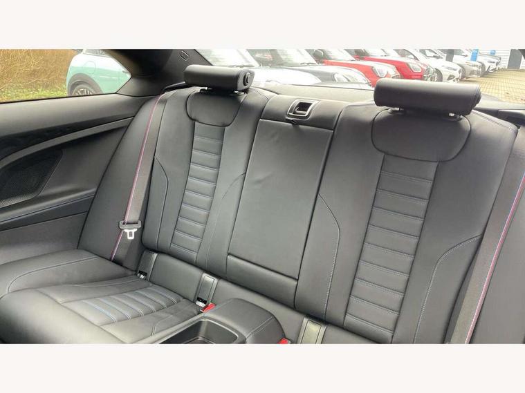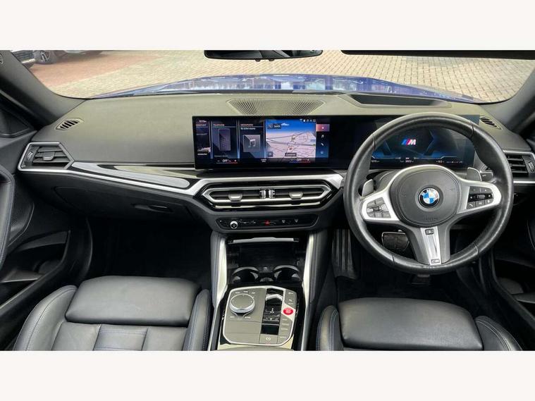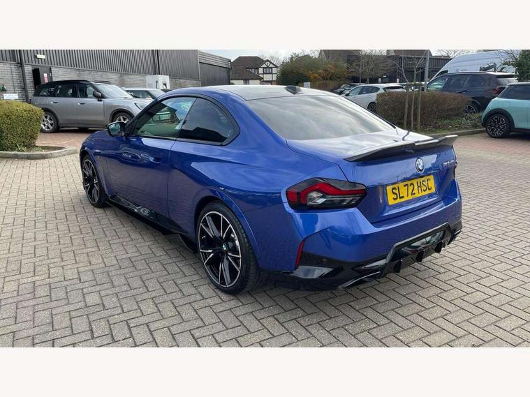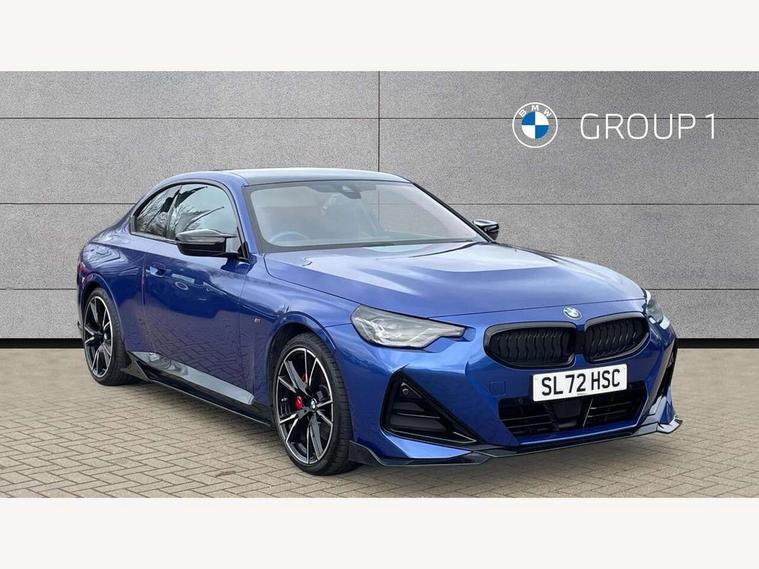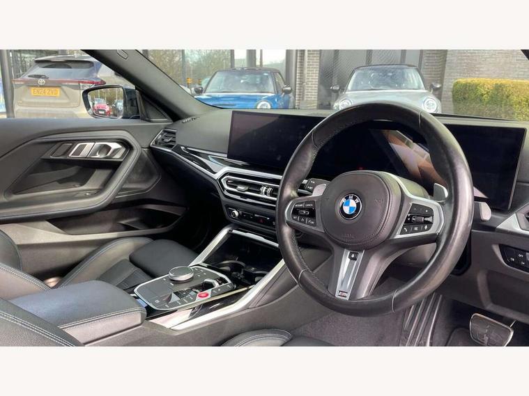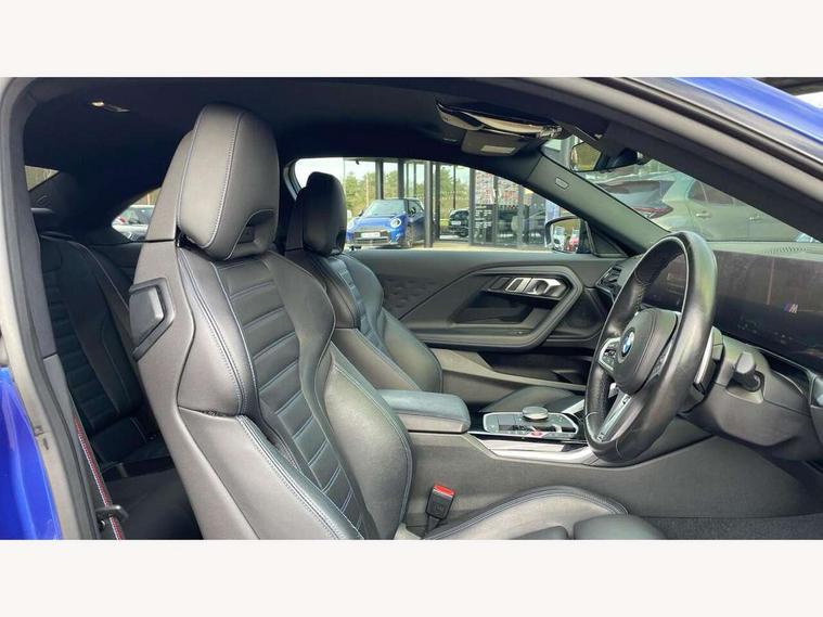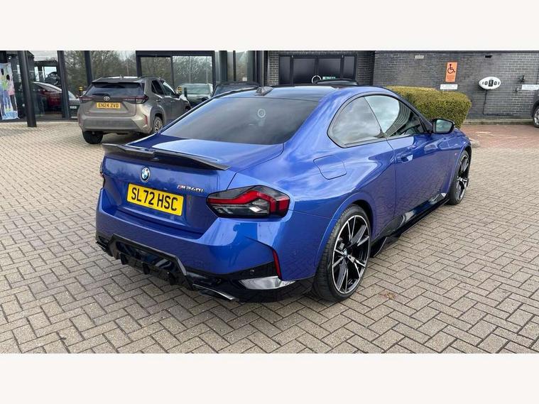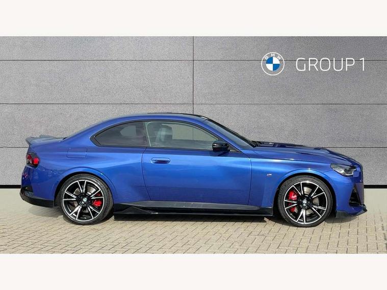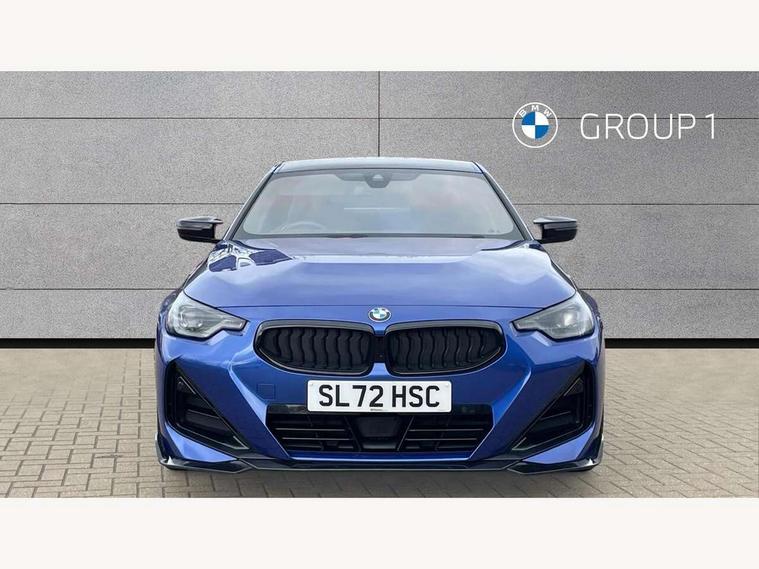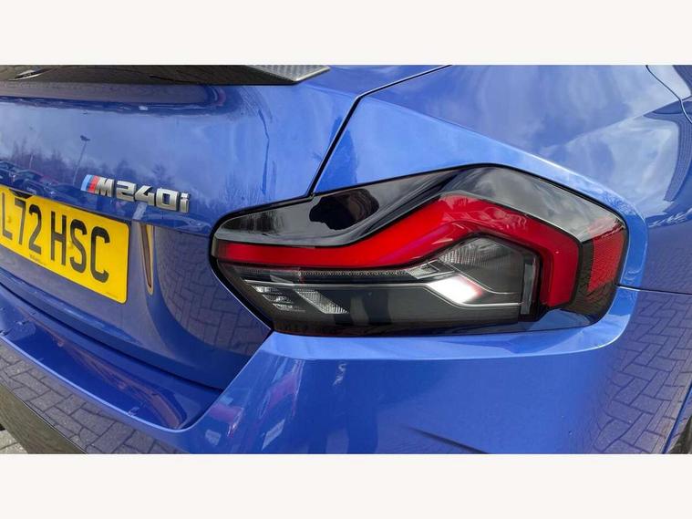 Attentiveness assist, Auto start-stop, Bluetooth, BMW ConnectedDrive online services, BMW Teleservices, Check Control warning system for monitoring of lights and door/luggage compartment open warning, Direct selection buttons, Drive off assistant, Driving experience switch with sport+ mode, Eco pro mode, Electric power steering, Front and rear parking sensors, Front/rear Parking distance control, iDrive controller with turn and press function, Integrated owners handbook, Intelligent functions, Live cockpit plus with nav function 12.3" instrument cluster and 14.9" centre display, Oil sensor for level and grade, Optimum shift indicator, Personal Profile, Touch operation on control display, Variable sport steering, Widescreen multi-media display, Aluminium lightweight construction, Balancer shaft, BMW TwinPower Turbo inline 6-cylinder petrol engine, Double VANOS, Drive performance control with ECO PRO comfort + sport mode, High precision injection, M Sport differential, Petrol Particulate Filter, Sport automatic steptronic transmission with gearshift paddles, manual gearshift time display, launch control, coasting idle ECO PRO/COMFORT modes, Twin scroll turbocharger with Valvetronic, xDrive with rear orientated application, DAB tuner, Acoustic windscreen wipers for reduced driving noise, Adaptive LED Headlights, Automatic windscreen wipers and automatic headlight, Automatically dimming rear view mirror, BMW individual lights shadow line, Body colour door handles flush with door surface, Body colour front and rear bumpers, Daytime running lights, Electric windows - front and rear, with open/close fingertip control and trap release, Exhaust tailpipes x2 - free form finisher in high gloss black in left and right, Exterior air inlets in front bumper with embellishers in high gloss black, Fading support, Flap controlled M Sport exhaust system, Front and rear bumper system with replaceable deformation elements, Front door sill finishers in black plastic with BMW designation, Front ornamental grille frame in high gloss black, Front windscreen wipers with integrated washer jets, Green tinted heat protection glazing, High beam assistant, High gloss black exterior M mirror caps, High gloss shadowline exterior trim in mirror triangle cover, mirror cover panel, mirror bezel and window border, High level third brake light, Indicators integrated int mirror housing, LED registration plate light, LED technology rear tail lights, brake lights and turn indicators, Lightweight engineering, M Sport spoiler - Gurney in body colour, Model designation and M badges in cerium grey, Model designation on right side of tailgate, Rear boot, Rear fog lights, Reversing light in rear light cluster, Shark fin antenna, Side frame decorative moulding black high gloss, Single part LED rear lights with smoked glass components, Sun protection glass, Trailer stabilisation logic, Visible VIN plate, xDrive designation on left tailgate, 12V power socket in front centre console with blanking plug, 2 cupholders in front centre console, 3 zone automatic air conditioning, Ambient lighting, Compartment in front of cupholder, Conditioned based service, Driver seat backrest width adjustment, Electric front seat adjustment with driver memory, Front and rear side armrests integrated into door trim, Front armrest, Front door pockets, Front head restraints, Front M Sport seats, Front passenger seat lumbar support, Heated front seats, Illuminated glove compartment with separate small compartment, Lumbar support for driver, M headliner Anthracite, M sport leather steering wheel, M240i badge in instrument cluster, Manually adjustment steering wheel column, Rear seat backrest with manual 40:20:40 split folding, Rear seat centre foldable armrest with integrated cup holder, Single front passenger seat, Storage compartment between rear seats, Storage tray and compartment with cover in centre console, Sun visors with vanity mirrors and insert tab, Through loading system with 40/20/40 split folding 2 rear seat in 2nd row, Two folding rear seat headrests, Velour floor mats, Vernasca leather upholstery, Additional storage compartment pack without USB - 2 Series Coupe, Connected pack professional - 2 Series Coupe, Interior and exterior mirror pack - 2 Series Coupe, M Sport exterior styling aerodynamics pack - 2 Series Coupe M240i, 2 tone horn, Anti lock braking system (ABS) with cornering brake control, Automatic Stability Control (ASC), BMW emergency call, Brake drying, Child seat ISOFIX attachment for the two outer rear seats, Crash sensor activating of airbags, Unlocking doors, hazard warning lights, fuel cut off, interior lighting+activation of safety battery terminal clamp, Deactivation of fuel pump in the event of a crash, Driver and front passenger airbags, Driver and front passenger side airbags, integrated in the door side seat backrest bolsters for all seat variants, Dynamic brake control, Dynamic stability control + (DSC+), Dynamic Traction Control - DTC, Electrically operated hand brake including automatic hold function and automatic release when driving off, Front and rear disc brakes, Front passenger airbag deactivation, Head airbags for all 4 outer seats, M seat belts, M Sport brake with red calipers, Manual deactivation of front passenger airbag, Seat belt security check for driver and front passenger, Seatbelt warning, Side impact protection, Three point seat belts on 4 seats including front belt stopper, pyrotechnic belt tensioners and belt force limiters, Tyre pressure sensor, Warning triangle and first aid kit, Alarm system (Thatcham 1) with remote control and electronic engine immobiliser, Central locking switch for all doors, fuel filler cap and luggage compartment, Deadlocking function system to all doors, Drive away locking system on all doors and luggage compartment, Locking wheel bolts, Start/Stop button (illuminated) in centre console with keyless engine start and Auto Start-Stop deactivation button, Two remote control key with