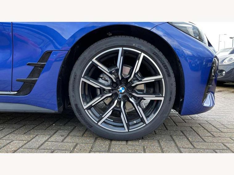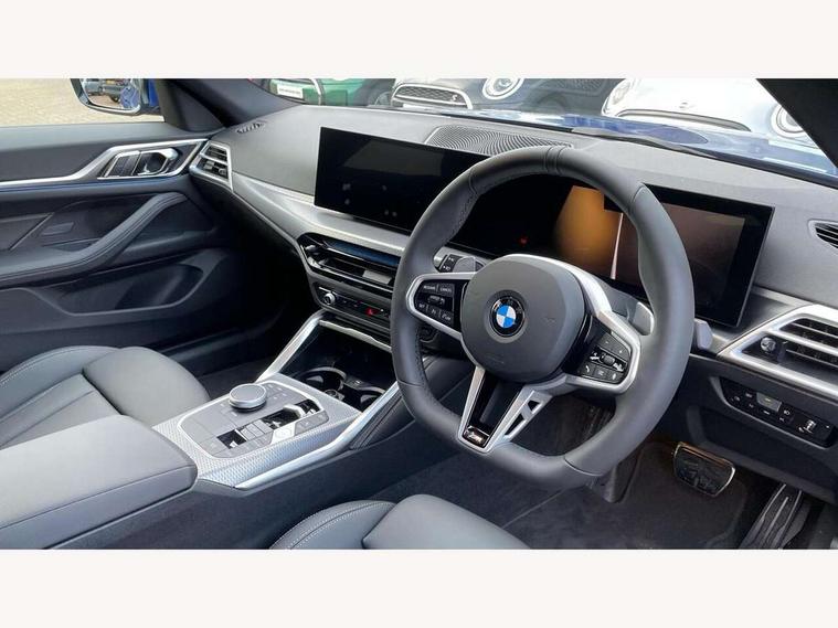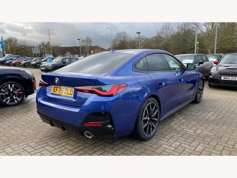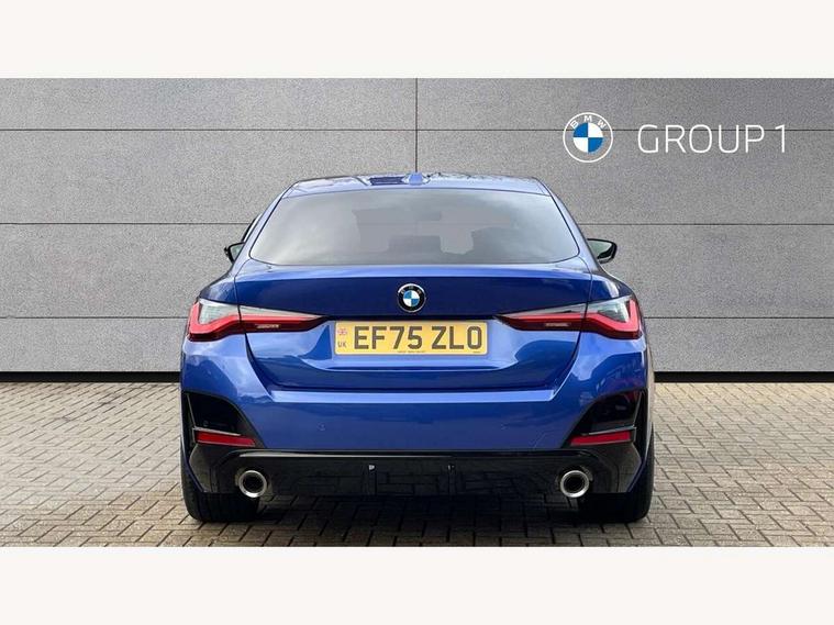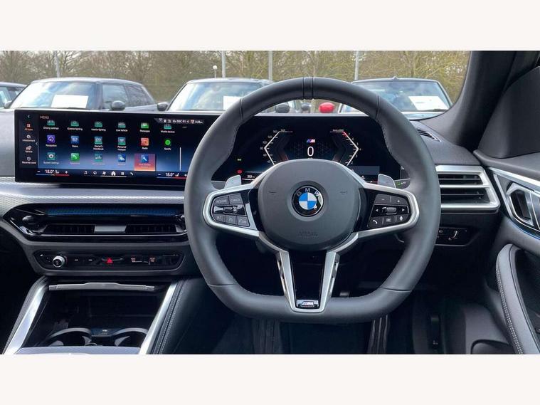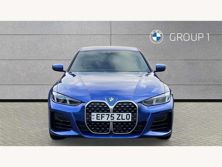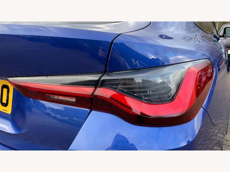 Active guard plus, Attentiveness assist, Automatic start/stop function, BMW ConnectedDrive online services, BMW iDrive controller on centre console, BMW service history, BMW Teleservices, Brake pad wear indicator in front and rear, Check Control warning system for monitoring of lights and door/luggage compartment open warning, Condition based service, Electric bootlid, Instrument cluster with speedometer with mph readout, tachometer, fuel gauge and oil temperature gauge, Integrated owners handbook, Language version English, Oil sensor for level and grade, On board computer - average speed, fuel consumption, outside temp display with acoustic warning, clock/date, service interval, odometer/trip meter, Run flat indicator, Shifting point display, Variable sport steering, 8 speed automatic steptronic transmission with gearshift paddles, Balanced 50/50 weight distribution, Double joint spring strut front axle, Drive experience mode switch - Comfort mode, ECO PRO mode and SPORT mode, Electronic differential lock control (EDLC), Low centre of gravity, Petrol Particulate Filter, Stroke dependent dampers, DAB tuner, Personal eSim, Acoustic glazing, Automatic headlight beam throw control with load dependent regulating reaction, dynamic compensation of braking dive and acceleration squat, Automatic windscreen wipers and automatic headlight, BMW radiator grille with mesh grille, end face of the nuggets in aluminium matt and frame in chrome matt, Body colour fuel filler flap, Body colour roof fin, Bonnet and tailgate badge, Electric folding wing mirrors - Driver side electrochromic, auto anti dazzle function & front passenger side auto parking function without anti dazzle, Electric windows - front and rear, with open/close fingertip control, anti trap facility and comfort closing function all round, Follow me home headlights, Front and rear bumper system, Front apron plastic in body colour, Green tinted heat protection glazing, Illuminated bow type door handles in body colour drivers side with door lock, Interior rear view electrochromatic mirror with automatic anti dazzle function, LED 3rd brake light, LED daytime running lights, LED front fog lights, LED front indicators, Licence plate panel integrated into front bumper and tailgate, M designation on front side panels, left and right, M Sport entry door sill strips, One piece front bumper cover including towing eye cover in body colour, Preparation for high beam assistant, Rear side wing doors, Rear wiper, Reversing light, Side frame trim strip black matt, Two part LED tailights in L-shape with components in smoked glass, brake light, LED turn indicator and rear fog light, Visible exhaust tailpipe finisher, Visible VIN plate, Welcome lights in interior and door handle area, Widened track and increased camber values for max transverse dynamics, agility and steering precision, Windscreen washer jets concealed underneath bonnet, 12V power socket in front centre console, 2 front cupholder in centre console with clamping elements and matt black inlay, 3 rear headrests, 3 seat bench in 2nd row, 3 spoke flat bottom M sport leather multifunction steering wheel, 3 zone automatic air conditioning, 4 pieces lashing eyelets in luggage compartment, 40:20:40 split folding rear seat, folding head restraint of centre seat and rear centre armrest with two cupholders, Anthracite headlining, Armrest integrated in front and rear door trim + front centre console armrest, Battery in luggage compartment, BMW ID, Extended storage - 2x Dual USB Type C 3A charging function in the rear centre console for the rear, Extended storage - Luggage compartment partition net on left side trim panel, Bag hook on both sides of the luggage compartment, Extended storage - Multifunction hook, Extended storage - Trailer tow hitch button in black (extendable trailer tow hitch) on the right hand side, Four grab handles integrated in roof lining, Front and rear door pockets, Front footwell lights, Heated driver and front passenger seats, Height adjustable front headrests, Illuminated armrest storage compartment, Illuminated glove compartment with separate small compartment, Interior light and front reading light, Luggage compartment light, Single front passenger seat, Steering column adjustment - Infinitely variable in height and length, Sunvisors with illuminated vanity mirrors and ticket pocket, Through load system, Toolkit located in luggage compartment, Velour front floor mats, Ambient lighting pack - 4 Series, BMW Live Cockpit Plus pack - 4 Series, Connected professional package - 4 Series, M High gloss shadowline exterior trim pack - 4 Series, M sport exterior styling pack - 4 Series, Park assist pack - 4 Series, 3 point seatbelts on all seats, BMW emergency call, Brake energy regeneration, Braking pre-tensioning, Child locks, Child seat ISOFIX attachment for the two outer rear seats, Crash sensor activating of airbags, Unlocking doors, hazard warning lights, interior light, safety battery terminal, Driver and front passenger side airbags, integrated in the door side seat backrest bolsters for all seat variants, Driver/Front Passenger airbags, Dry braking, Dynamic brake control, Dynamic stability control + (DSC+) - Anti-lock Braking System (ABS) with brake assist and cornering brake control + Automatic Stability Control (ASC), Dynamic Traction Control - DTC, Electric parking brake including automatic hold function and automatic release of the parking brake when driving off, Front and rear ventilated brake disc, Front passenger manual airbag deactivation, Head airbags for all 4 outer seats, Hill start assistant, Seat belt security check for driver and front passenger, Seat belt with belt stopper, pyrotechnic belt tensioners and belt force limiters, Seat occupancy detection for driver and passenger side, Side impact protection, Tyre pressure sensors, Warning triangle and first aid kit, Alarm system for monitoring doors, engine compartment, interior movement sensor, tilt sensor and siren w