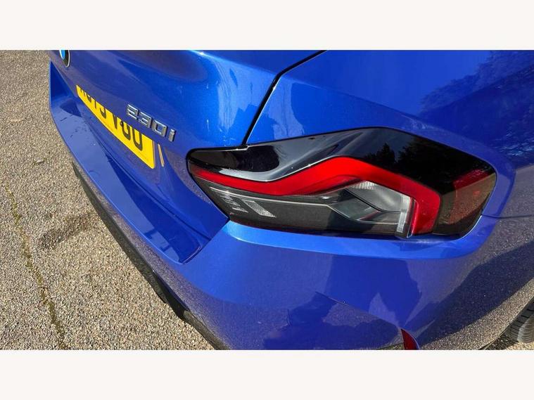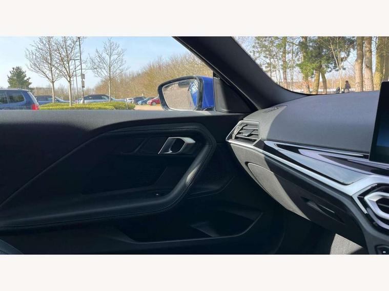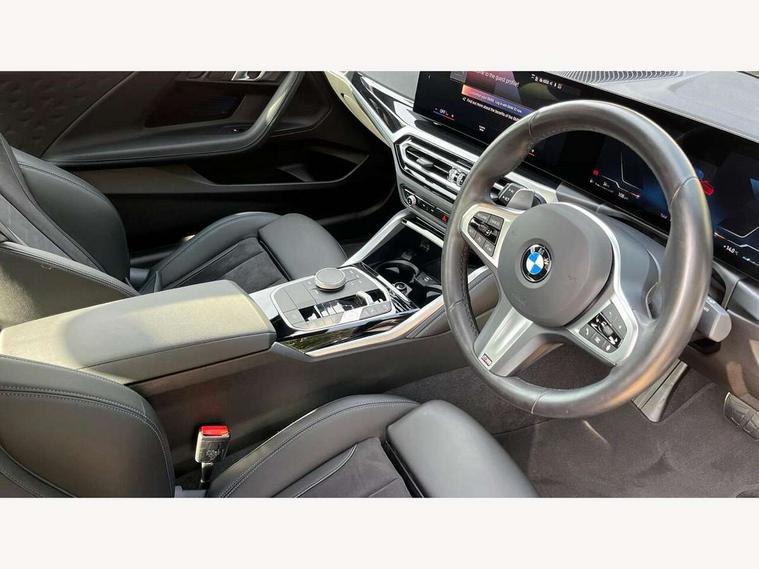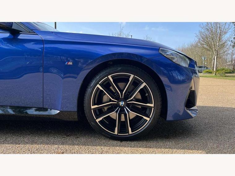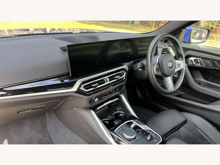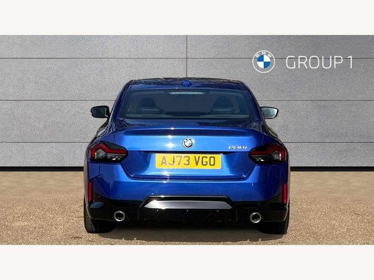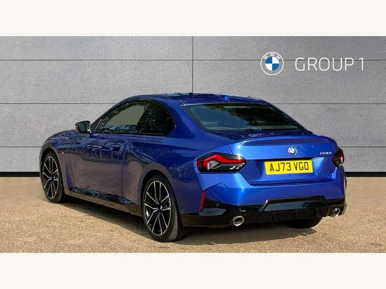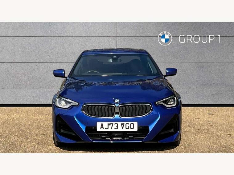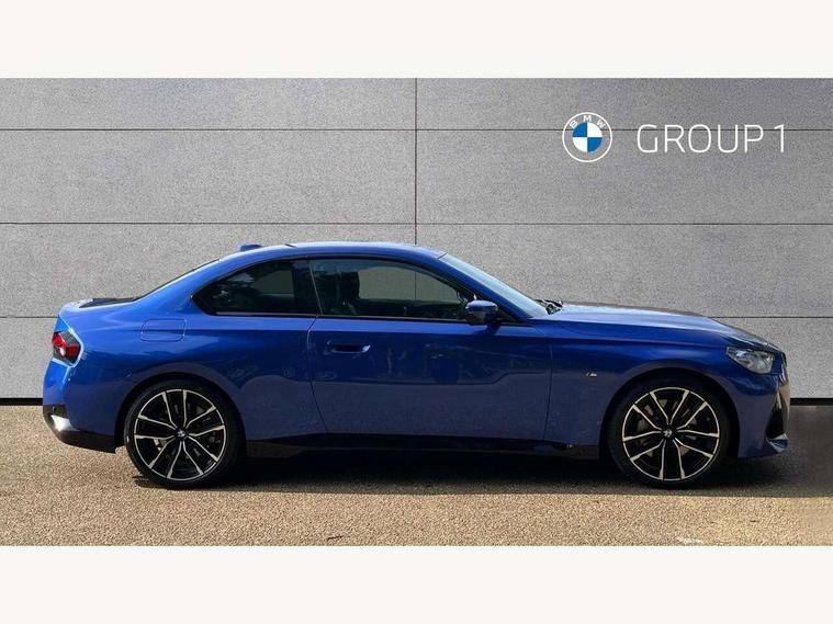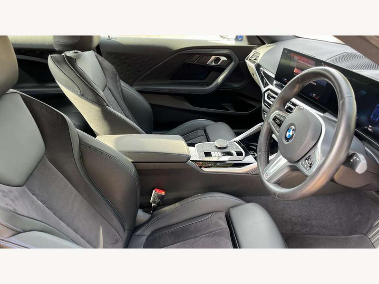 2 USB connections for charging and transferring data, 4G LTE connectivity with hard wired 4G network sim card, Attentiveness assist, Bluetooth with USB, BMW ConnectedDrive online services, BMW Intelligent Personal Assistant, BMW operating system 8 with variable, configurable widgets display information in real time, BMW Teleservices, Check Control warning system for monitoring of lights and door/luggage compartment open warning, Direct selection buttons, Drive off assistant, Eco pro mode, Electric power steering, Front and rear parking sensors, Front/rear Parking distance control, iDrive controller with turn and press function, Integrated owners handbook, Intelligent functions, Live cockpit plus with nav function 12.3" instrument cluster and 14.9" centre display, Oil sensor for level and grade, Optimum shift indicator, Personal Profile, Touch operation on control display, Variable sport steering, Widescreen multi-media display, WiFi interface for wireless connection of mobile terminal devices, Aluminium lightweight construction, Balancer shaft, BMW TwinPower Turbo four-cylinder petrol engine, Double VANOS, Drive performance control with ECO PRO comfort + sport mode, Electronic differential lock, High precision injection, M sport suspension, Petrol Particulate Filter, Sport automatic steptronic transmission with gearshift paddles, manual gearshift time display, launch control, coasting idle ECO PRO/COMFORT modes, Twin scroll turbocharger with Valvetronic, DAB tuner, Acoustic windscreen wipers for reduced driving noise, Adaptive LED Headlights, Automatic windscreen wipers and automatic headlight, Automatically dimming rear view mirror, Body colour door handles flush with door surface, Body colour door mirrors, Body colour front and rear bumpers, Daytime running lights, Electric windows - front and rear, with open/close fingertip control and trap release, Exhaust tailpipes x2 - 90mm in left and right, Fading support, Front and rear bumper system with replaceable deformation elements, Front door sill finishers in black plastic with BMW designation, Front windscreen wipers with integrated washer jets, Green tinted heat protection glazing, High beam assistant, High gloss black sill, bumper trim sides and diffuser insert, High gloss shadowline exterior trim in mirror triangle cover, mirror cover panel, mirror bezel and window border, High level third brake light, Indicators integrated int mirror housing, LED registration plate light, LED technology rear tail lights, brake lights and turn indicators, Lightweight engineering, Model designation on right side of tailgate, One piece kidney grille with hight gloss chrome surround, Rear boot, Rear fog lights, Reversing light in rear light cluster, Shark fin antenna, Single part LED rear lights with smoked glass components, Trailer stabilisation logic, Visible VIN plate, 12V power socket in front centre console with blanking plug, 2 cupholders in front centre console, 2 zone automatic air conditioning, Ambient lighting, Compartment in front of cupholder, Conditioned based service, Driver seat backrest width adjustment, Front and rear side armrests integrated into door trim, Front armrest, Front door pockets, Front head restraints, Front sport seats, Heated front seats, Illuminated glove compartment with separate small compartment, M headliner Anthracite, M sport leather steering wheel, Manually adjustment steering wheel column, Rear seat backrest with manual 40:20:40 split folding, Rear seat centre foldable armrest with integrated cup holder, Single front passenger seat, Storage compartment between rear seats, Storage tray and compartment with cover in centre console, Sun visors with vanity mirrors and insert tab, Through loading system with 40/20/40 split folding 2 rear seat in 2nd row, Two folding rear seat headrests, Velour floor mats, Additional storage compartment pack without USB - 2 Series Coupe, Connected pack professional - 2 Series Coupe, Interior and exterior mirror pack - 2 Series Coupe, M Sport exterior styling aerodynamics pack - 2 Series Coupe, 2 tone horn, Anti lock braking system (ABS) with cornering brake control, Automatic Stability Control (ASC), BMW emergency call, Brake drying, Child seat ISOFIX attachment for the two outer rear seats, Crash sensor activating of airbags, Unlocking doors, hazard warning lights, interior light, safety battery terminal, Deactivation of fuel pump in the event of a crash, Driver and front passenger airbags, Driver and front passenger side airbags, integrated in the door side seat backrest bolsters for all seat variants, Dynamic brake control, Dynamic stability control + (DSC+), Dynamic Traction Control - DTC, Electrically operated hand brake including automatic hold function and automatic release when driving off, Front and rear disc brakes, Head airbags for all 4 outer seats, Manual deactivation of front passenger airbag, Seat belt security check for driver and front passenger, Seatbelt warning, Side impact protection, Three point seat belts on 4 seats including front belt stopper, pyrotechnic belt tensioners and belt force limiters, Tyre pressure sensor, Warning triangle and first aid kit, Alarm system (Thatcham 1) with remote control and electronic engine immobiliser, Central locking switch for all doors, fuel filler cap and luggage compartment, Deadlocking function system to all doors, Drive away locking system on all doors and luggage compartment, Locking wheel bolts, Start/Stop button (illuminated) in centre console with keyless engine start and Auto Start-Stop deactivation button, Two remote control key with integrated key - one button for open and close doors/fuel flap/tailgate and separate button for unlock luggage compartment, BMW mobility tyre sealing system, Electrically powered 12V compressor, Reduced rolling resistance tyres,