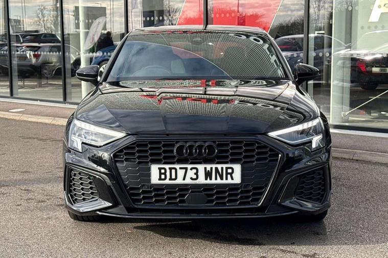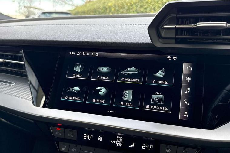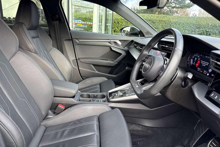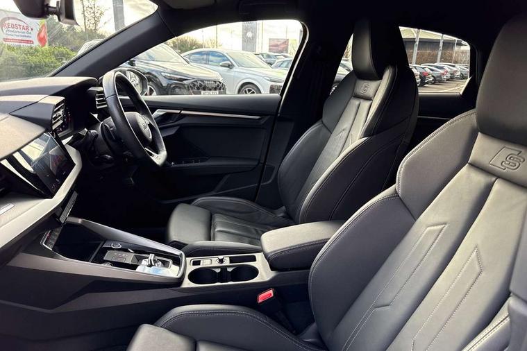 Audi drive select (Auto, Comfort, Dynamic, Efficiency and Individual), Audi smartphone interface, Audi Virtual Cockpit - 10.25" digital and colour instrument cluster, Automatic start/stop system with recuperation, Bluetooth interface, Camera based traffic sign recognition, Collision avoidance assistant, e-Call (emergency call), Electromechanical power speed sensitive steering, Lane departure warning system, MMI Navigation Plus with high resolution 10.1" colour touch screen display, Service indicator, Trip computer, Voice control system with natural language interaction, Sports suspension, 2xUSB-C connection with data and charging functions, 6 passive loudspeakers, CD player, DAB Digital radio, 3rd brake light, Acoustic glass windscreen, Audi beam uses LEDs to project the Audi logo onto the ground as you exit your A3, Auto dimming frameless rear view mirror, Electrically adjustable/heated/folding/auto dimming door mirrors with integrated LED indications + kerb view function for passenger side, Front electric windows, Illuminated door sills with aluminium inserts at the front with S logo, LED daytime running lights, LED headlights with LED rear lights and dynamic rear indicators, Light and rain sensors, Model and engine designation badges at rear, Privacy glass - dark tinted rear window, rear door and side windows, Rear boot, Rear electric windows, Rear side wing doors, S roof spoiler, 12V socket and storage compartment in front centre console, 3 seat bench in 2nd row, 3 spoke flat bottomed leather multifunction sport steering wheel with gear shift paddles, 4 way electrically adjustable lumbar support for driver and front passenger, 60/40 split folding rear seat bench, Black cloth headlining, Dual zone electronic climate control, Front and rear centre armrest in artificial leather, Front and rear headrests, Front/rear floor mats, Height and reach adjustable steering wheel, Interior lighting - glove compartment light and right hand side, Luggage compartment floor covering, Manual boot compartment lid, Single front passenger seat, Stainless steel pedals and front footrest in black, Twin leather upholstery with front sports seats S embossed logo, Aluminium interior elements pack - A3, Black styling pack - A3 Saloon/Black edition, LED interior lighting pack - A3 Saloon, 3x3 point rear seat belts, Driver and front passenger airbag with passenger airbag deactivation, Electronic Stabilisation Control (ESC) including ABS, ASR and EDL, First aid kit with warning triangle and 2 safety vests, Front side airbags with head airbags and interaction airbag, Pre-sense front with pedestrian and cyclist detection, Seatbelt monitoring, Tyre pressure loss indicator, Anti theft alarm, Anti-theft wheel bolts, Electronically operated child locks, Immobiliser, Remote control central locking, Aluminium air vent surrounds, Dark spectrum aluminium inlays, accent surfaces in the dashboard and centre console in platinum grey silk effect paint finish, 19" 5 arm trapezoid design alloy wheels in matt grey with diamond cut finish,